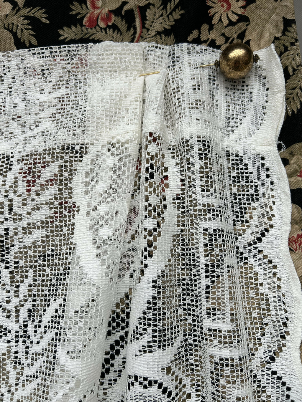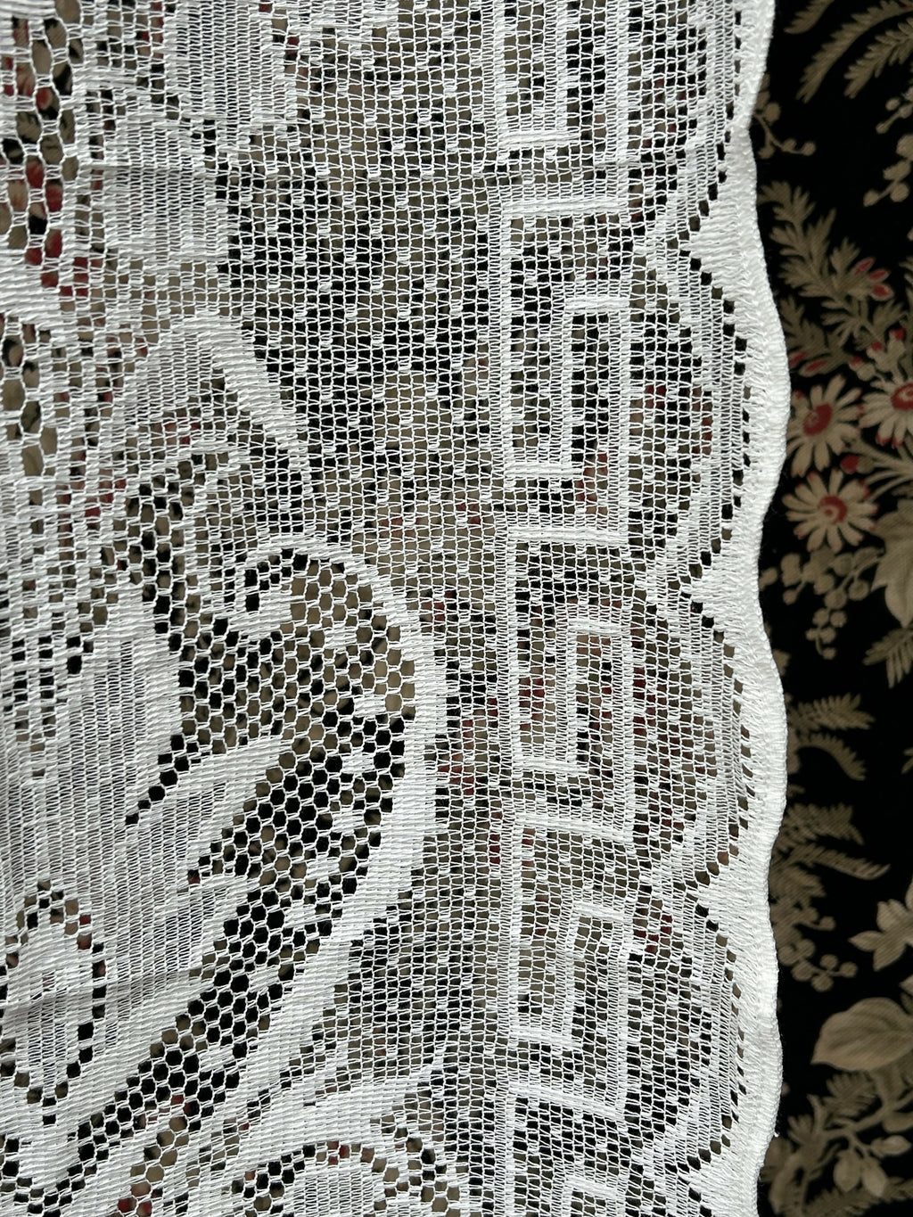 It has a fine cotton weave with delicate scalloped edges to the sides. This is a finished panel