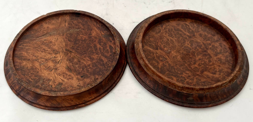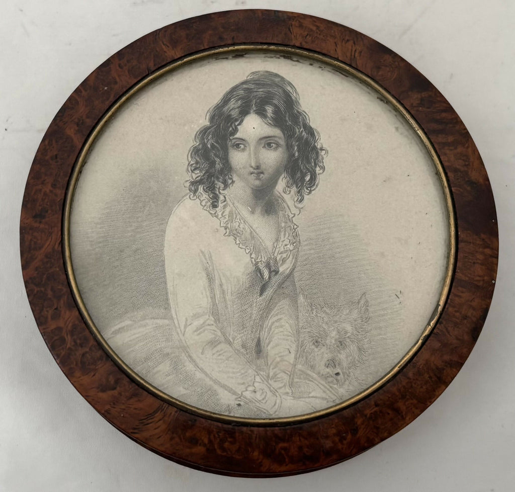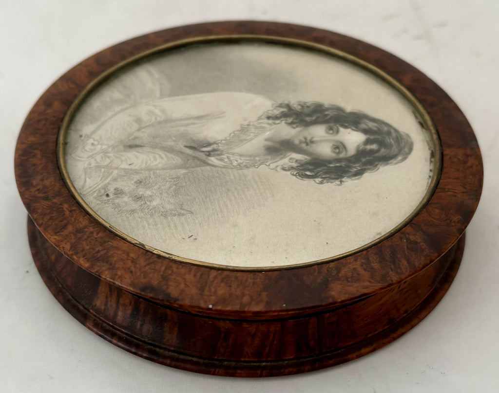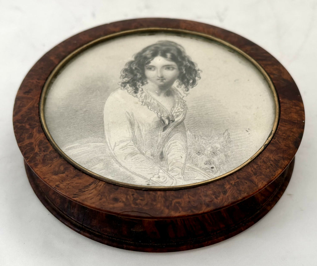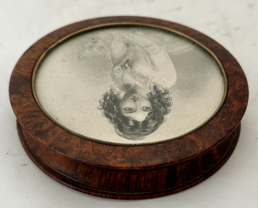 A 19th Century Amboyna Waisted Circular Table Snuff Box, the Glazed Push-Fitting Cover Set with a Monochrome Print of a Young Girl and her Dog, circa 1840.