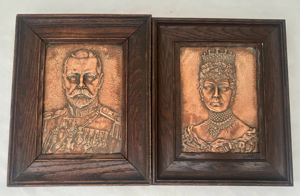 A Pair of Framed Copper Relief Plaques of King George V and Queen Mary.
