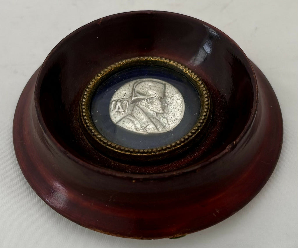 Napoleon Bonaparte, A 19th Century Silver Coloured Portrait Medallion Housed within a Wooden Roundel and Mounted on a Blue Velvet Backing.