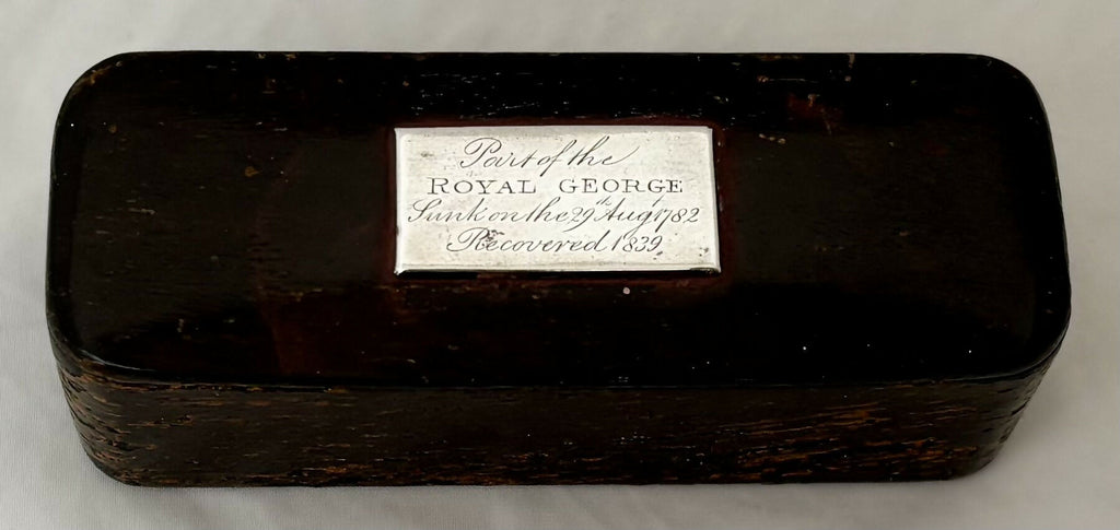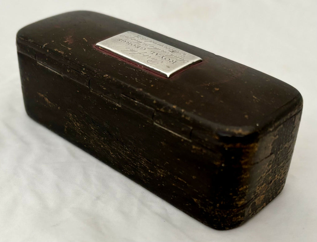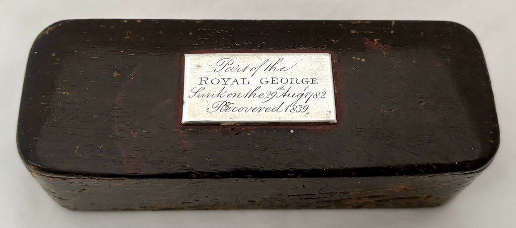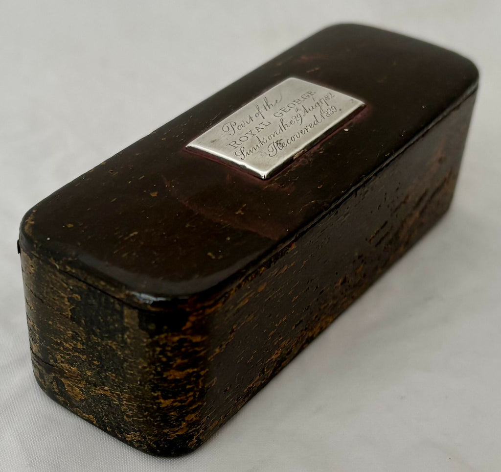 'Part of the ROYAL GEORGE Sunk on the 29th Augt. 1782. Recovered 1839', Lacquered Wooden Snuff Box with White Metal Plaque.