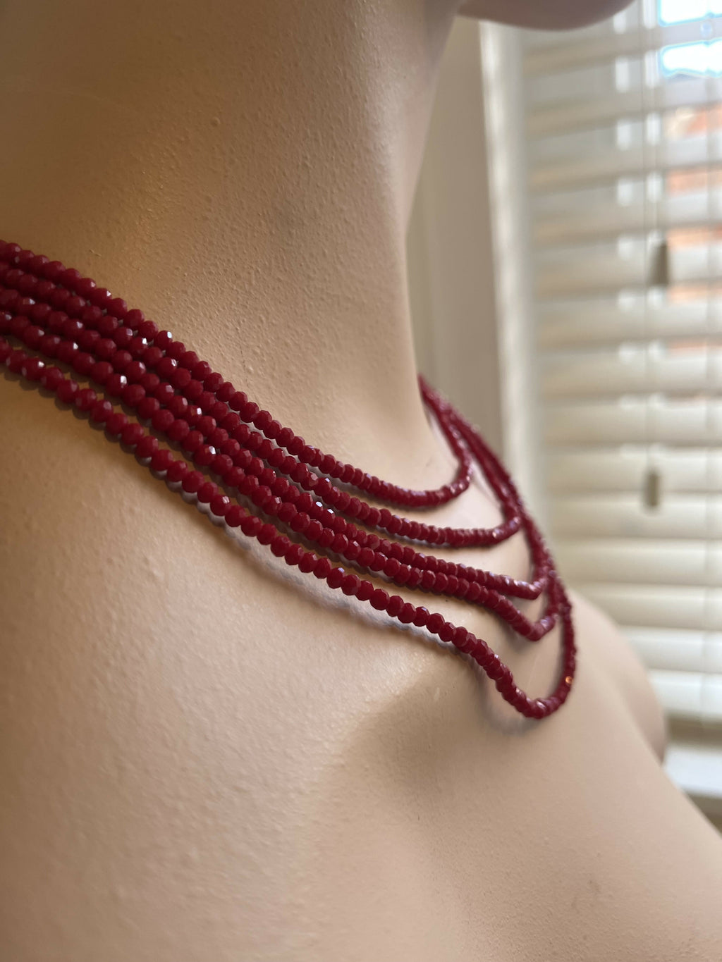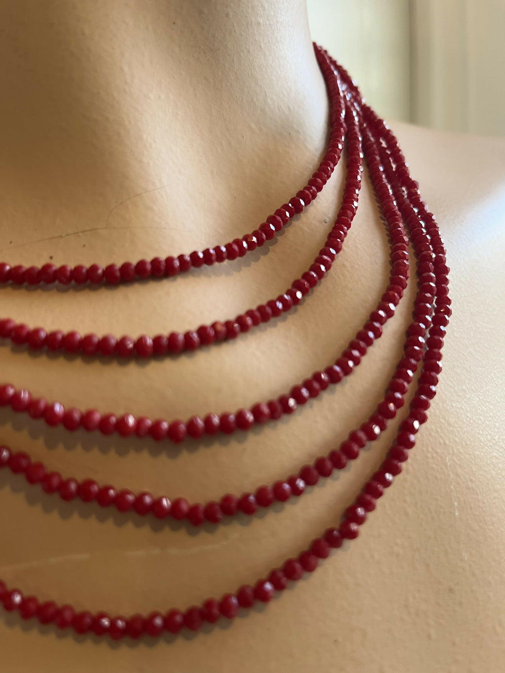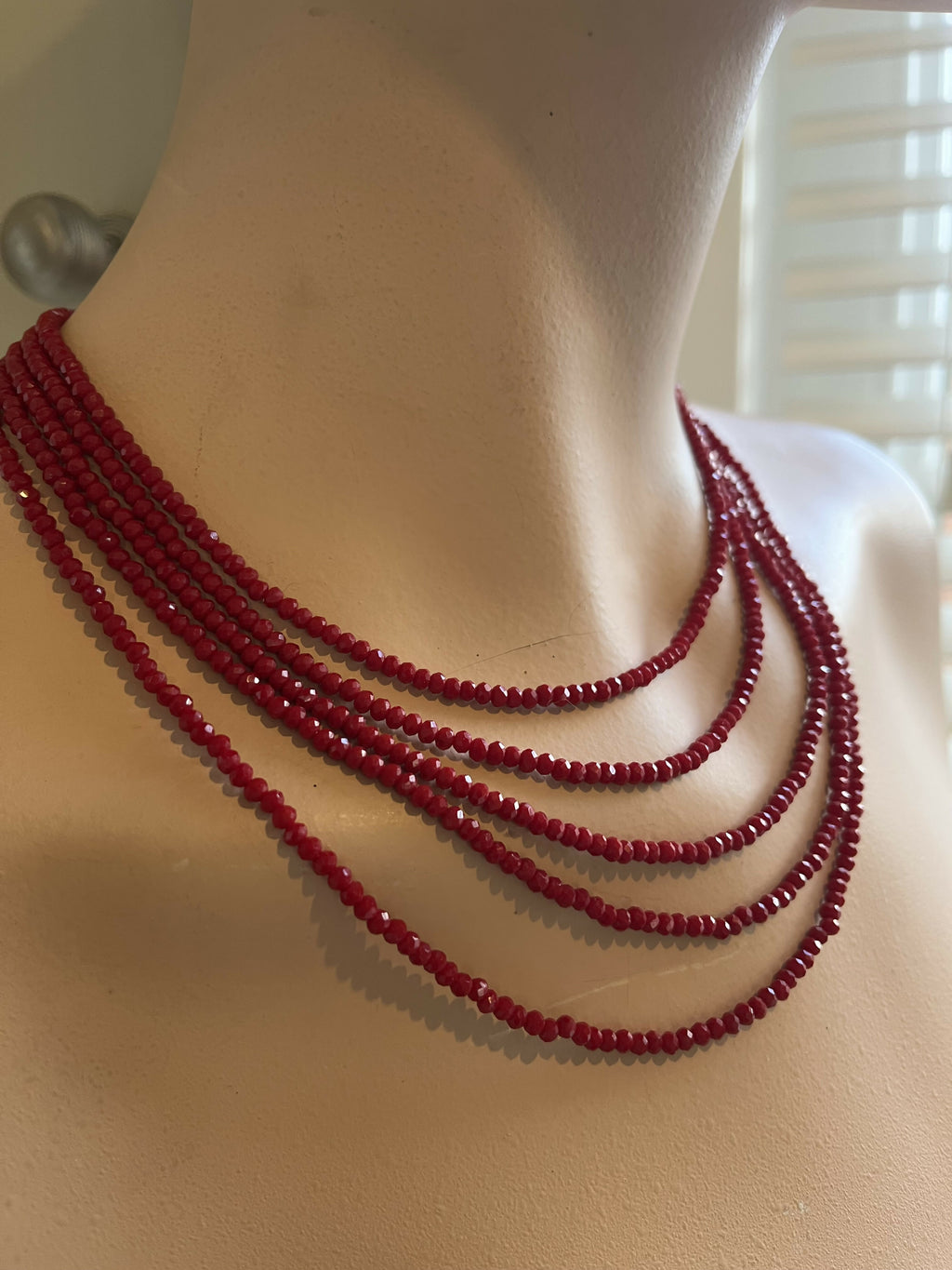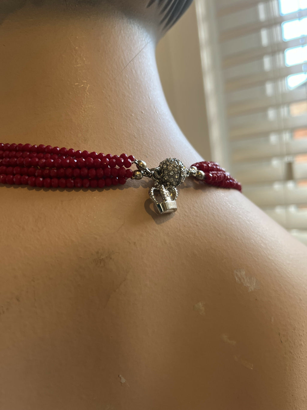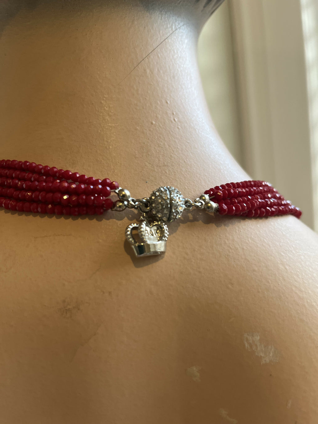 An elegant necklace with five strands of faceted red glass beads which catch the light and twinkle softly. There is a magnetic clasp and a crown charm with a BW logo.