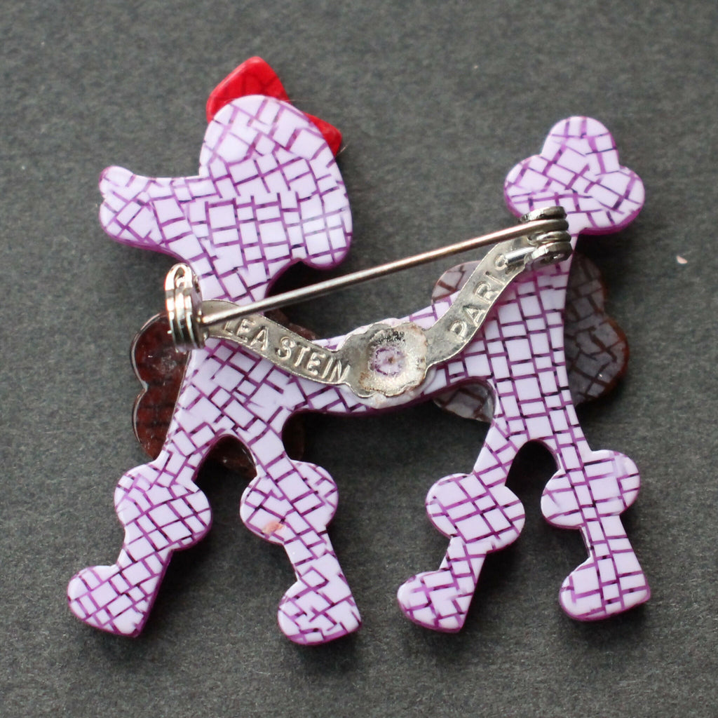 Original Lea Stein purple “Poodle” brooch measuring approximately 40mm wide by 40mm high. The v-shaped brooch pin/mount is stamped “Lea Stein” and “Paris”.