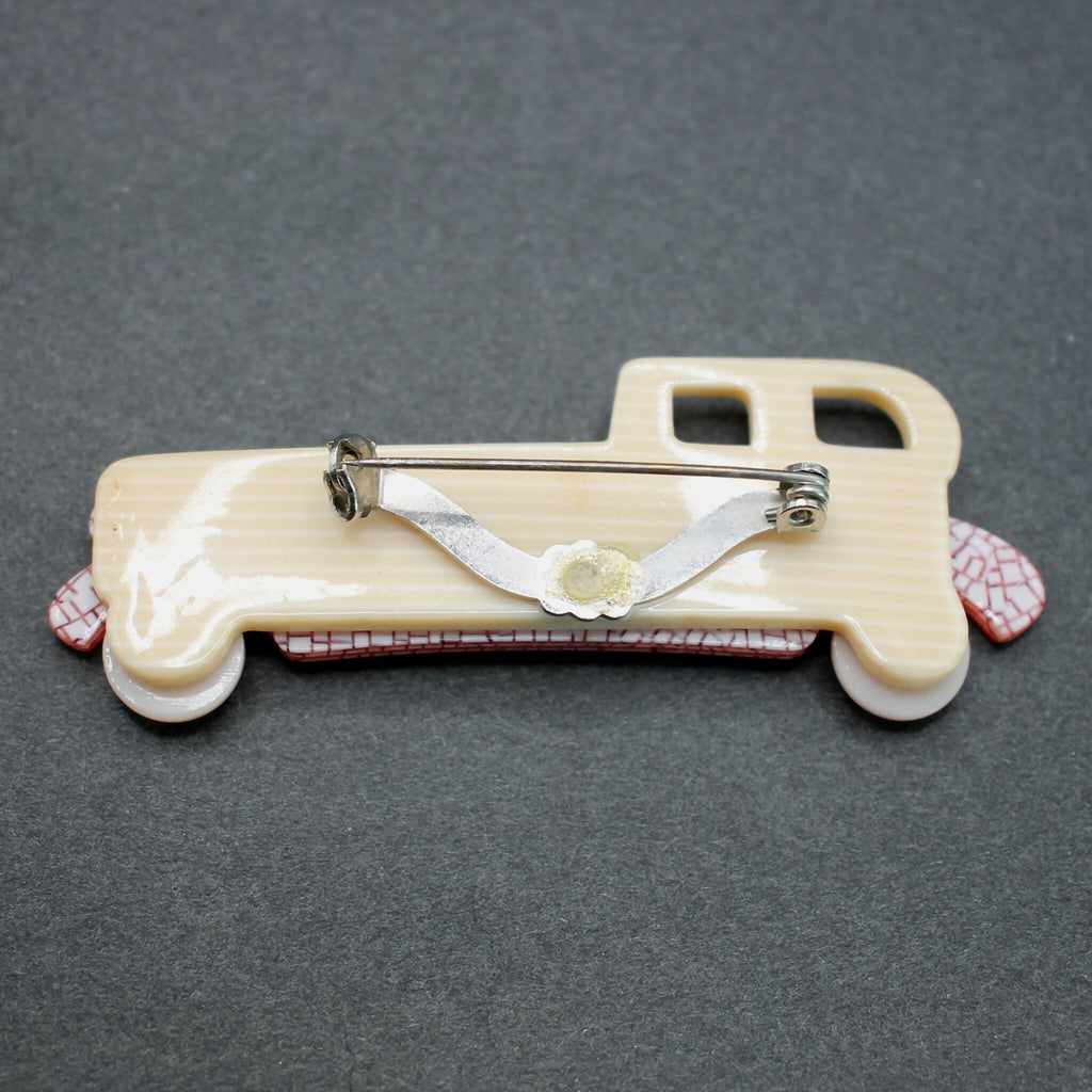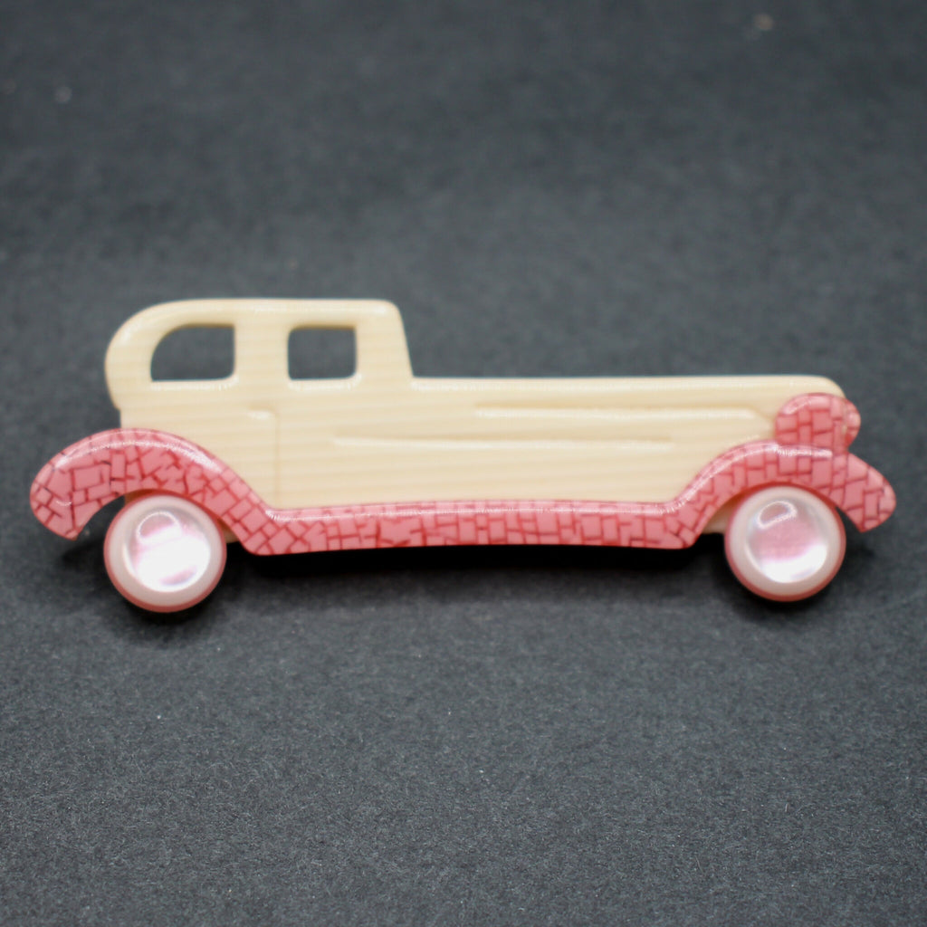 This Lea Stein style limousine brooch measures approximately 70mm wide by 26mm high. The brooch is moulded in shades of pink and ivory, and has round wheels.