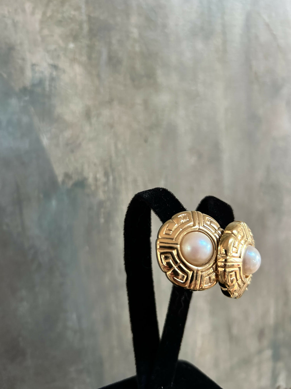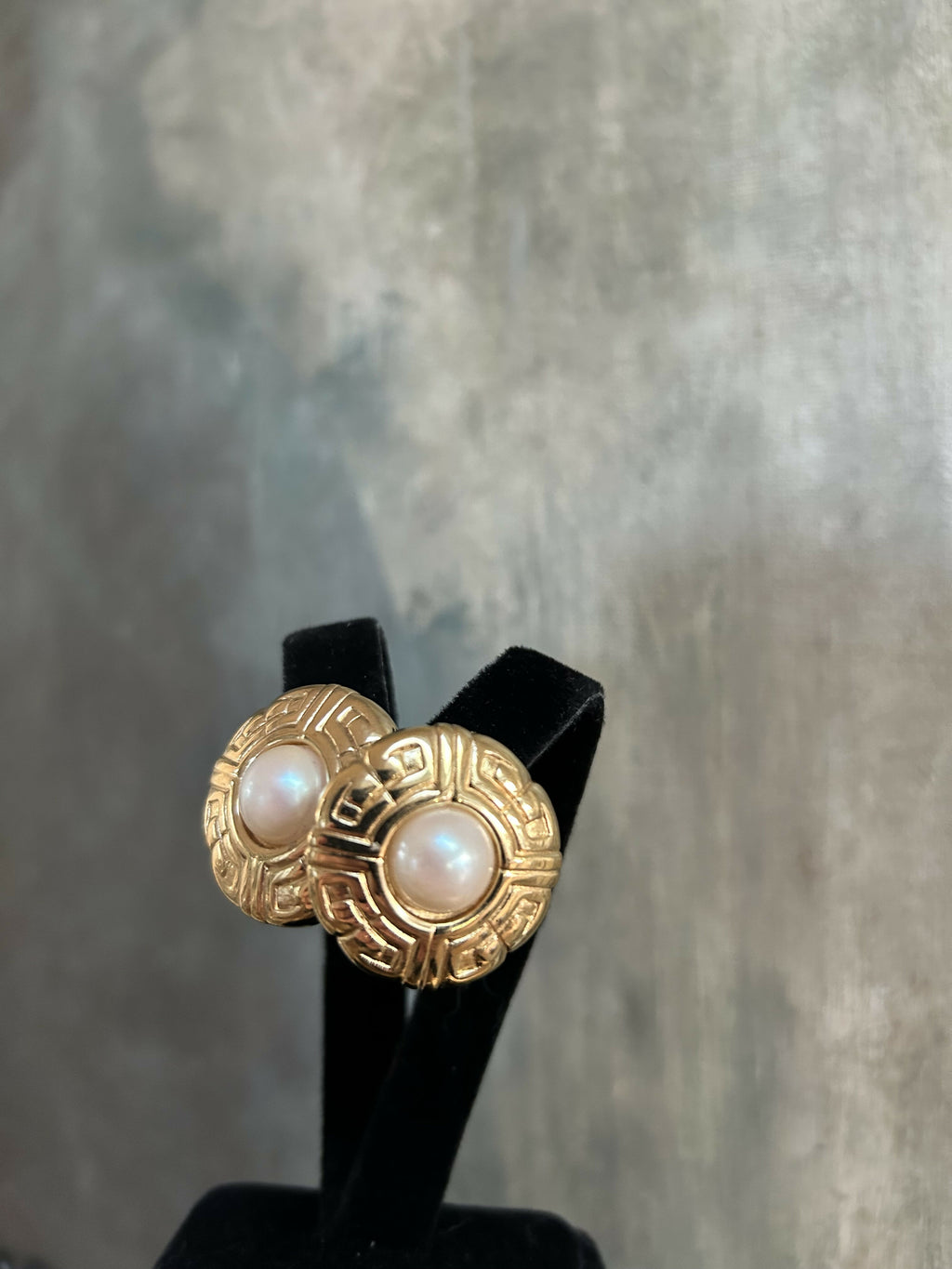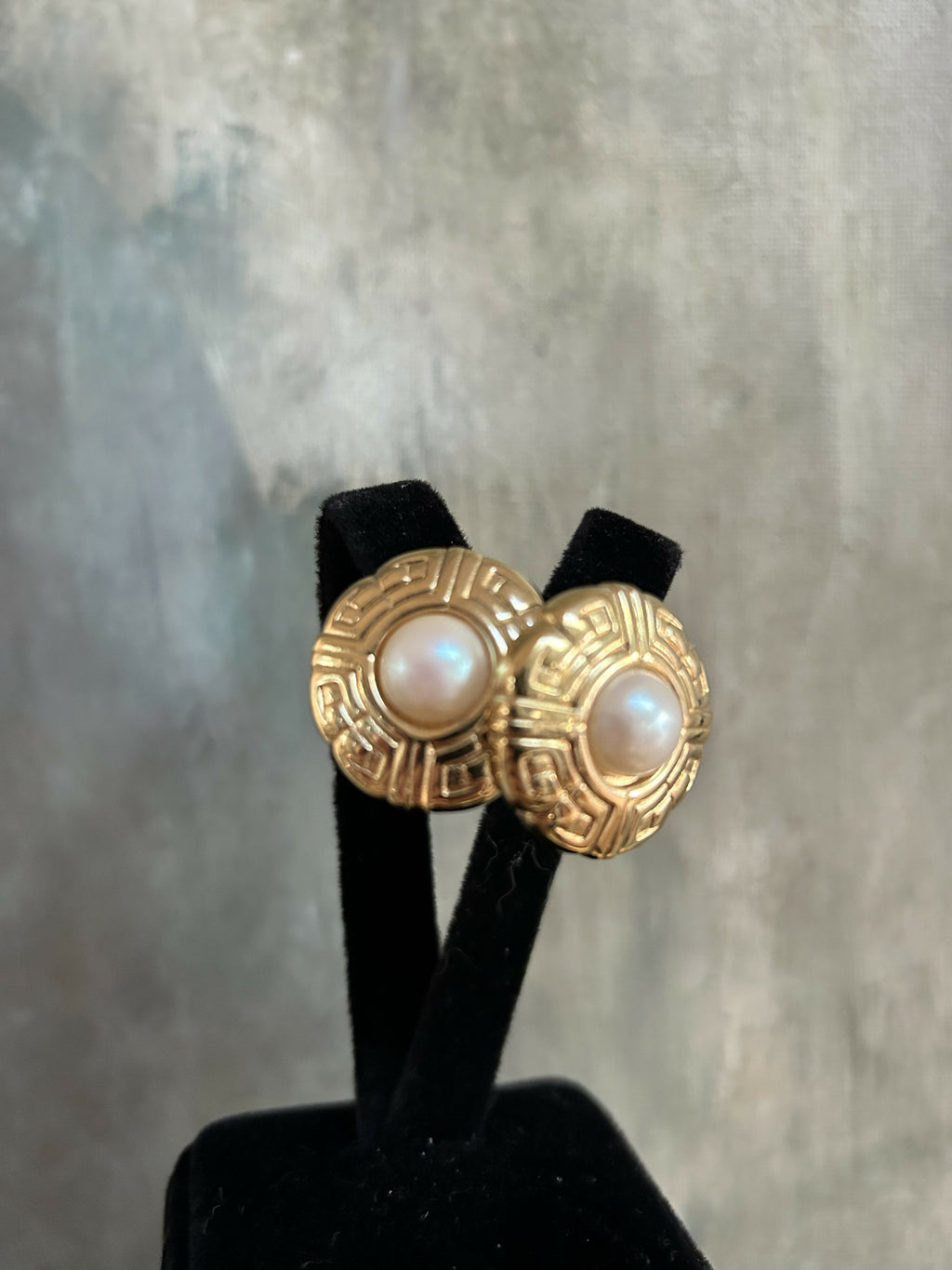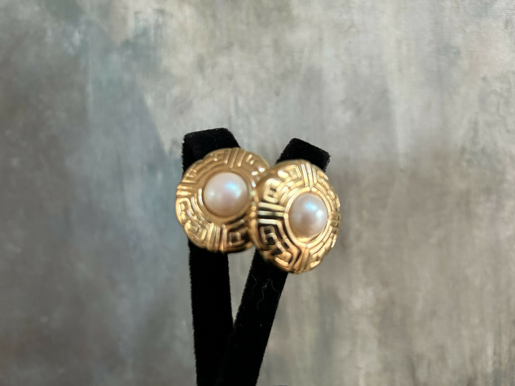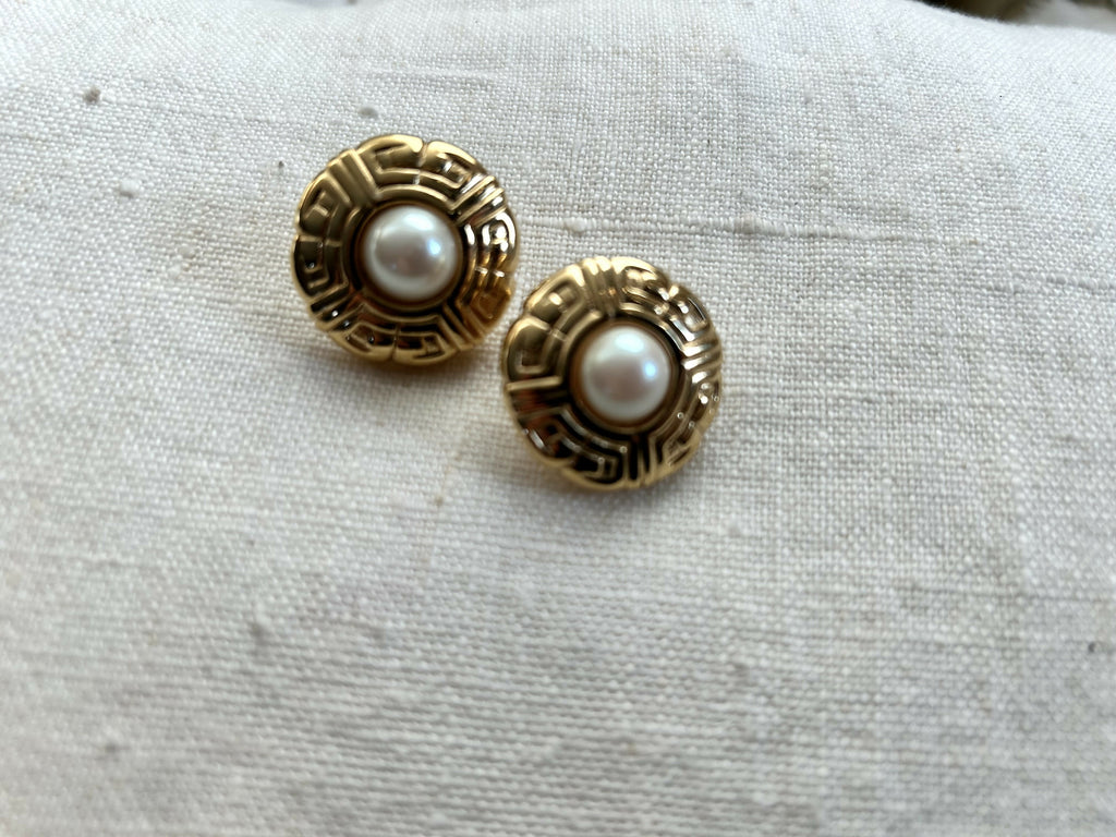 Each earring features a luminous faux pearl centre, framed by a sculptural gold-plate surround with a Greek key–inspired motif, a timeless design that feels both opulent and architectural. The raised detailing and warm gold finish give these earrings a luxurious presence, perfect for both daytime sophistication and evening elegance.