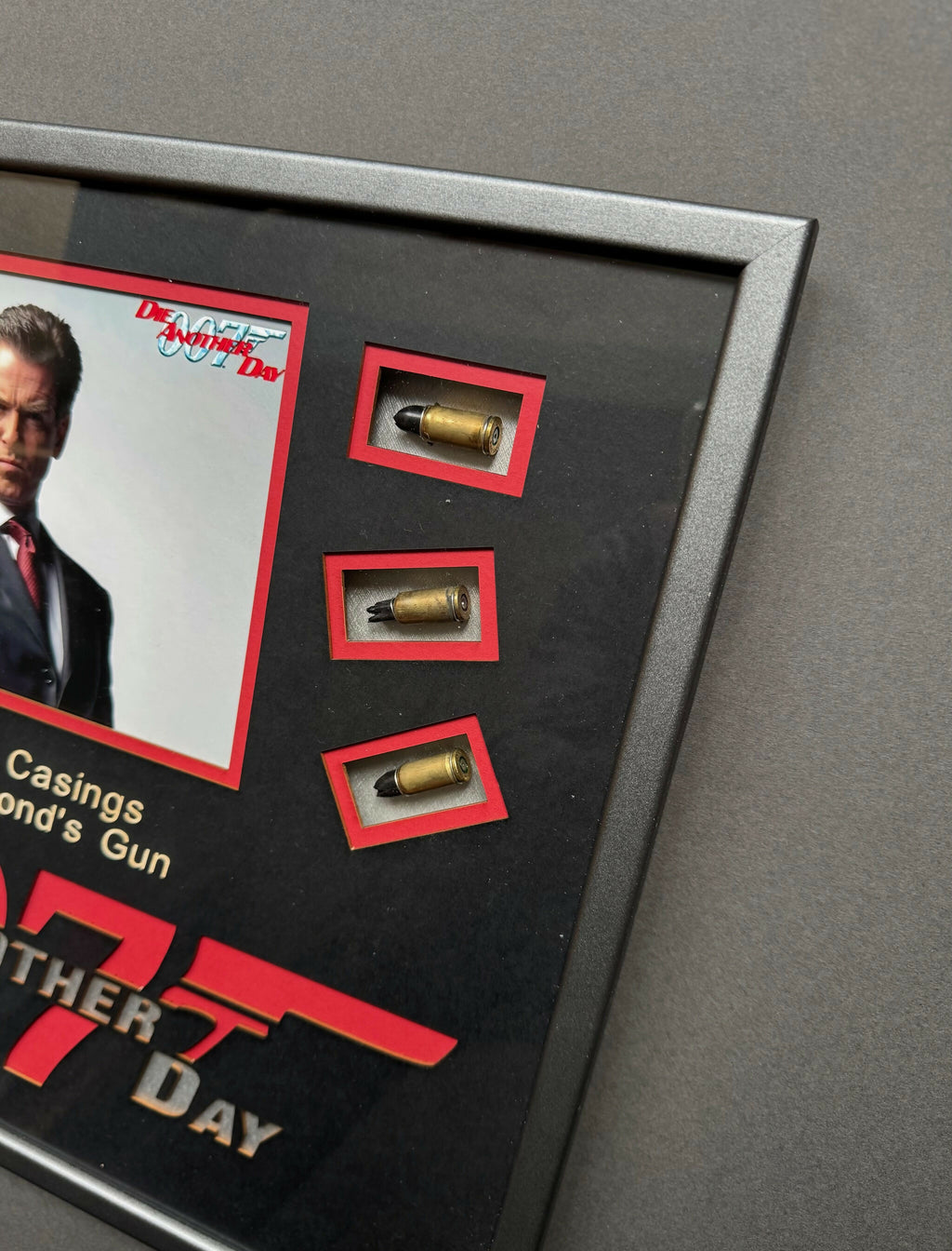 Three (x3) 9mm bullet casings, aka 'PAK' blanks fired from Pierce Brosnan's Walther P99 in Director Lee Tamahori's instalment of the hit Bond Franchise. Mounted inside a black frame (13.5 x 14.5 inches) with a corresponding still of Pierce Brosnan as James Bond & a descriptive laser-cut plaque. Originally obtained from one of the Weapons Coordinators who worked on the Film. Accompanies a Certificate of Authenticity.