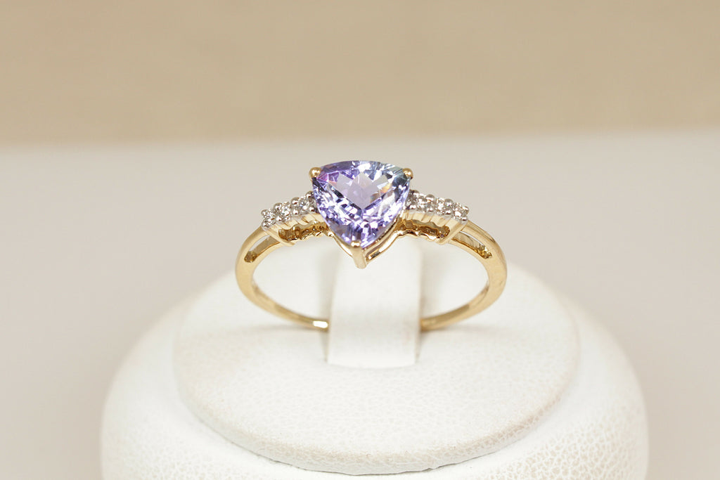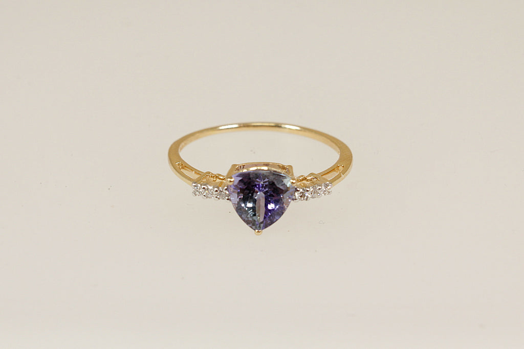 This extremely pretty 14ct Gold ring features a 0.50ct Trillion-cut Tanzanite, beautifully claw set in a stylish basket setting that allows the full gemstone to be admired and enhances its natural brilliance.