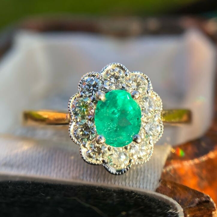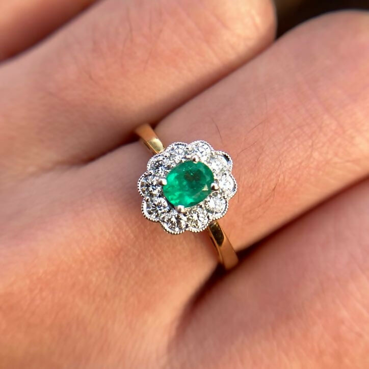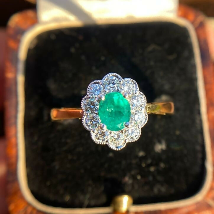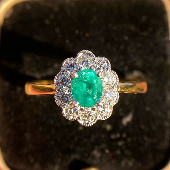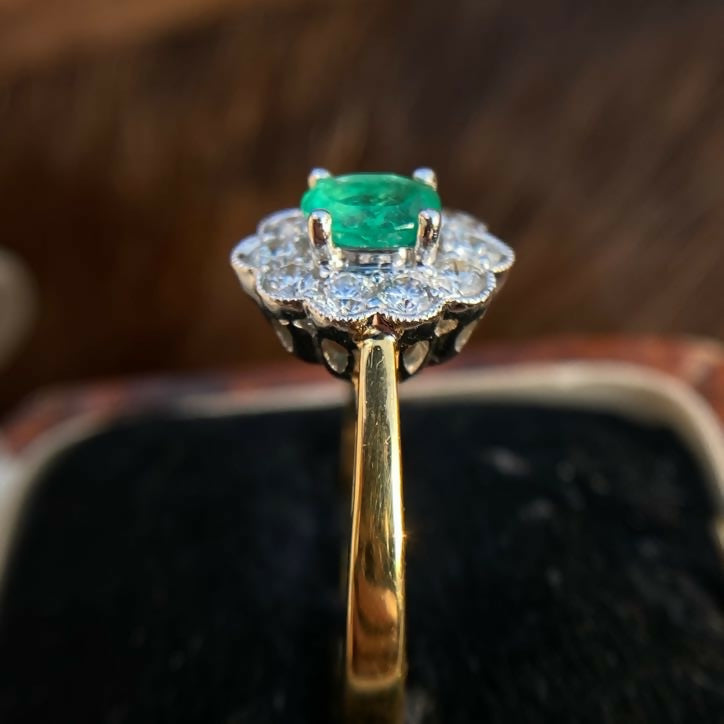 A well-made vintage emerald and diamond cluster ring in 18ct gold. The central oval emerald is particularly fine, exhibiting a vivid bright green hue with fire and clarity—an increasingly hard to find combination in vintage pieces.