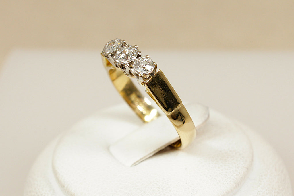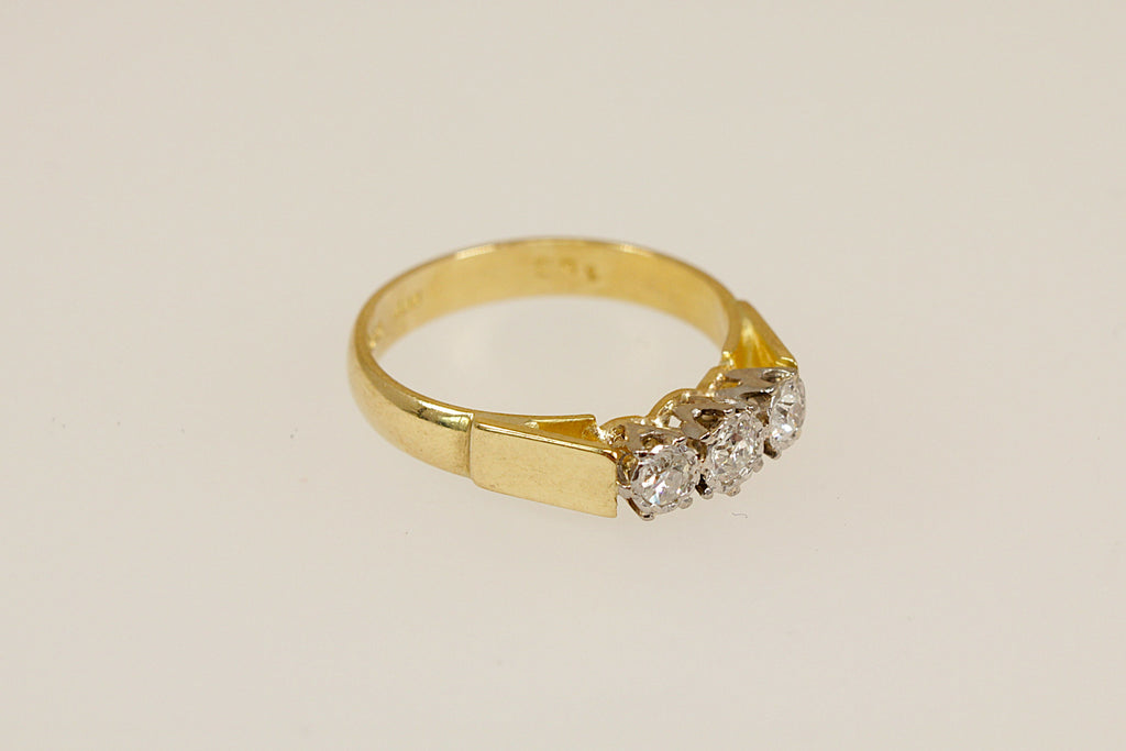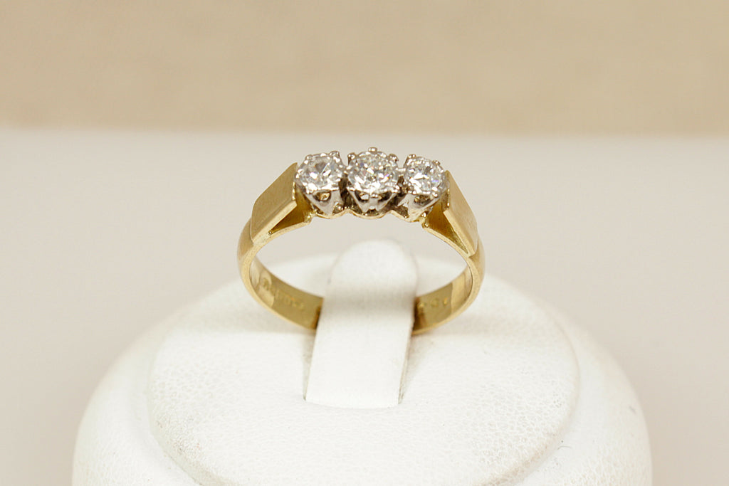 A classic and elegant 18ct Gold trilogy ring set with a total of 0.40ct of sparkling Diamonds. The design features a central diamond of approximately 0.20ct, flanked by two outer diamonds of around 0.10ct each, creating a perfectly balanced and timeless look.