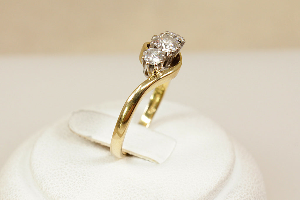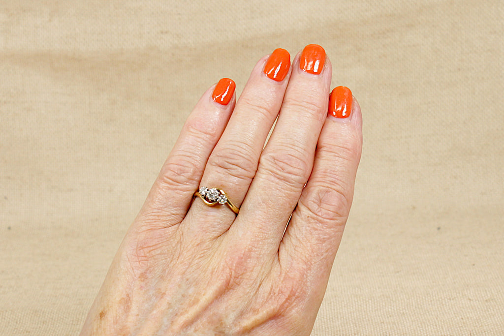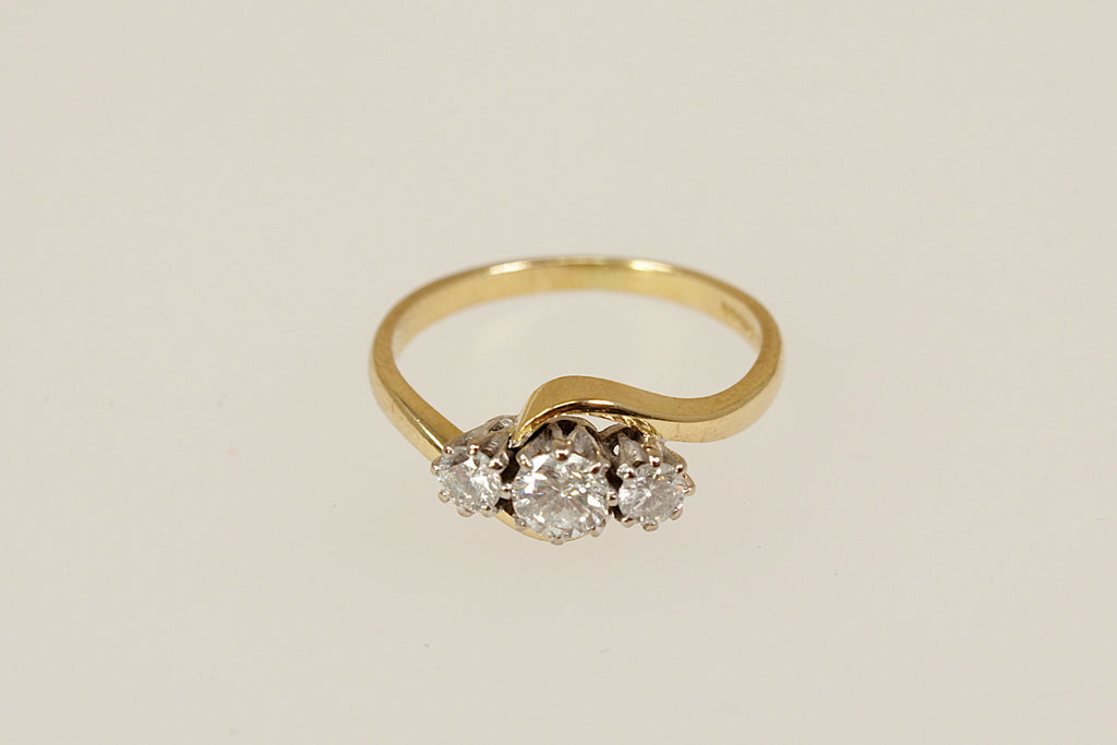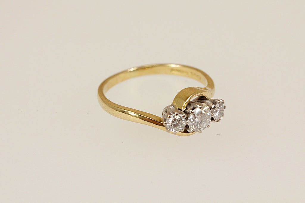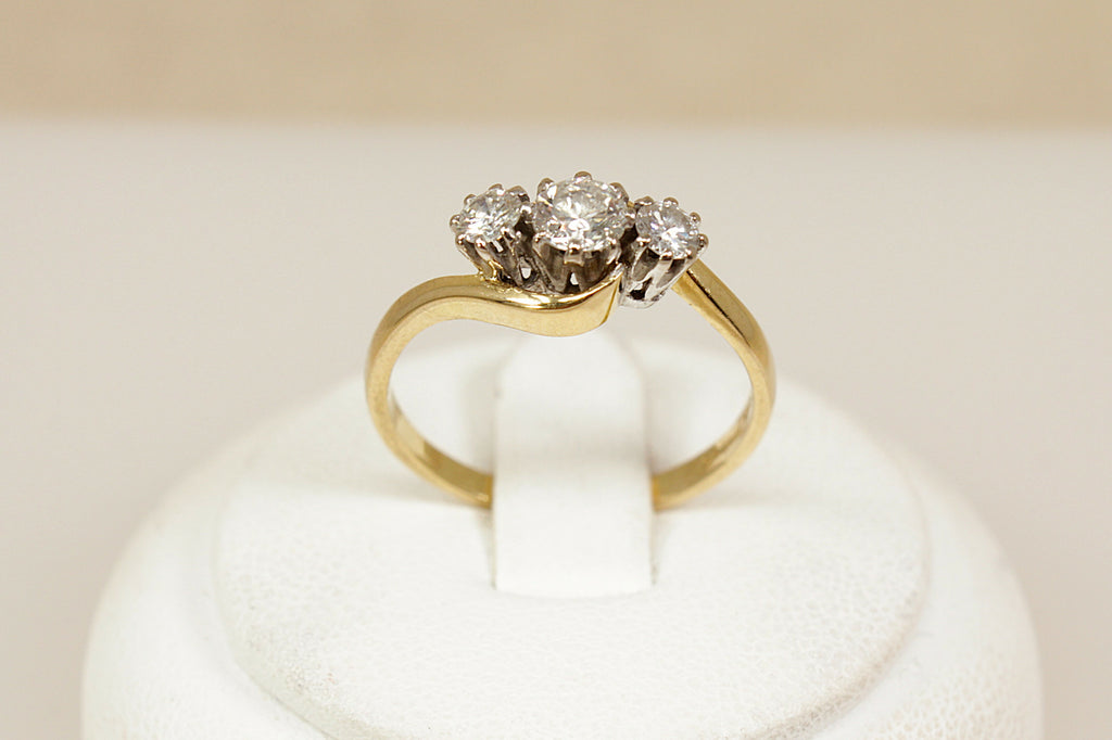 A beautiful and timeless vintage trilogy ring, crafted in 18ct yellow Gold with a graceful twist design to the head. The ring features three sparkling brilliant-cut Diamonds with a total weight of approximately 0.40ct – the central diamond weighing around 0.20ct, flanked by two outer diamonds of approximately 0.10ct each.
