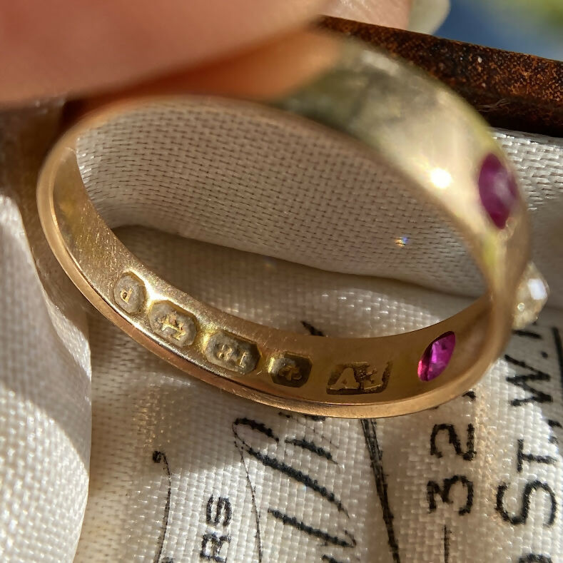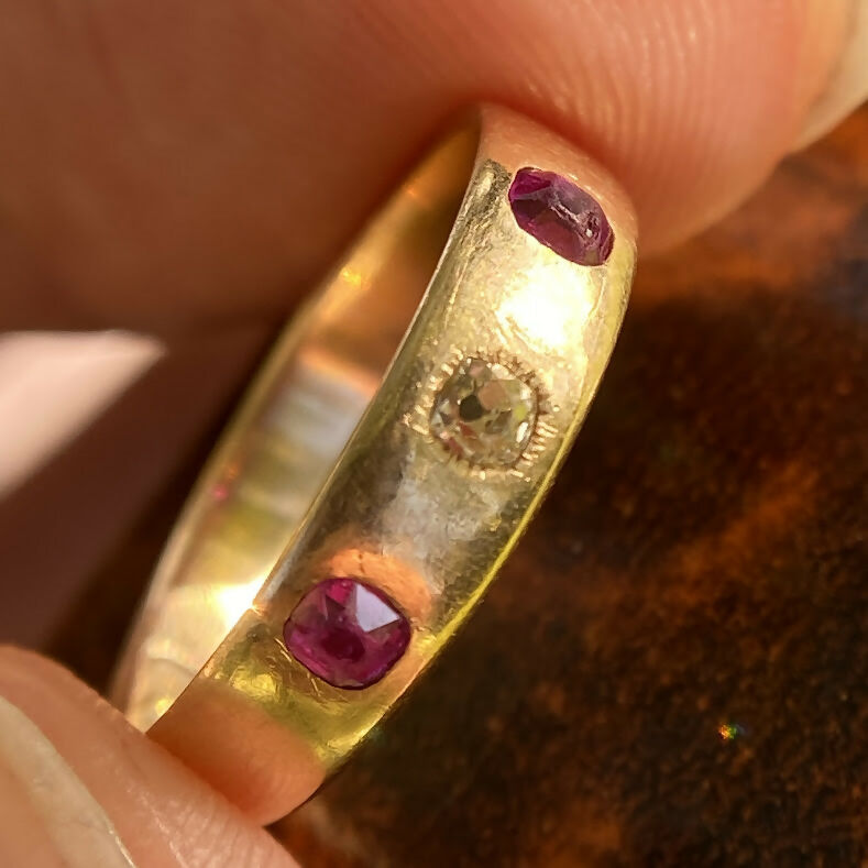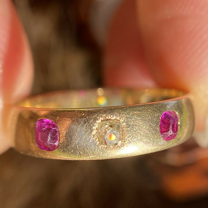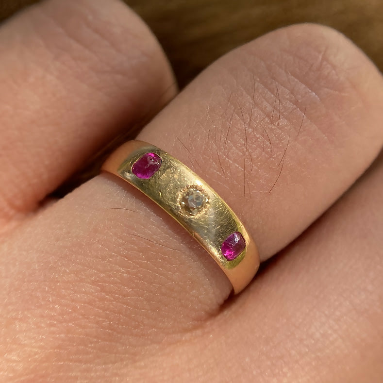 A charming Edwardian era gypsy band ring, handcrafted in 18ct yellow gold and assayed in Birmingham 1914. This classic design features two lively cushion-cut rubies flanking a sparkling old cut diamond at the centre, flush-set into a smooth, polished gold band.