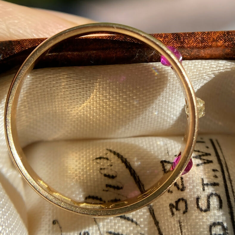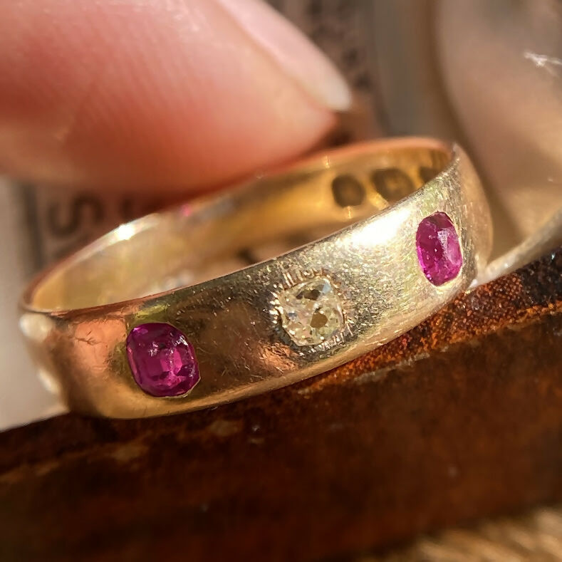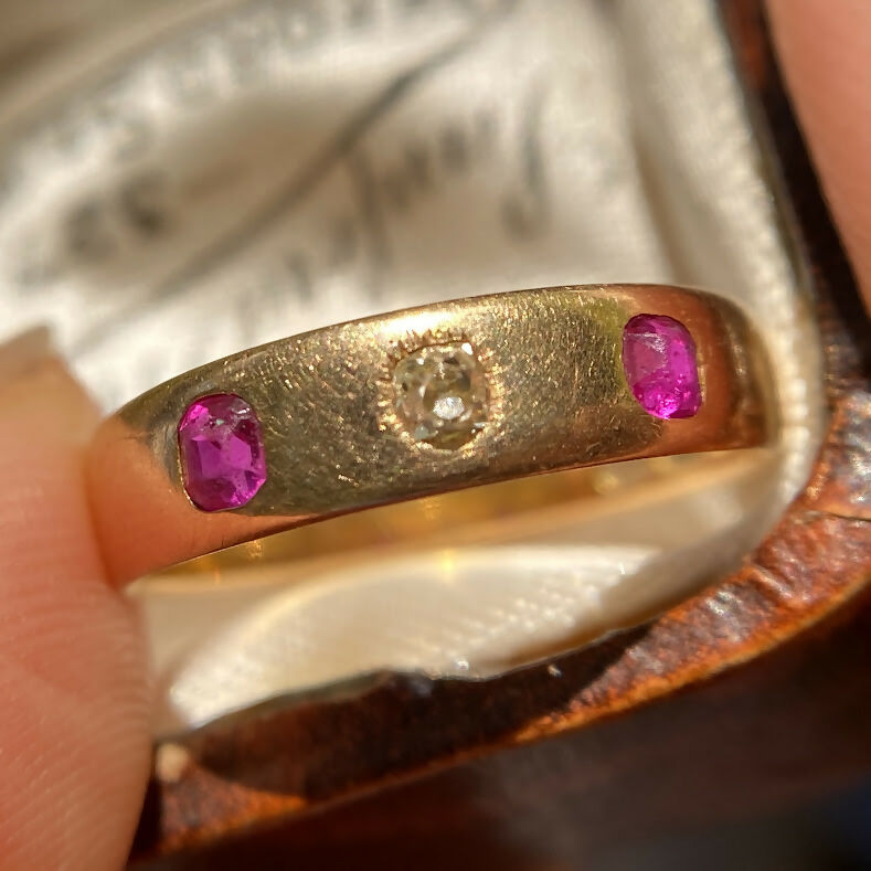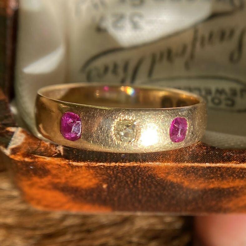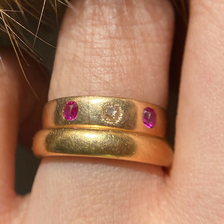 The rubies glow with a vivid pinkish red hue, perfectly complemented by the gentle fire of the diamond. Sleek, comfortable, and full of period charm, this piece embodies early 20th-century elegance — simple, refined, and effortlessly wearable every day.