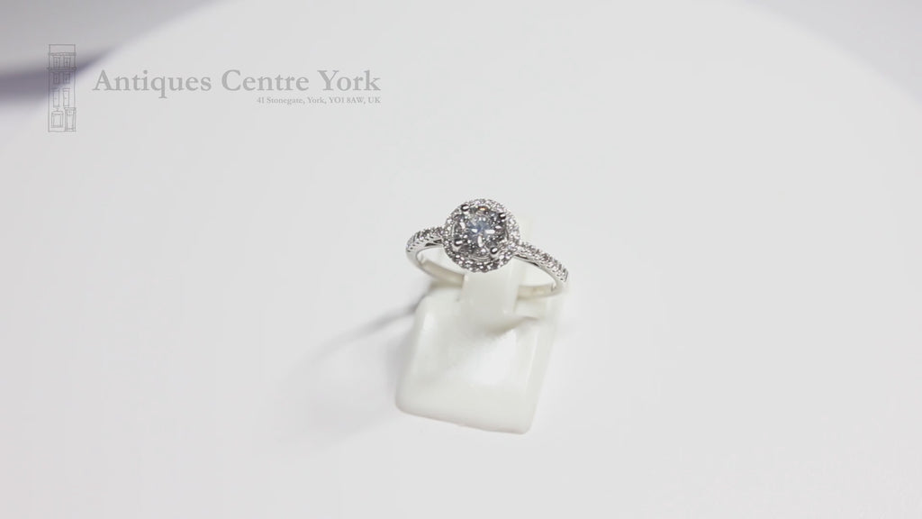 Diamond 'halo' cluster ring with a central brilliant cut diamond weighing an estimated 0.64ct. Colour estimated as I. Clarity estimated as SI2. The centre diamond has a lower surround of twenty diamonds and eight brilliant cut diamonds set into each shoulder. Total diamond content in mount 0.25ct. The cluster measures 8.3mm in diameter. Mounted in 18ct white gold with four claw setting to the centre diamond and grain settings to the surround with cut down settings to the shoulder diamonds. Finger size K1/2.