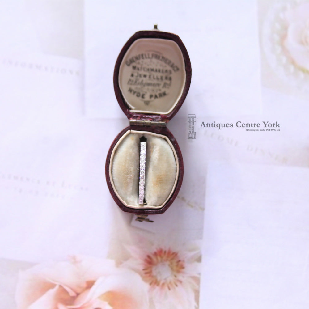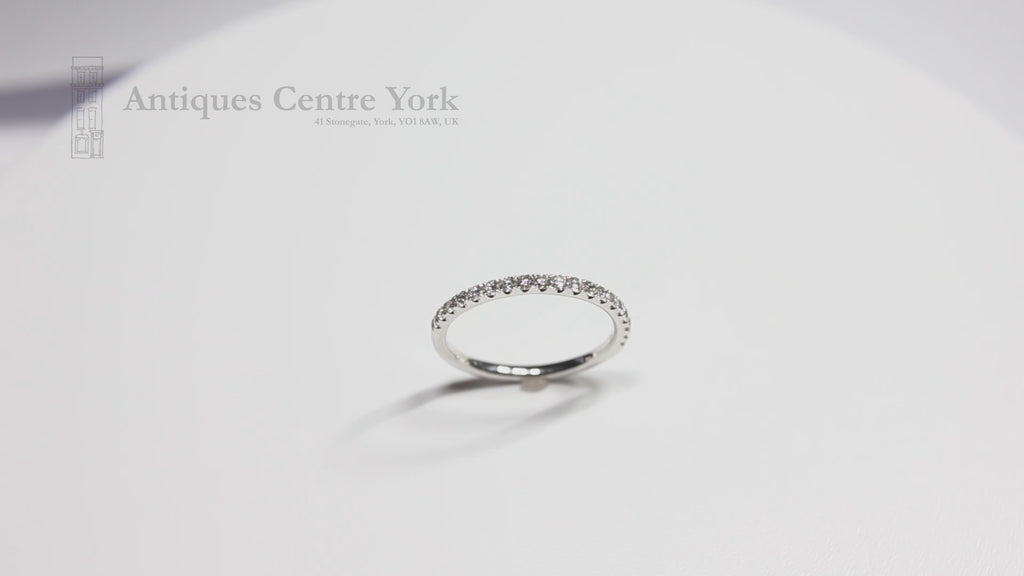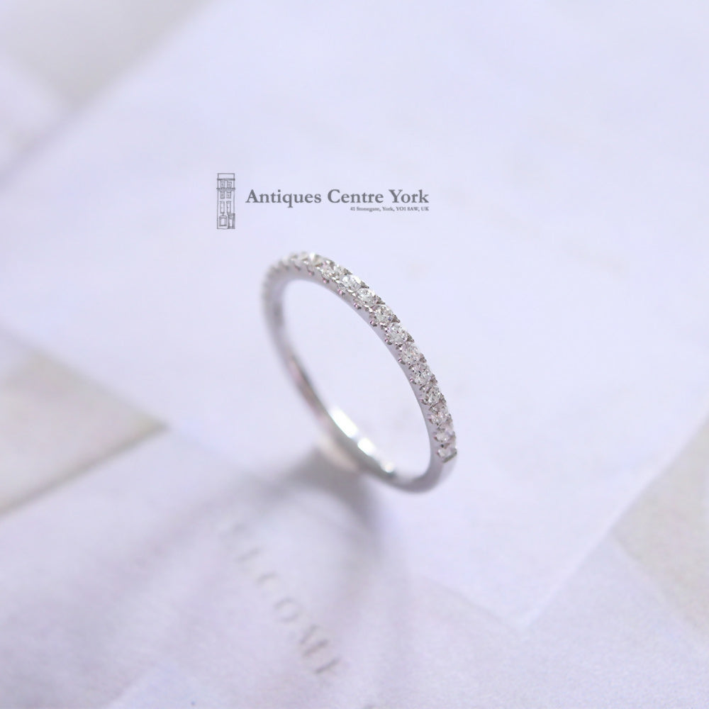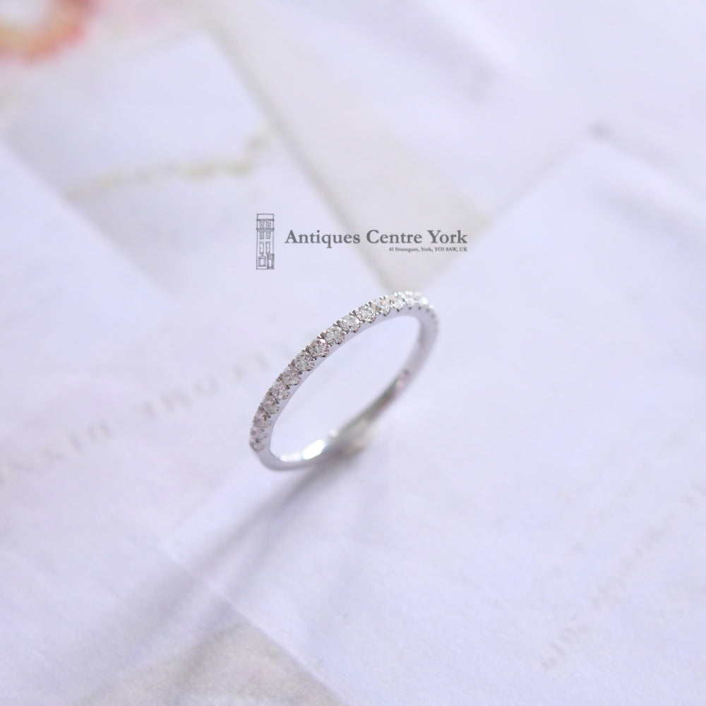 Diamond eternity ring measuring 1.7mm wide and set with nineteen brilliant cut diamonds 60% of the way round the ring to give the illusion that it is a full eternity ring. Total diamond content 0.35ct. Colour estimated as H/I. Clarity estimated as SI1. This ring is low set and could be worn as either a wedding band or an eternity ring. All 18ct white gold, finger size N. Weight 1.9g.