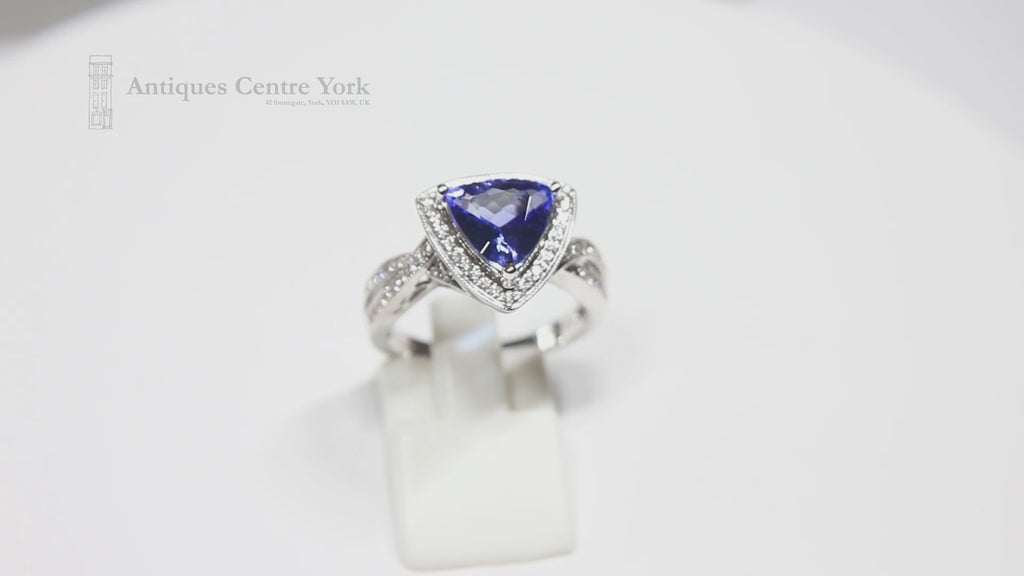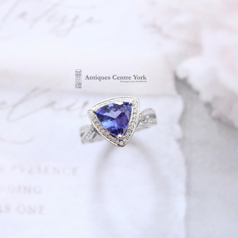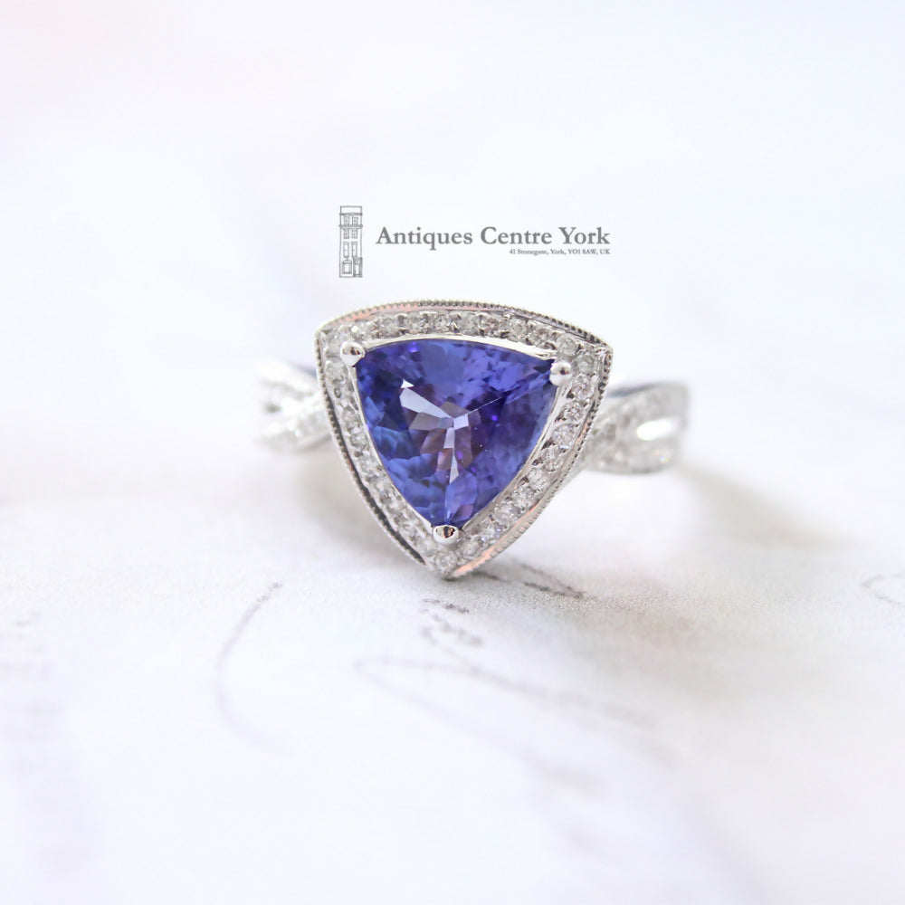 Trilliant cut natural, untreated tanzanite (leading colour blue) measuring approximately 10mm x 10mm, weighing 2.43cts (stamped inside shank). Mounted in all 18ct white gold with a lower surround of brilliant cut diamonds and diamonds set into two rows, crossed over on shoulders. The ring is high set sitting 7mm proud on the finger. Finger size Q1/2. Weight 7.62g. Stamped Dyach inside shank (Fine tanzanite jewellery makers).