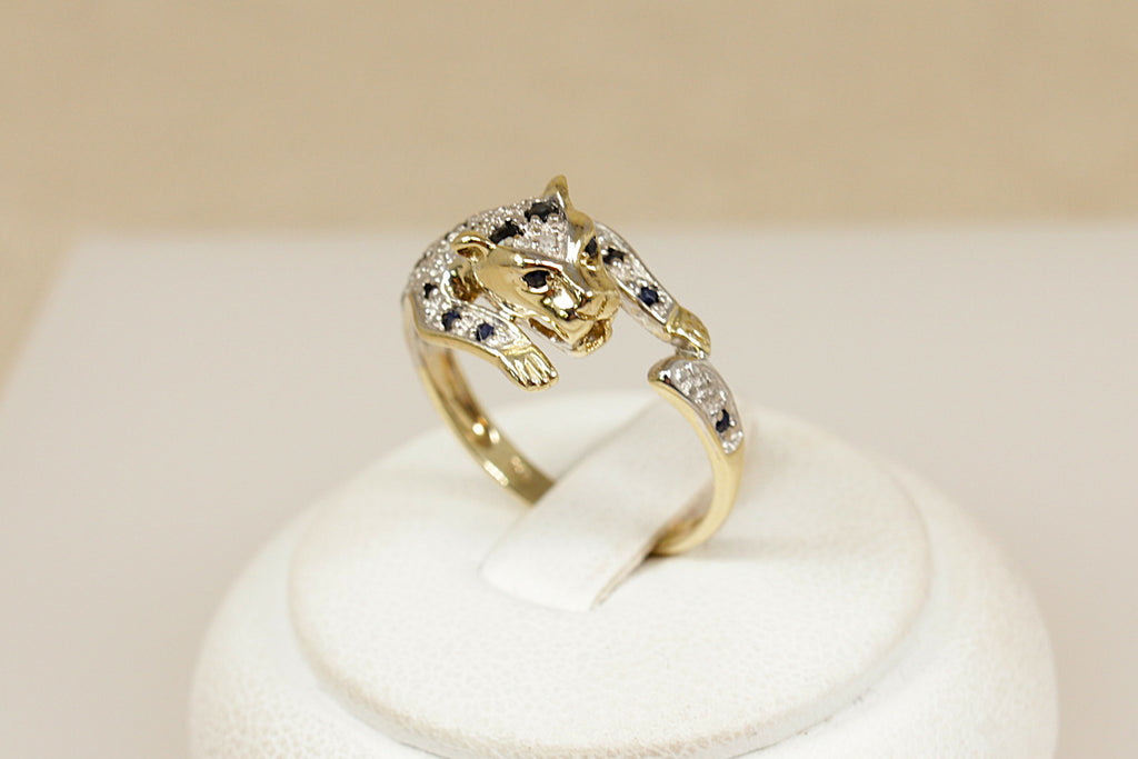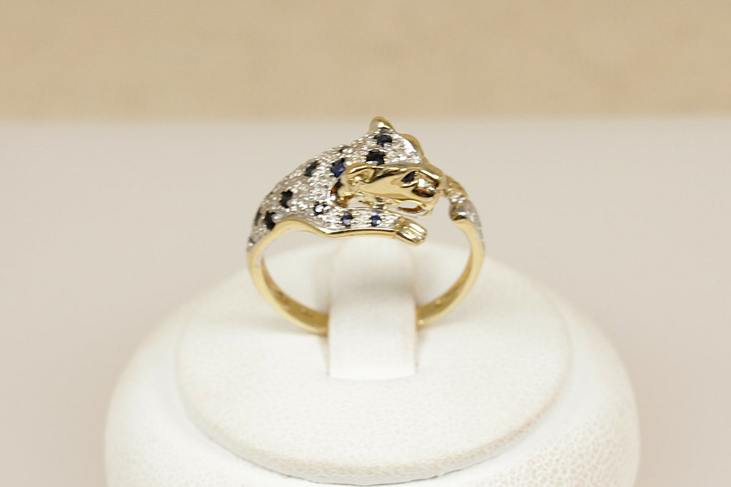 The leopard’s body and head are adorned with 17 milgrain-set Blue Sapphires with a total sapphire weight of approximately 0.14ct, while 6 diamond accents are scattered across the design, adding subtle sparkle with a total diamond weight of approximately 0.03ct.