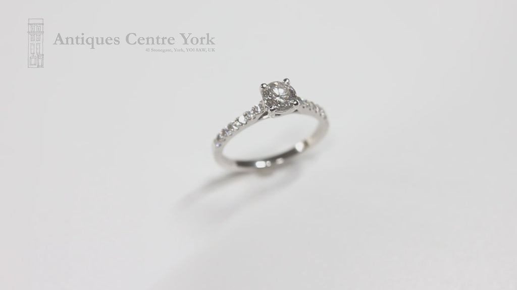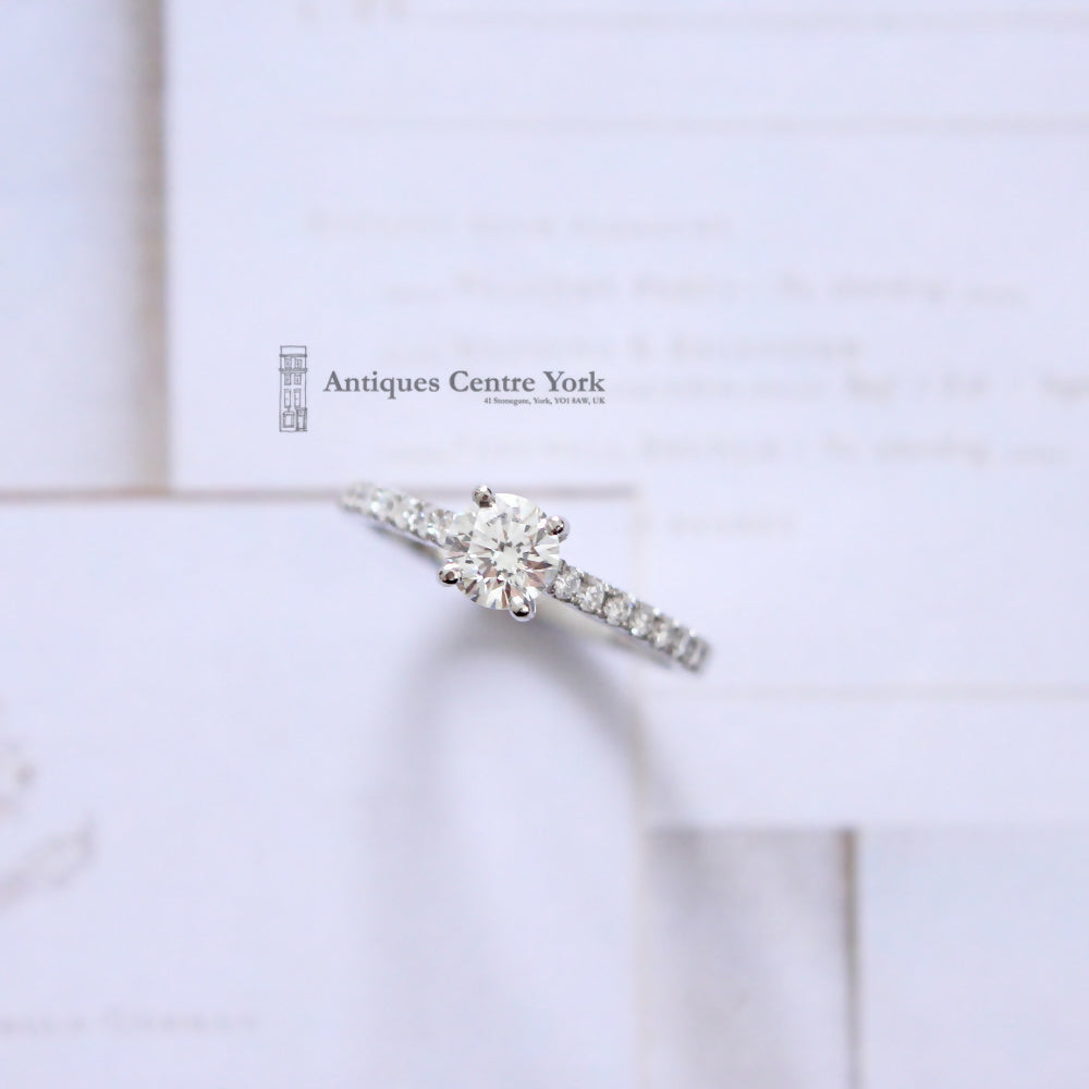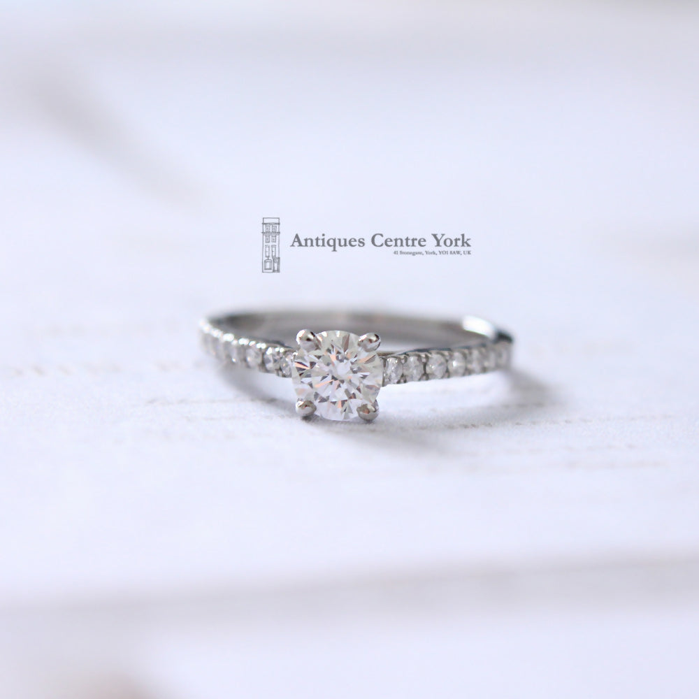 A GIA certified natural round brilliant cut diamond weighing 0.55ct. The diamond is colourless graded as an E. Clarity VS1. Mounted in all platinum with four claw setting and seven brilliant cut diamonds set into each shoulder. Finger size L. Fully hallmarked. Laser inscription around girdle of diamond.
