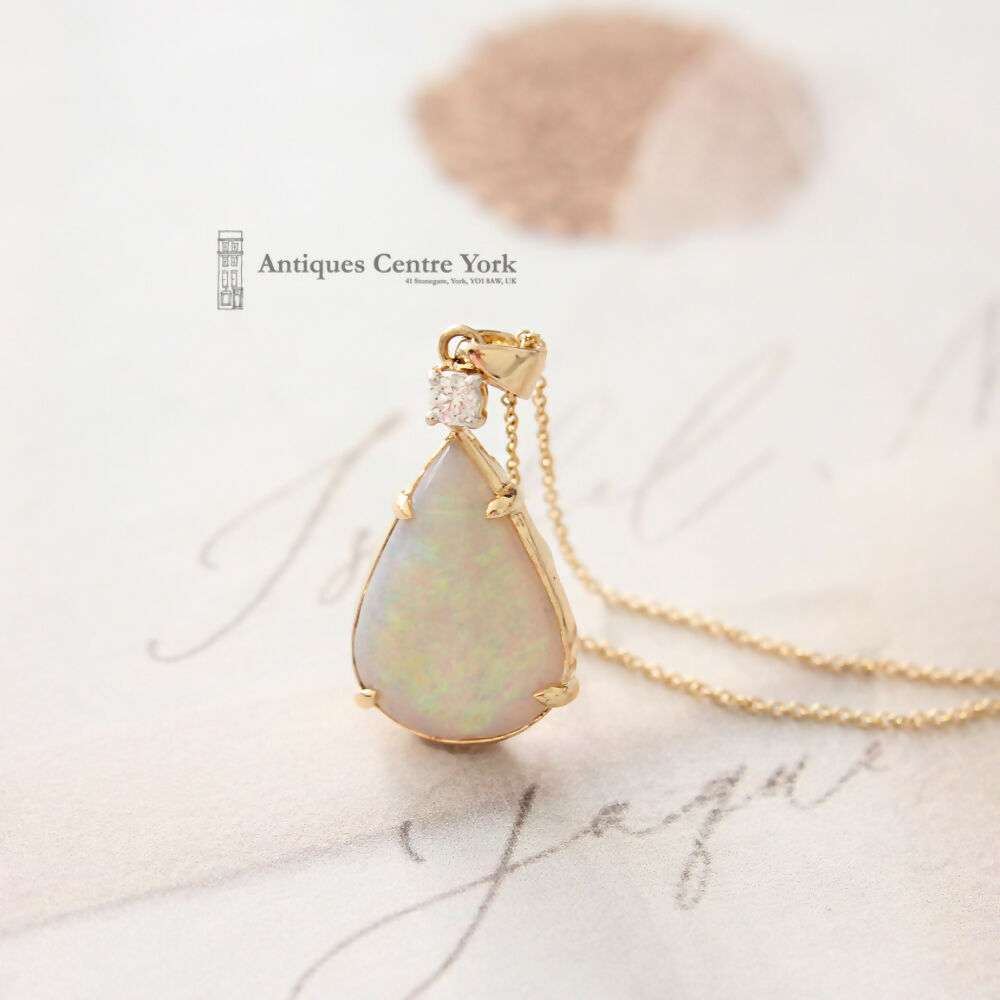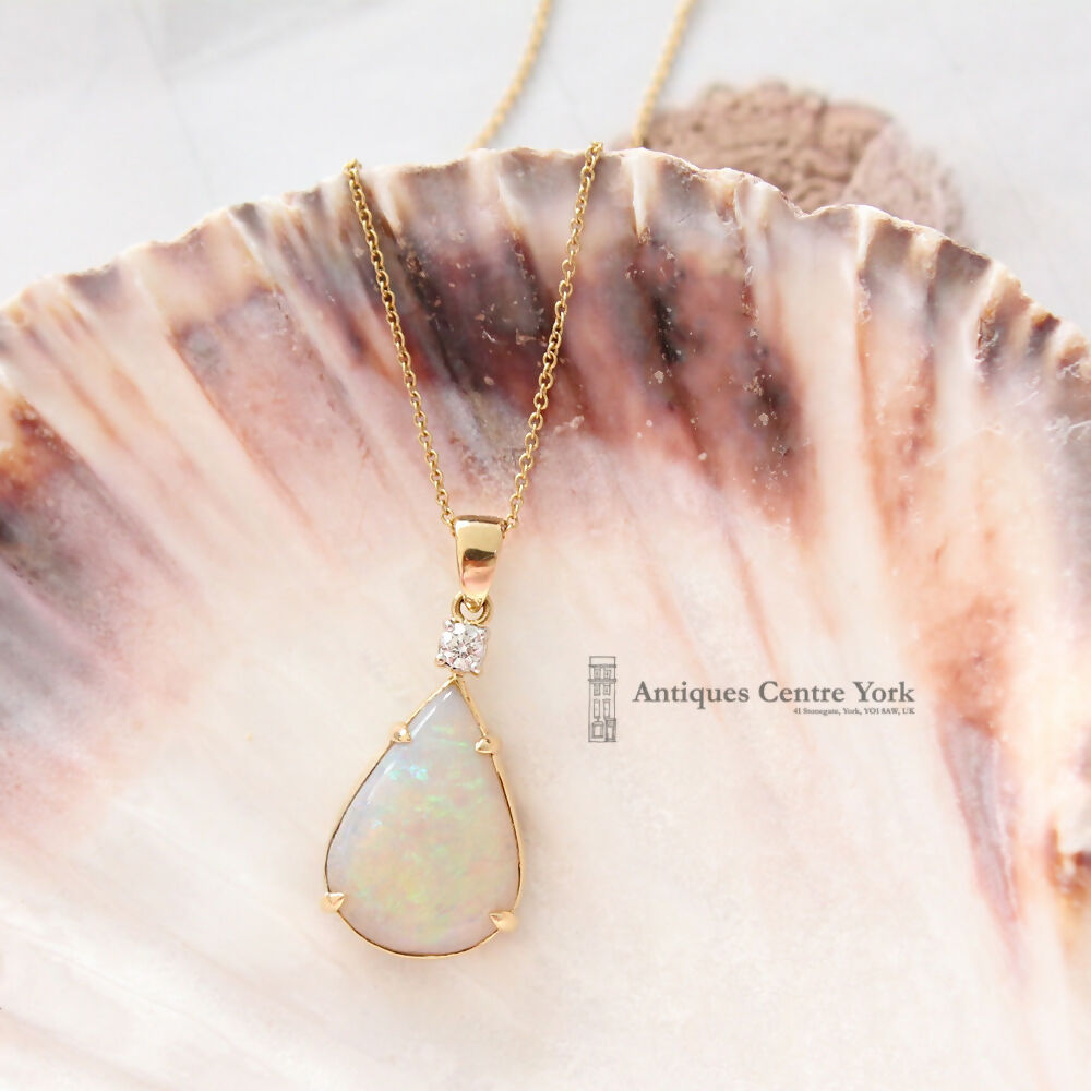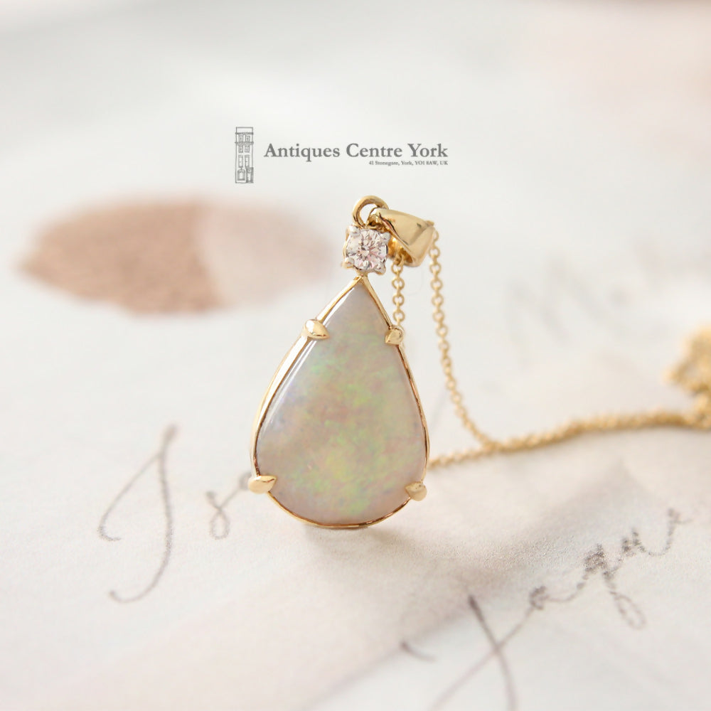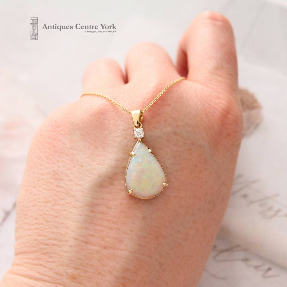 Beautiful, natural, colourful pear cut opal measuring 20mm x 15mm and weighing 7.30cts. Set into a handmade 18ct yellow gold pendant mount with four claw setting and a plain bail Between the bail and the opal is set a brilliant cut diamond weighing 0.11ct. Measuring 32mm in length. Suspended from a 16" 18ct gold trace chain weighing 1.4g.