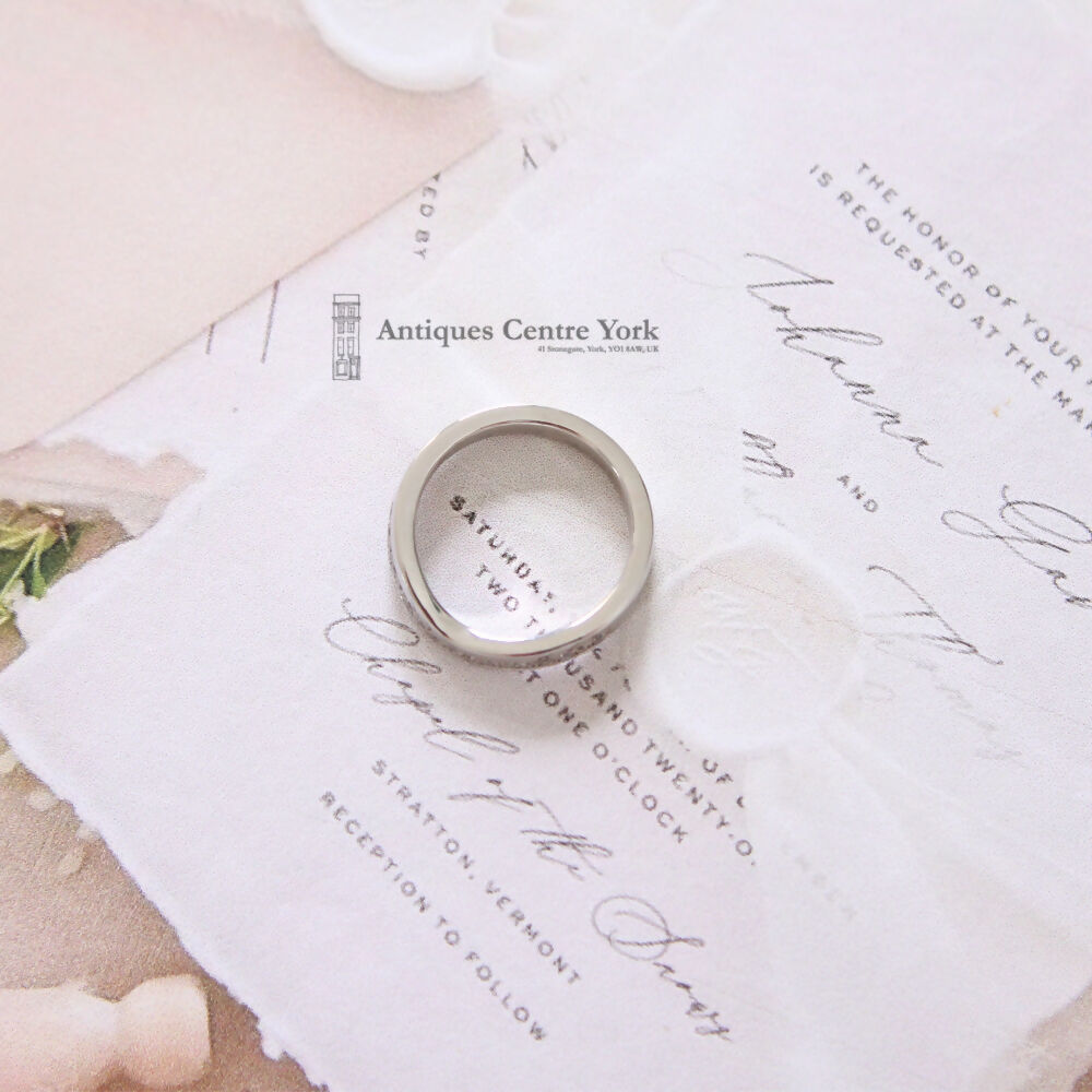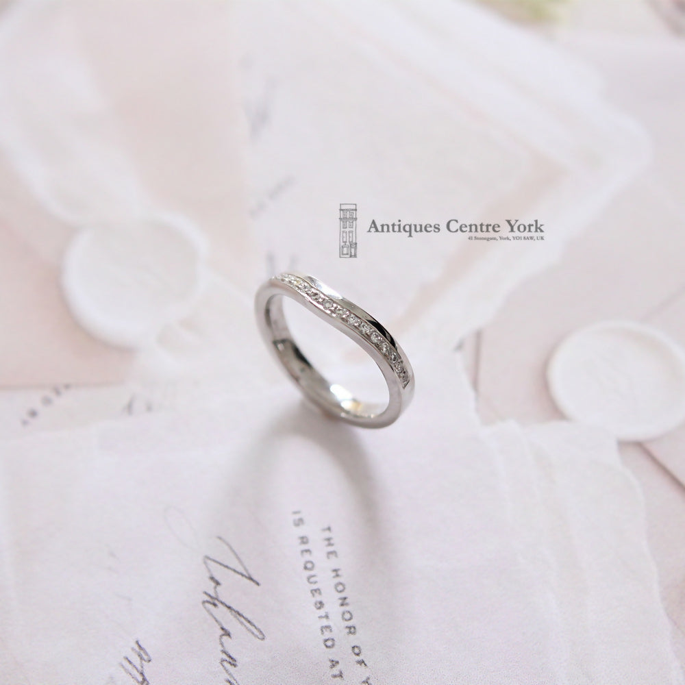 Platinum curved diamond set wedding band. 3mm wide, 2.1mm deep, flat court set with 17 brilliant cut diamonds on one side of the top. Total diamond content estimated as 0.10ct. Colour estimated as G. Clarity estimated as VS. Finger size J1/2. Weight 5.69g. (This ring could also be worn as an eternity).