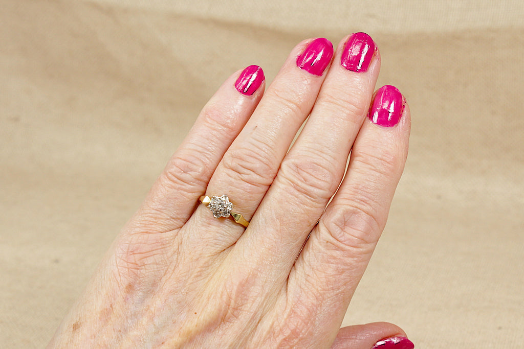 The shoulders have a subtle angular shape that complements the cluster beautifully, adding a touch of vintage character. Inside the band, the ring carries London hallmarks for 1977 along with the maker’s stamp C & S, confirming its authenticity and craftsmanship.