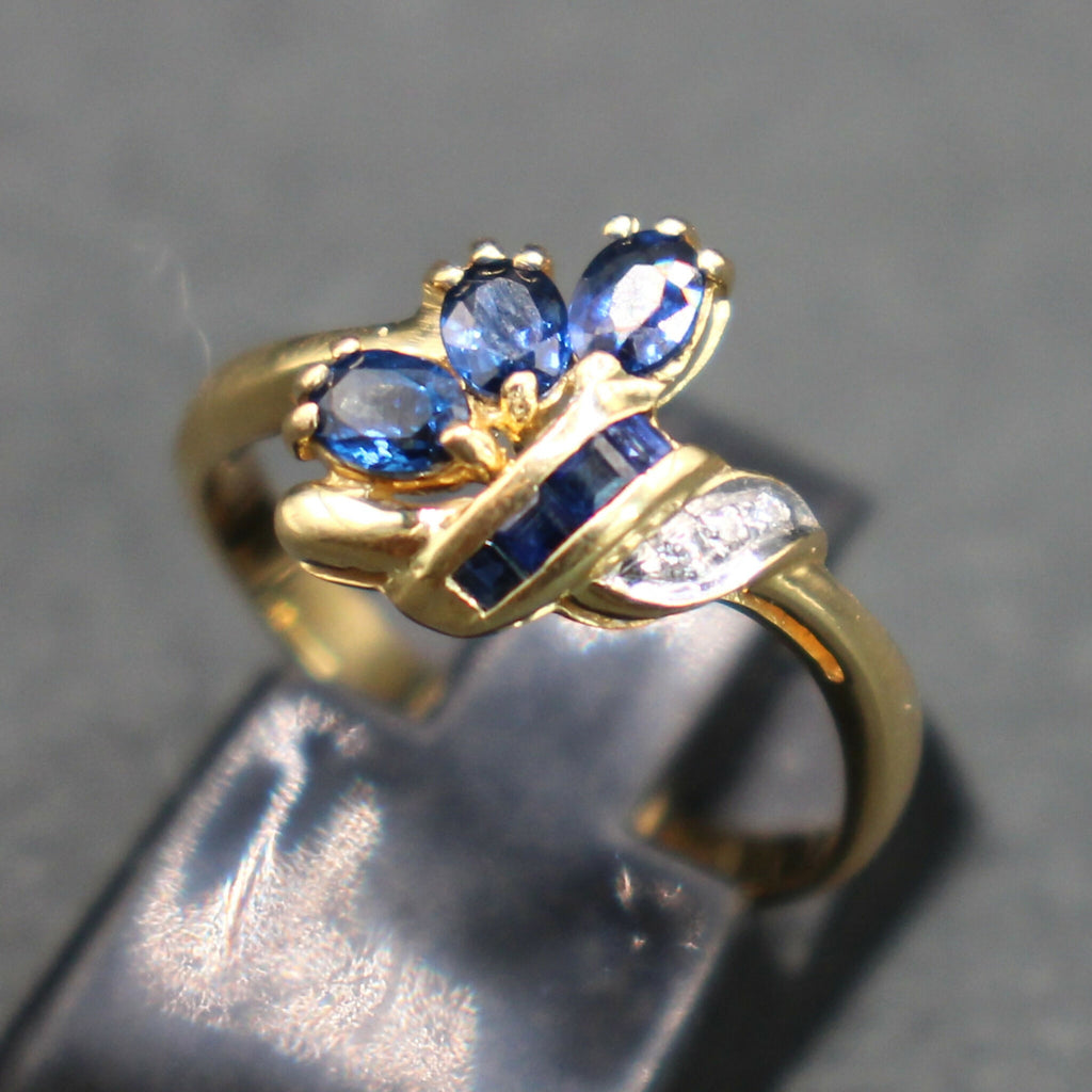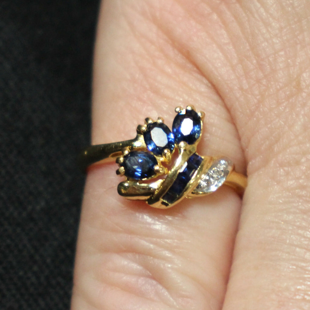 This 18ct gold cluster ring is set with three oval cut sapphires, four square cut sapphires and three diamond chips in a floral bunch design. The oval sapphires each measure approximately 4x3mm with the overall head/design measuring approximately 12x12mm.