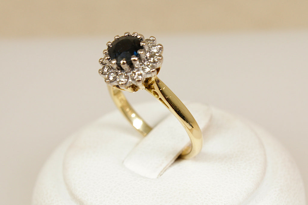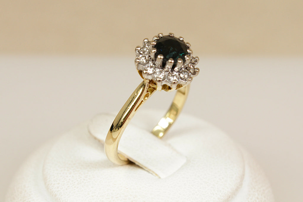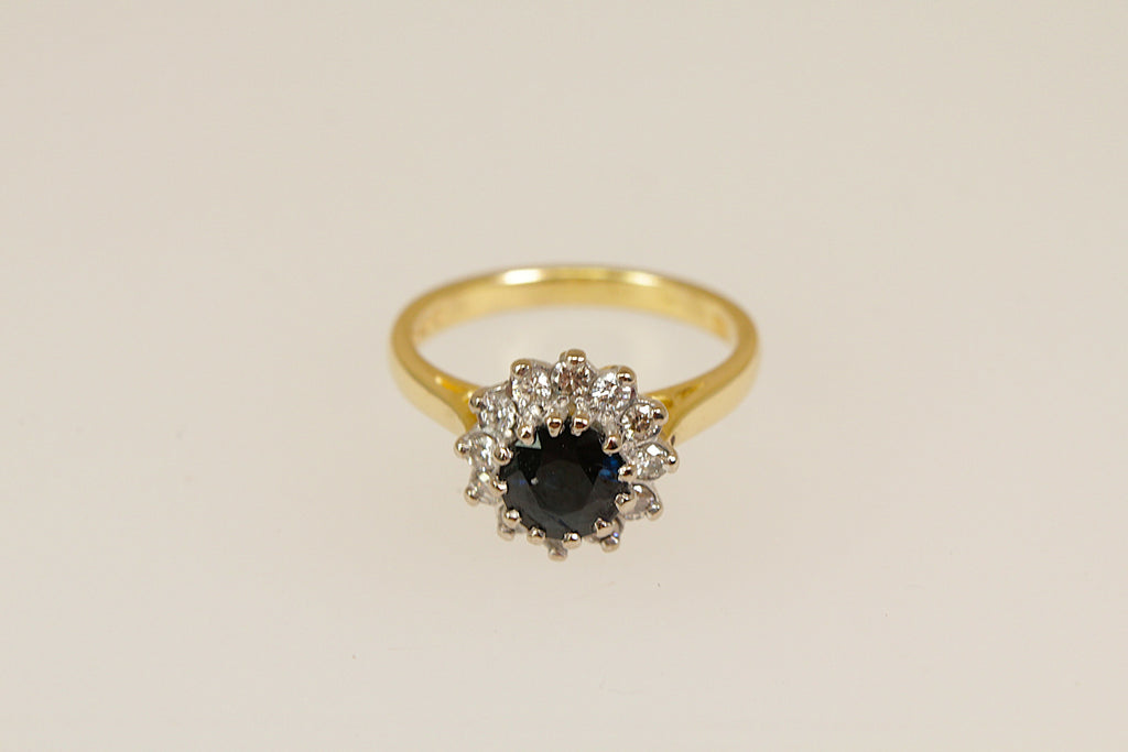 This exquisite 18ct Gold cluster ring features a beautiful round midnight-blue Sapphire, securely claw-set in an elegant crown and basket mount. Surrounding the sapphire are 12 sparkling diamonds, each approximately 0.02ct, all claw-set to create a radiant floral-style cluster that catches the light beautifully.