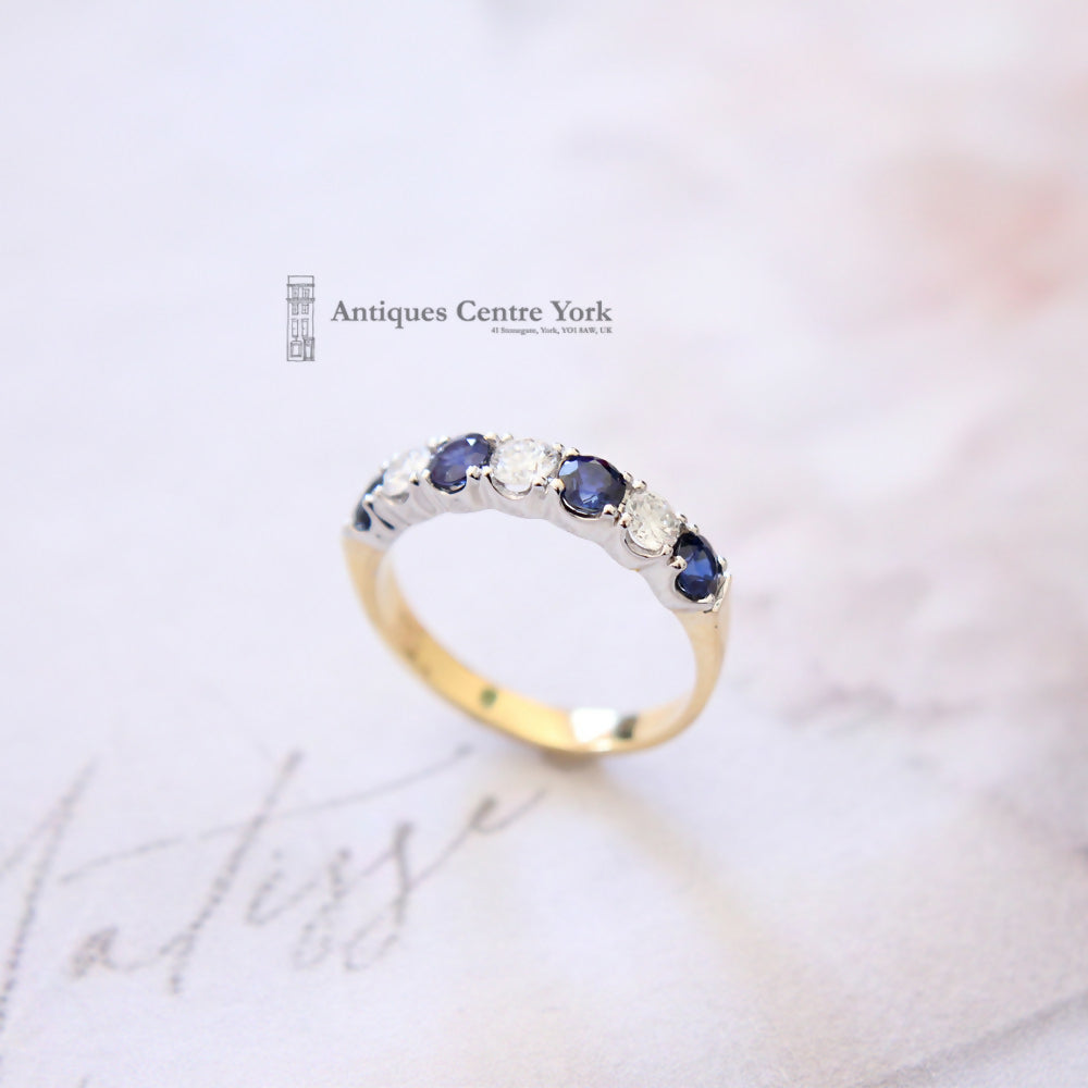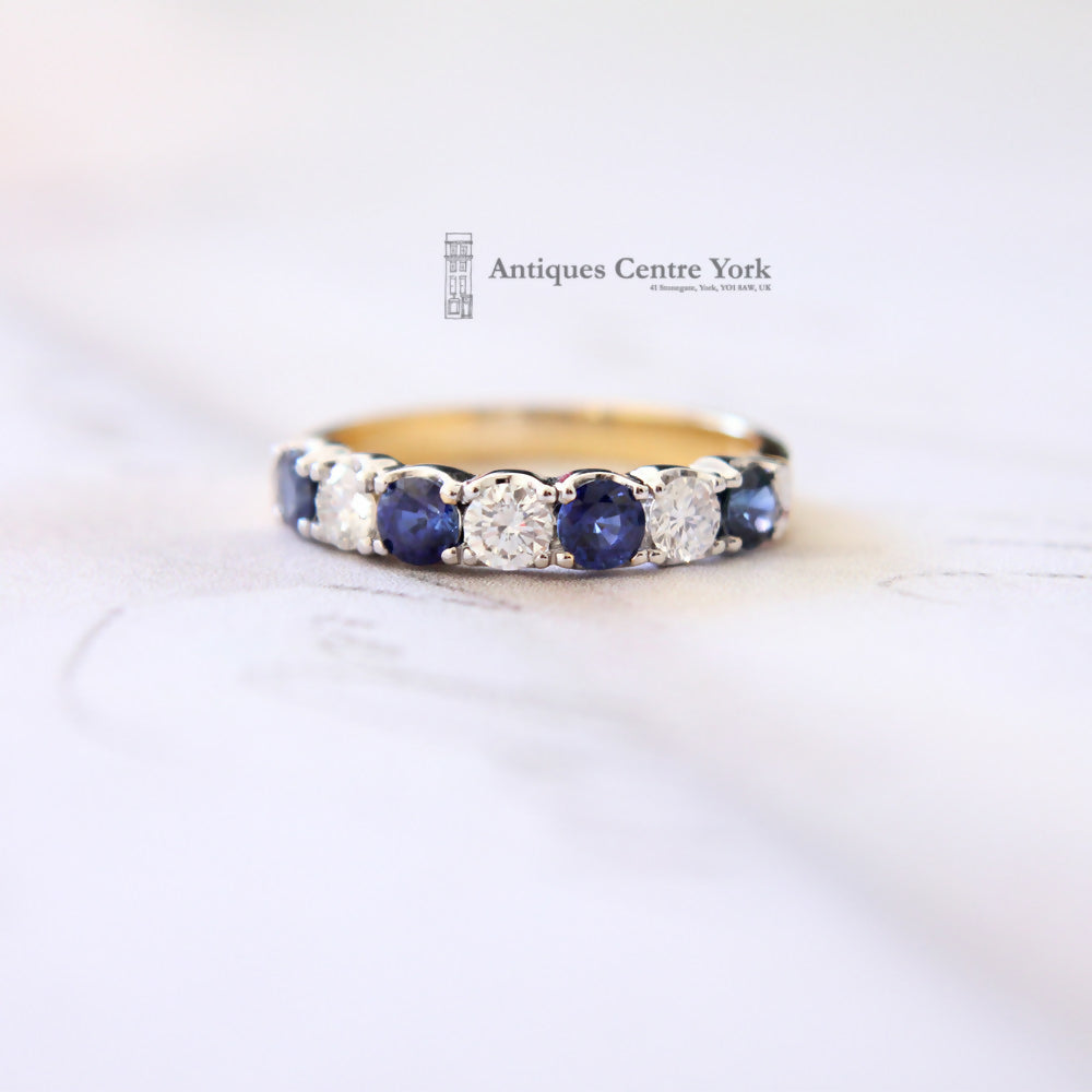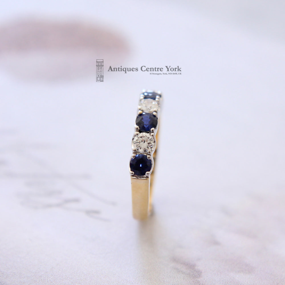 Exceptional quality 18ct sapphire and diamond 7 stone half eternity ring consisting of four 3.15mm wide sapphires and three brilliant cut diamonds each weighing an estimated 0.125ct. Set alternately in 18ct yellow gold with white gold 4 claw settings and scalloped gallery. Total diamond content estimated as 0.38ct. Colour estimated as G/H. Clarity estimated as SI1. Finger size M1/2. Stamped 750 and tested to confirm.