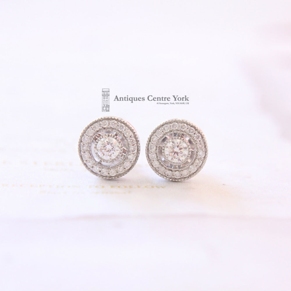 Pair of diamond cluster earrings. Each earrings set with a central brilliant cut diamond weighing an estimated 0.20ct with a surround of eighteen brilliant cut diamonds. Total diamond content in pair estimated as 0.60ct. Colour estimated as H/I. Clarity estimated as VS2. Overall the clusters measure 9.5mm. Made in 18ct white gold with grain settings with millegrain edging to the diamonds and post and heavy, large flower design butterfly fittings. The earrings are signed on the back Luke Stockley London. Gross weight of pair 4.3g.