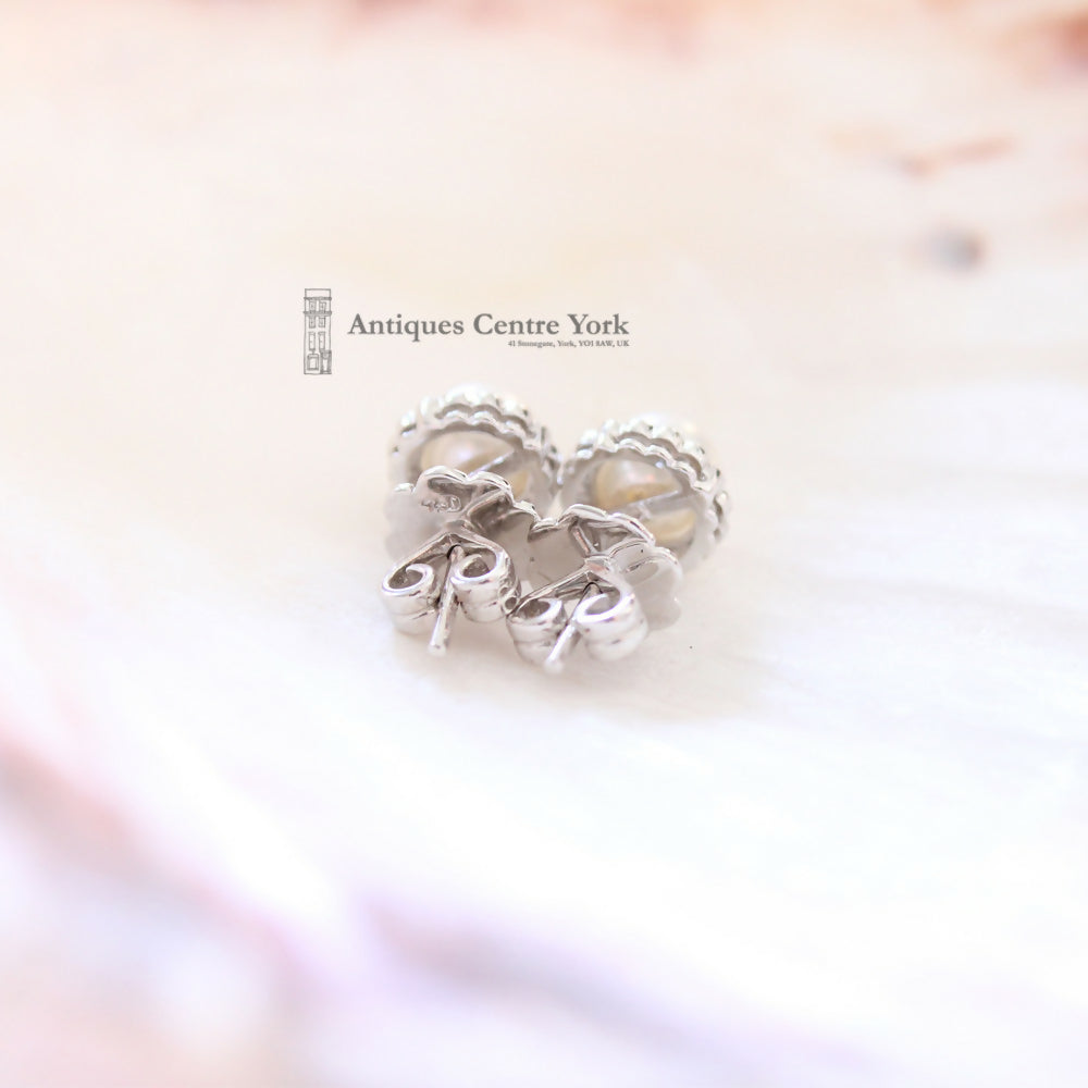 Beautiful pair of pearl & diamond cluster earrings. Each earrings set with a white cultured pearl measuring 6.4mm with a surround of sixteen brilliant cut diamonds. Total diamond content in pair estimated as 0.25ct. Overall the cluster measures 9mm. Beautifully crafted in 18ct white gold with millegrain edging to the diamonds with post and a heavy, large flower design butterfly fittings. The earrings are signed on the back Luke Stockley London. Gross weight of pair 4.1g.