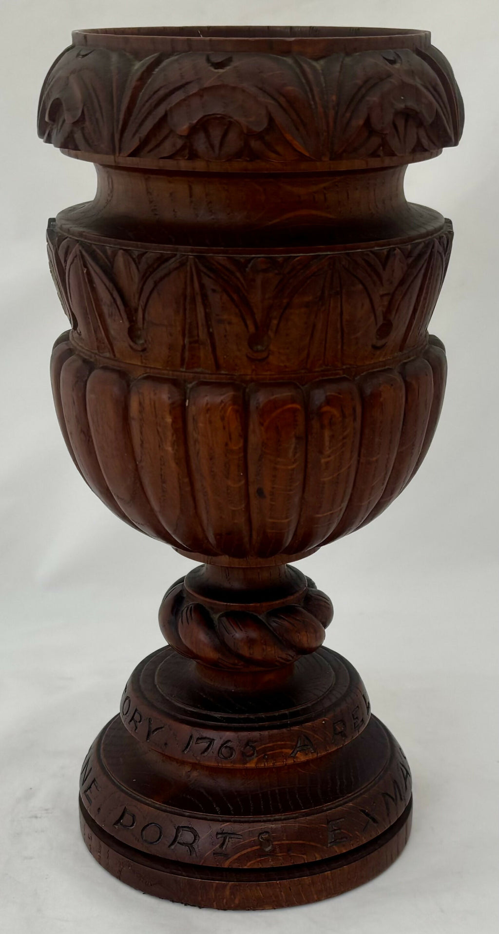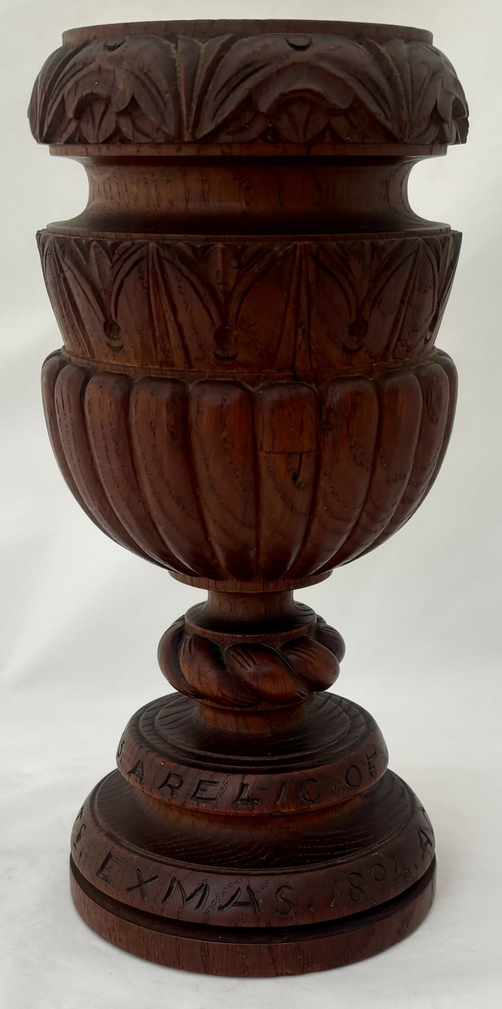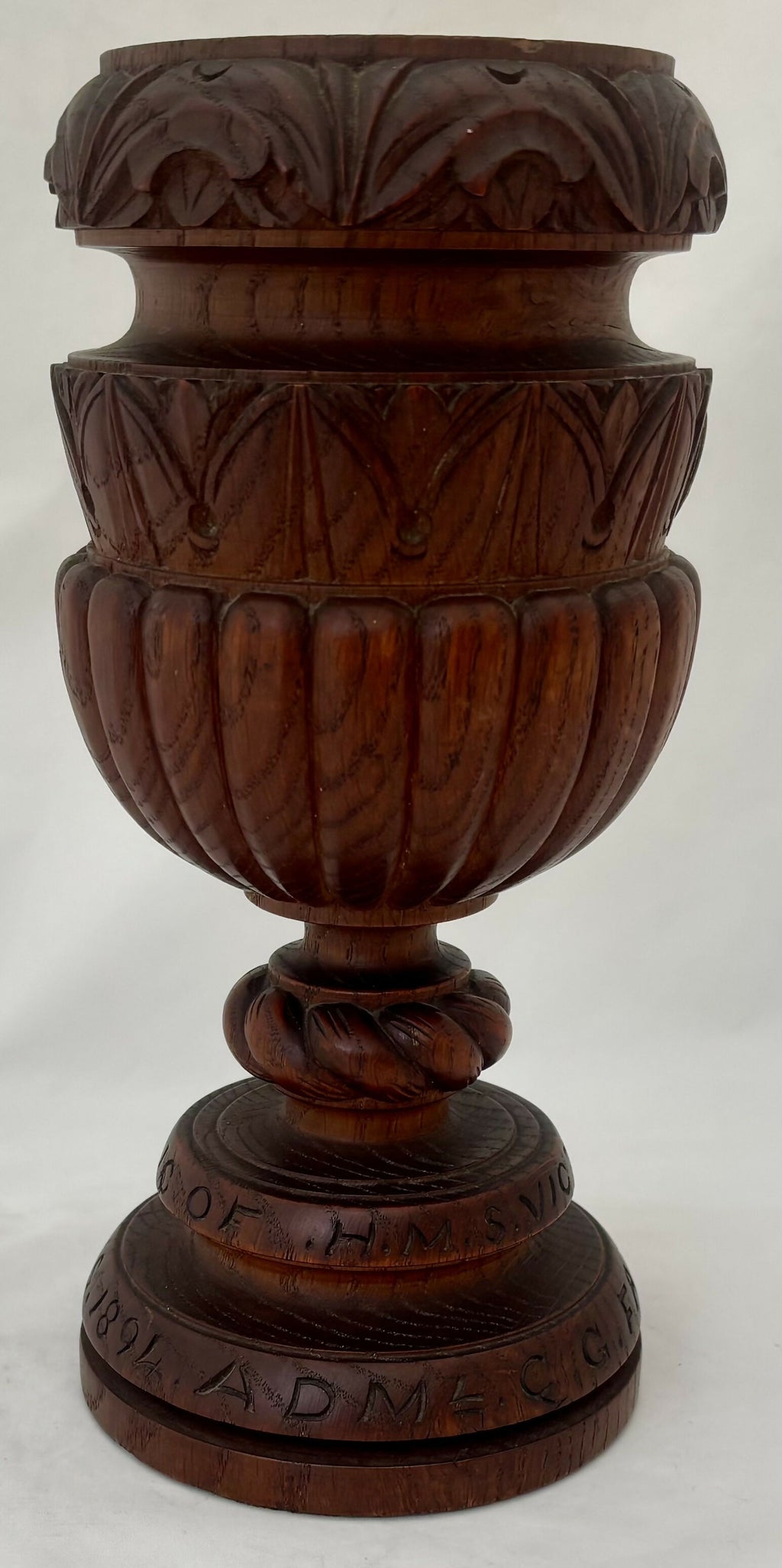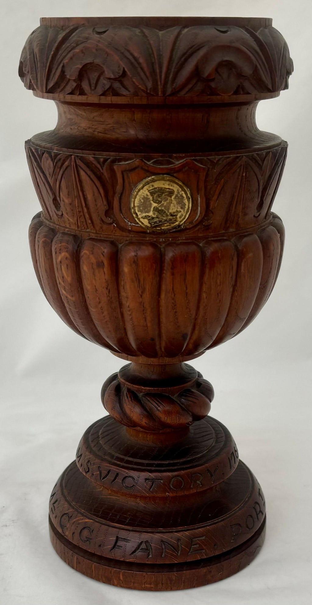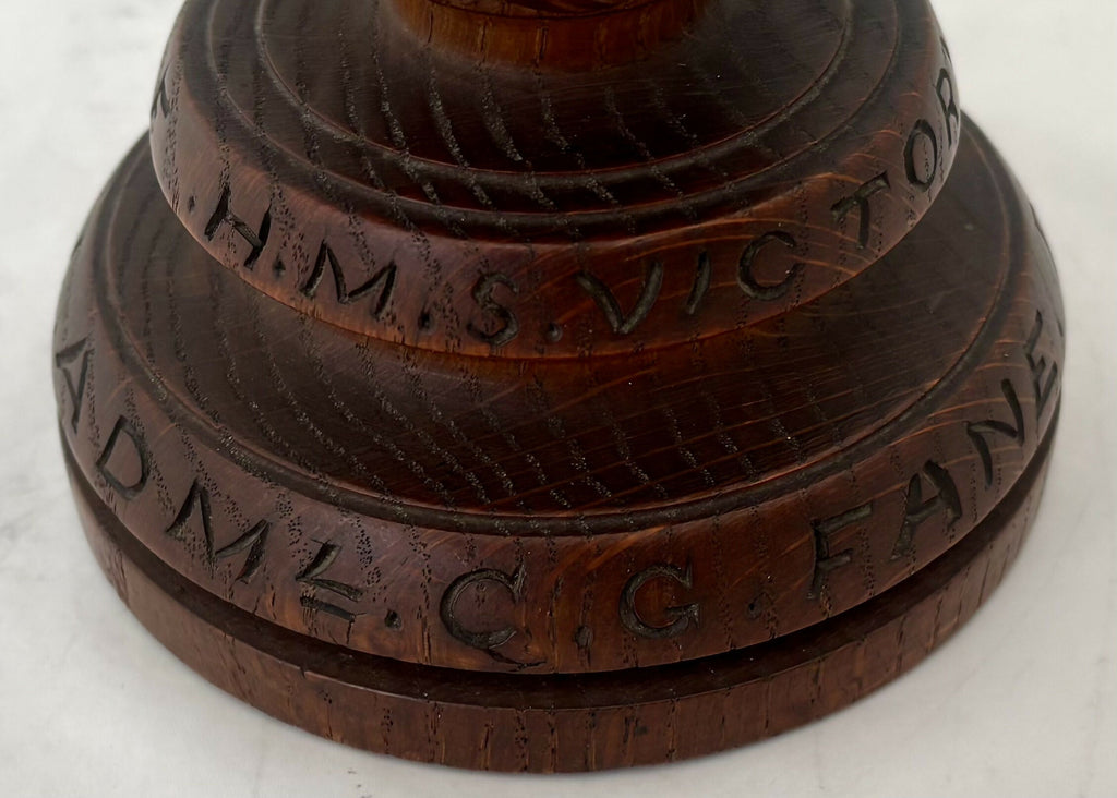 Admiral Sir Charles George Fane KCB FZS (1837 - 1909) Turned Oak Chalice, 'A Relic of HMS Victory 1765'. Presented to the Admiral at Christmas 1894, while he was Admiral-Superintendent of HM Dockyard Portsmouth (1892 - 1896). The chalice features a brass roundel depicting the family crest of Fane.