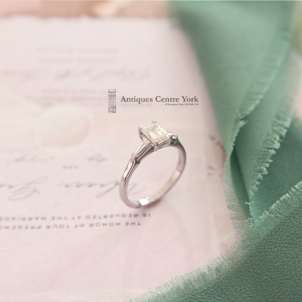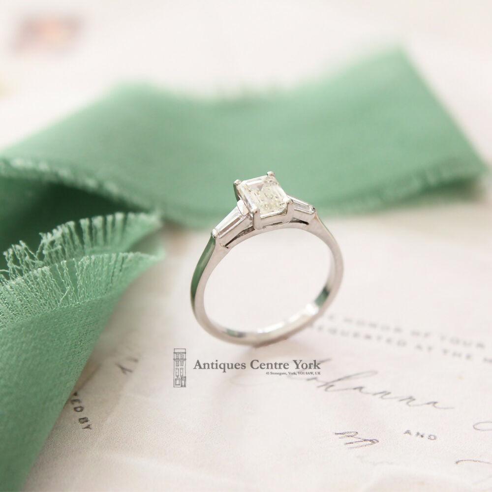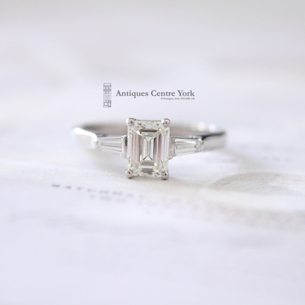 Emerald cut diamond measuring 6.32mm x 4.74mm, weighing an estimated 0.96ct. Colour estimated as K/L. Clarity estimated as SI1. Set with a tapering baguette cut diamond on either side. Mounted in an all Platinum mount with four claw setting. (No hallmark but tested to confirm). Finger size L.