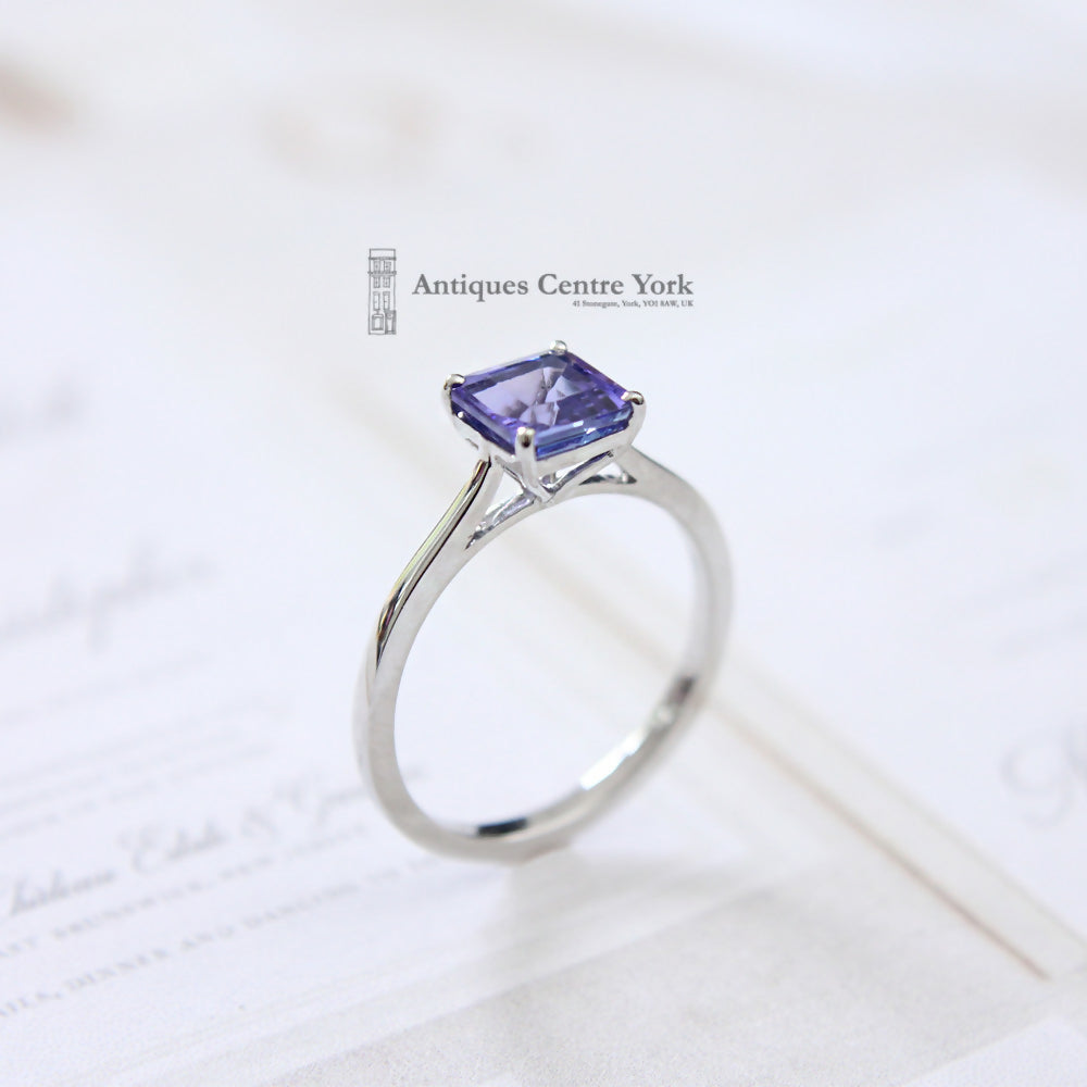 An engagement ring with a twist. A stunning AAA quality Asscher cut tanzanite weighing 2.00cts mounted in a simple platinum high set 4 claw solitaire ring mount. Finger size S but could easily be sized down. Authenticity certificate from Gemporia, Tomas Rae luxury range. Snuggle fit mount which looks beautiful next to a diamond band.