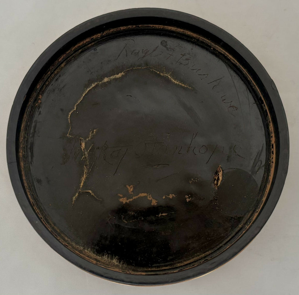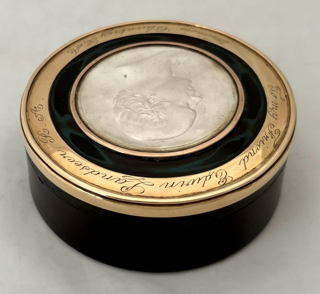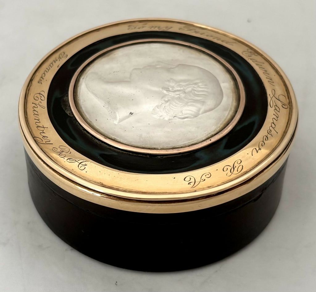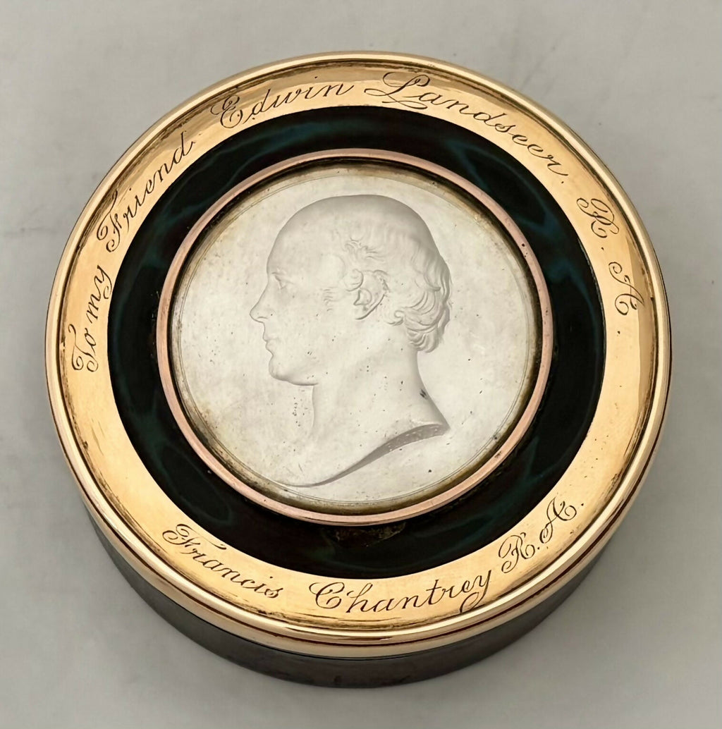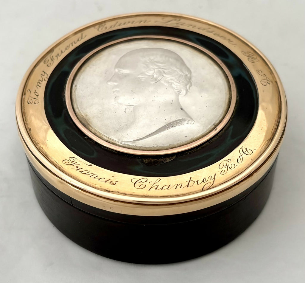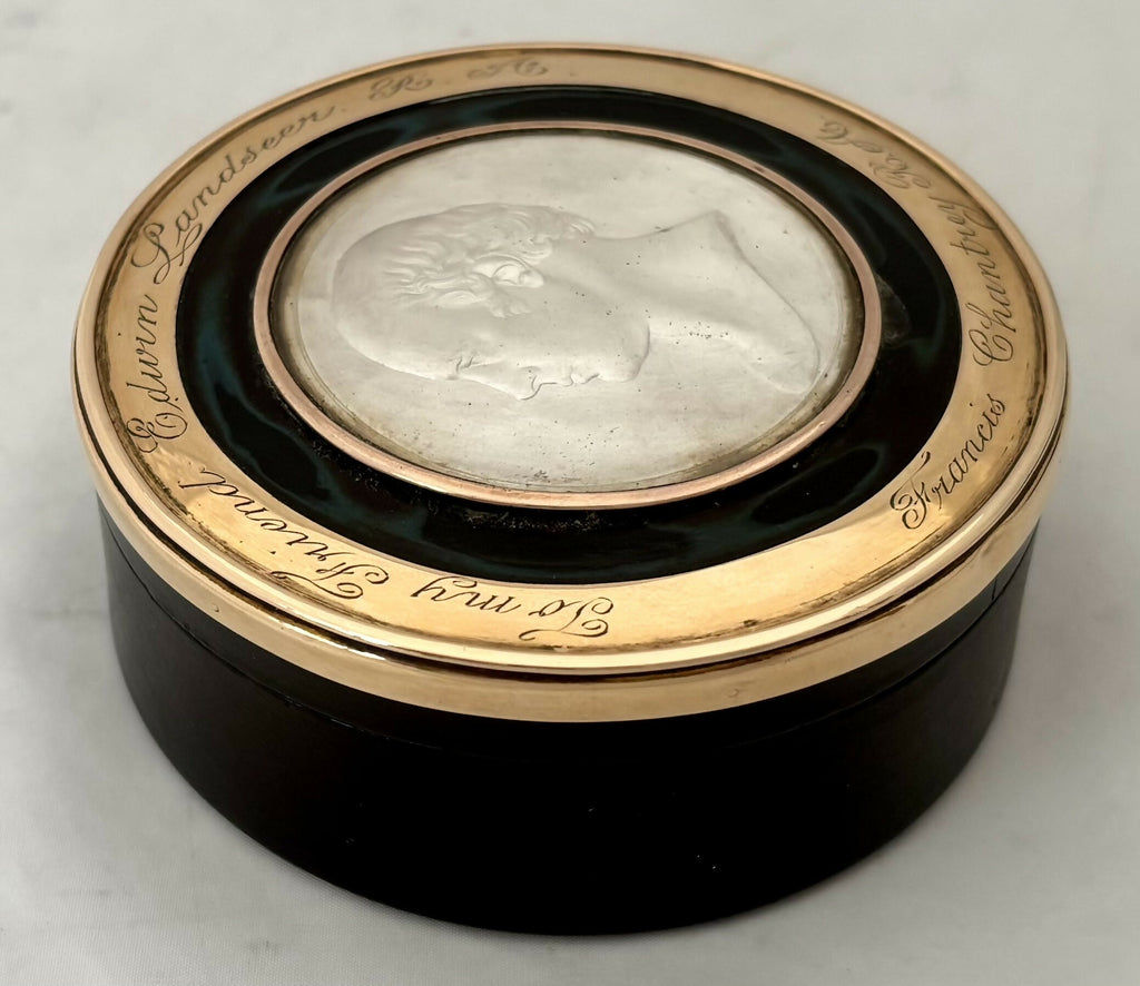 Sir Francis Leggatt Chantrey RA (1781 - 1841) and Sir Edwin Henry Landseer RA (1802 - 1873) Gold Mounted Lacquered Circular Snuff Box with a White Metal Portrait Profile Relief of Chantrey by William Bain. The Border of the Box with Presentation Inscription from Chantrey to Landseer. Housed in a Fitted Case and Circa 1825 - 1840. Chantrey was the Leading Portrait Sculptor in Regency Britain, with George IV on Horseback, in Trafalgar Square, being one of his most notable. Landseer was Best Known for his Sculpture of the Lions at the Base of Nelson's Column, Trafalgar Square and his Paintings of Animals.