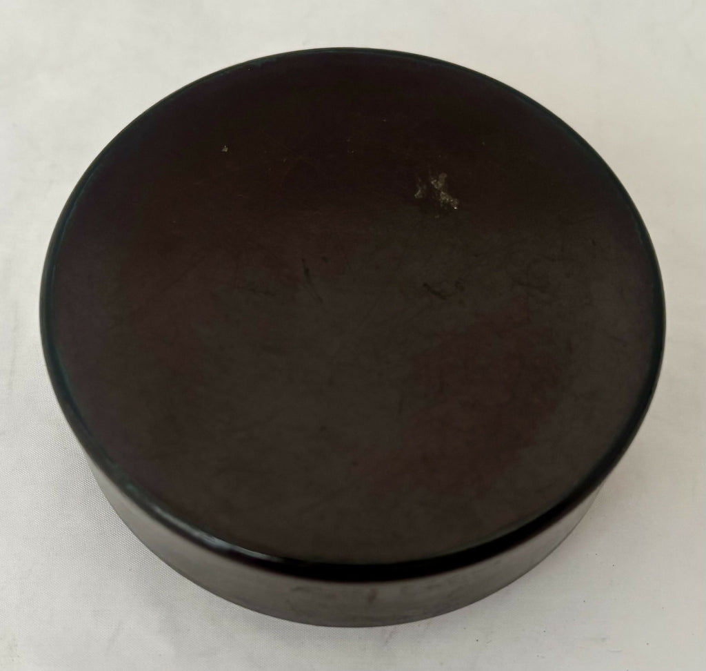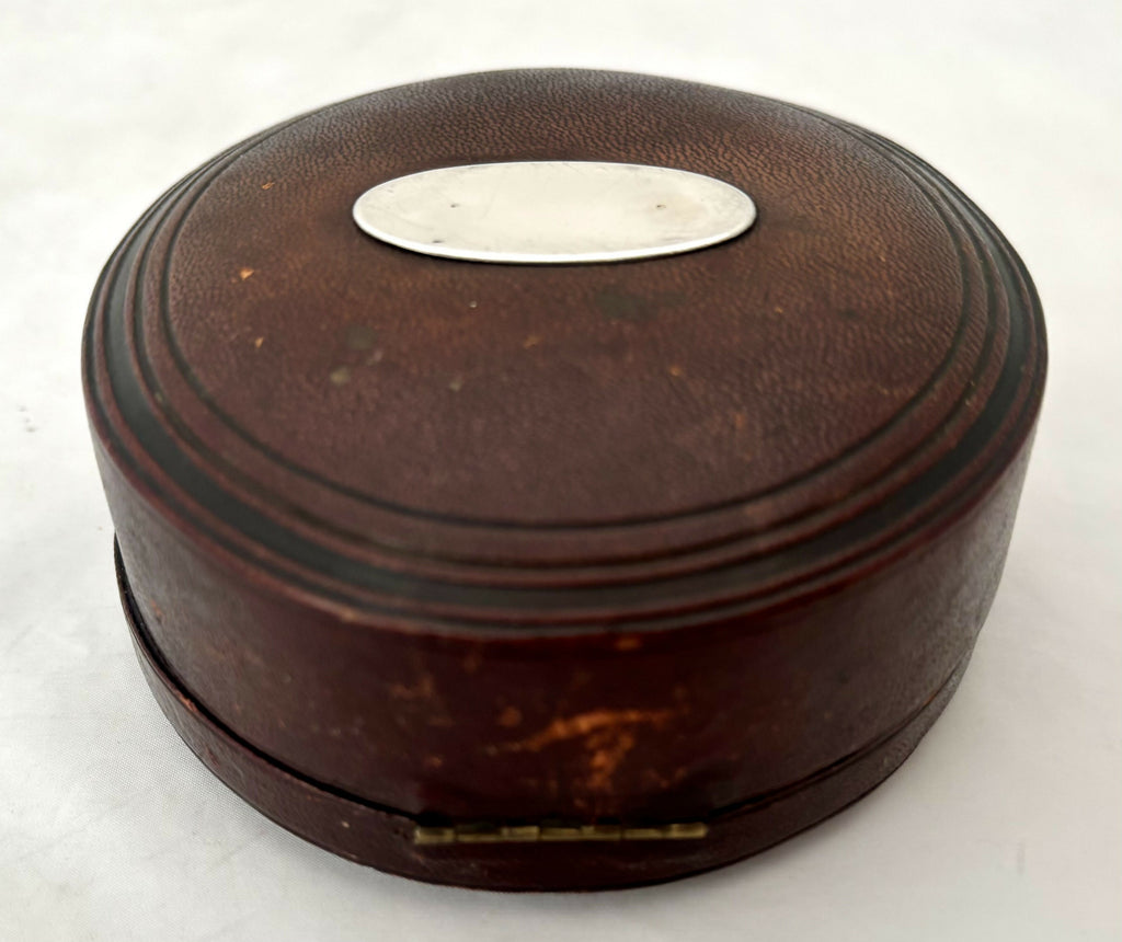 In good condition with no glass, or unmarked white metal portrait damage. The unmarked gold rim of the cover has a small crease to the side. The box has no losses and the inner rim is intact. The interior of the cover has high wear and some tearing in the area under where the portrait is. There is also some writing scratched into the cover interior. There is a small loss to the shellac style border, between the two bands of unmarked gold. This is just above the name ‘Chantrey’.