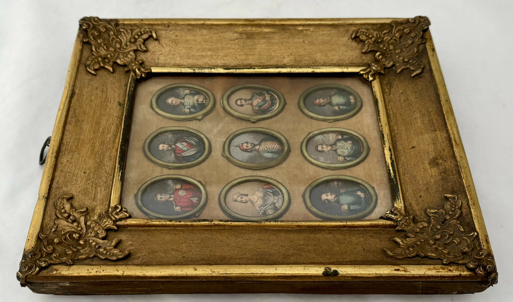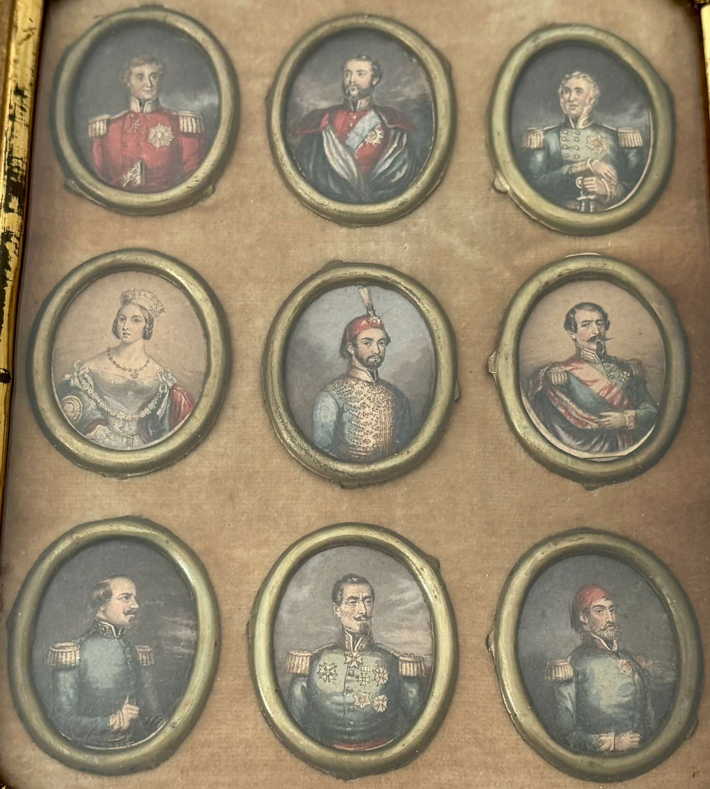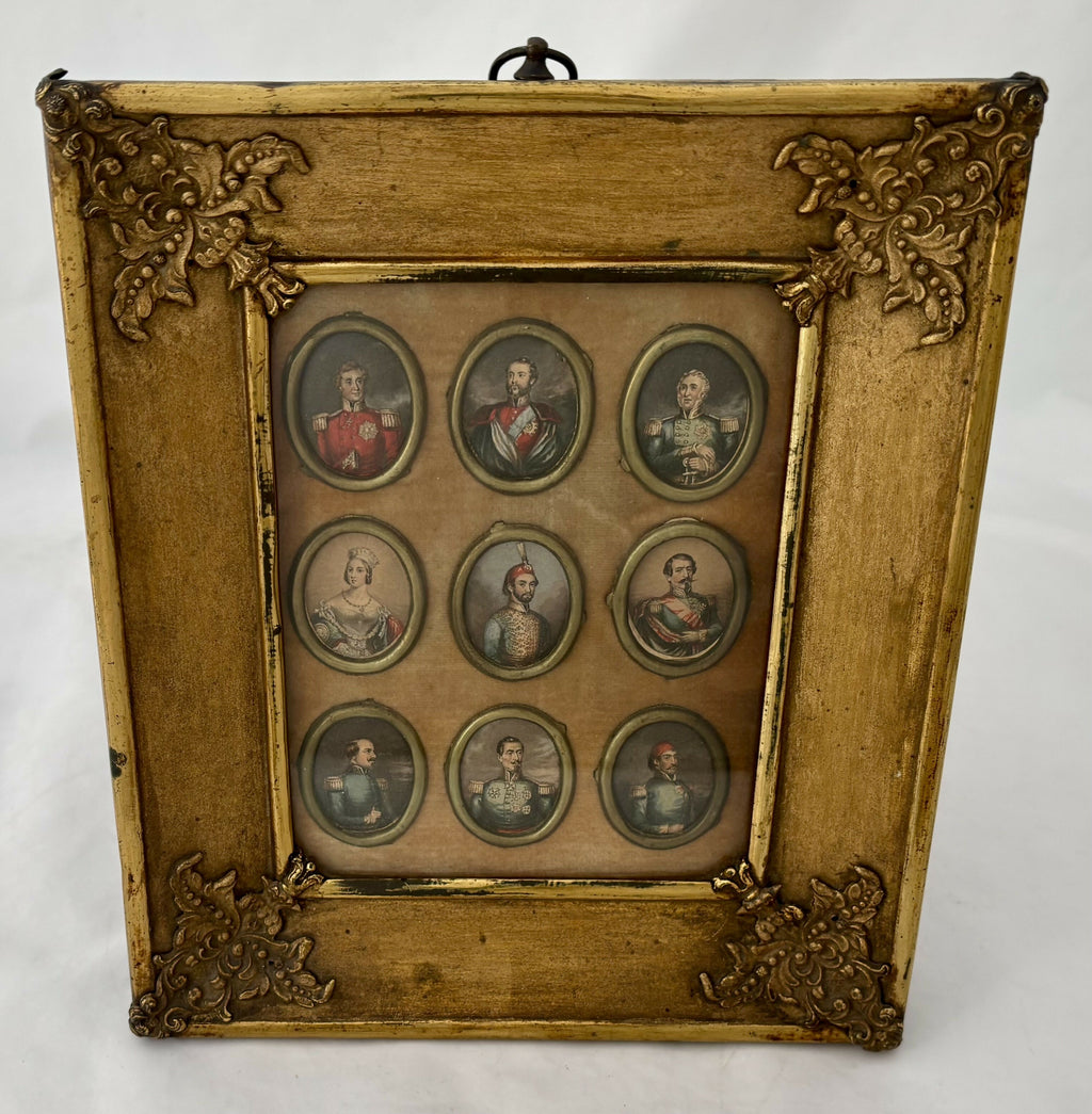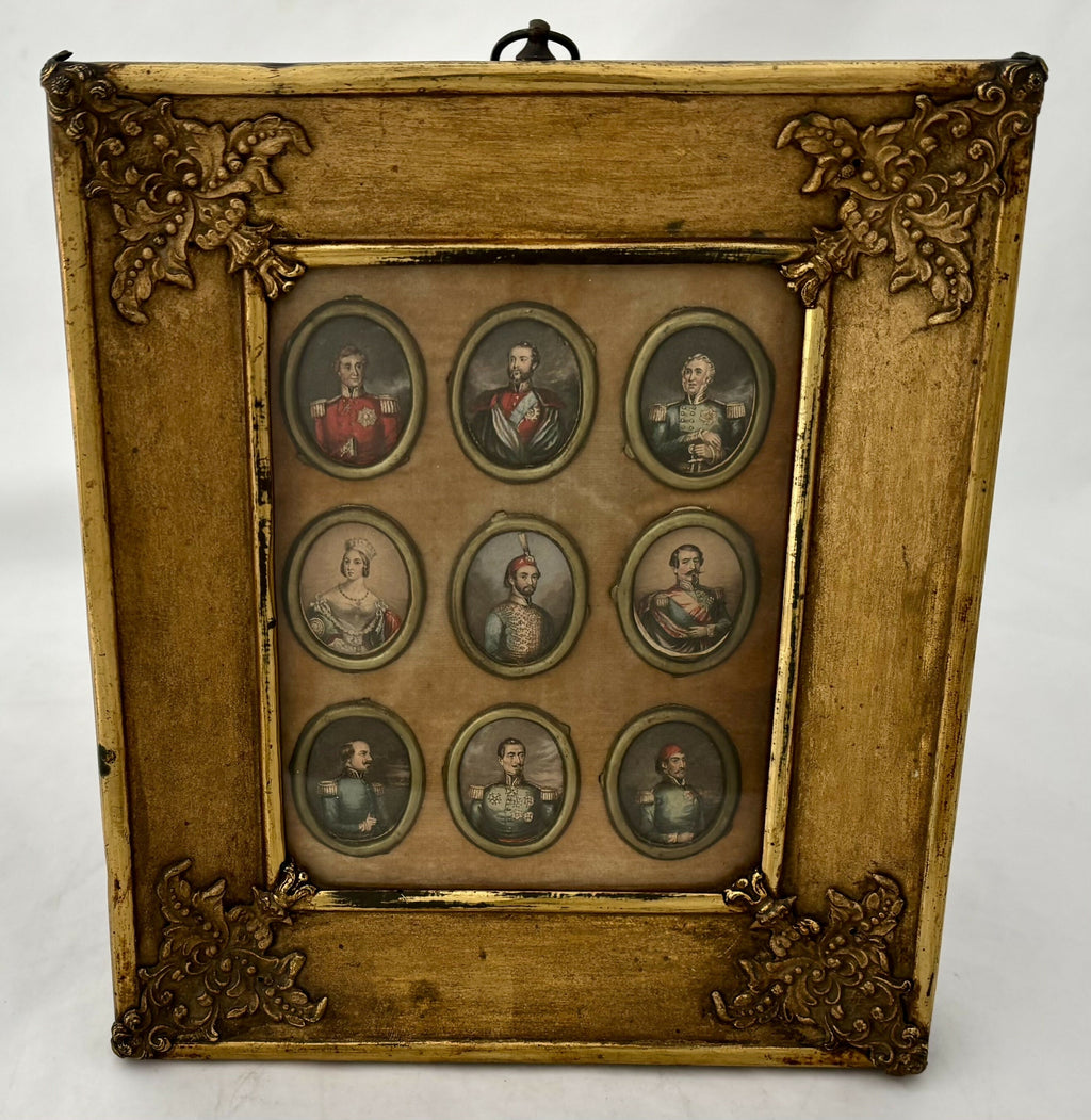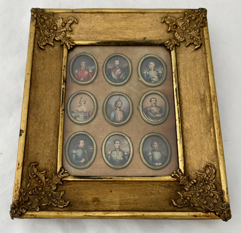 The Crimean War Allied Leaders, A Set of Nine Coloured Print Portraits, After George Baxter. The portraits are of Lord Raglan, the Duke of Cambridge, Sir Charles Napier, Queen Victoria, the Sultan of Turkey, Napoleon III, Marshal Canrobert, Marshal St Arnaud, and Omar Pasha, in Period Velvet Mount and Gilt Brass Frame.