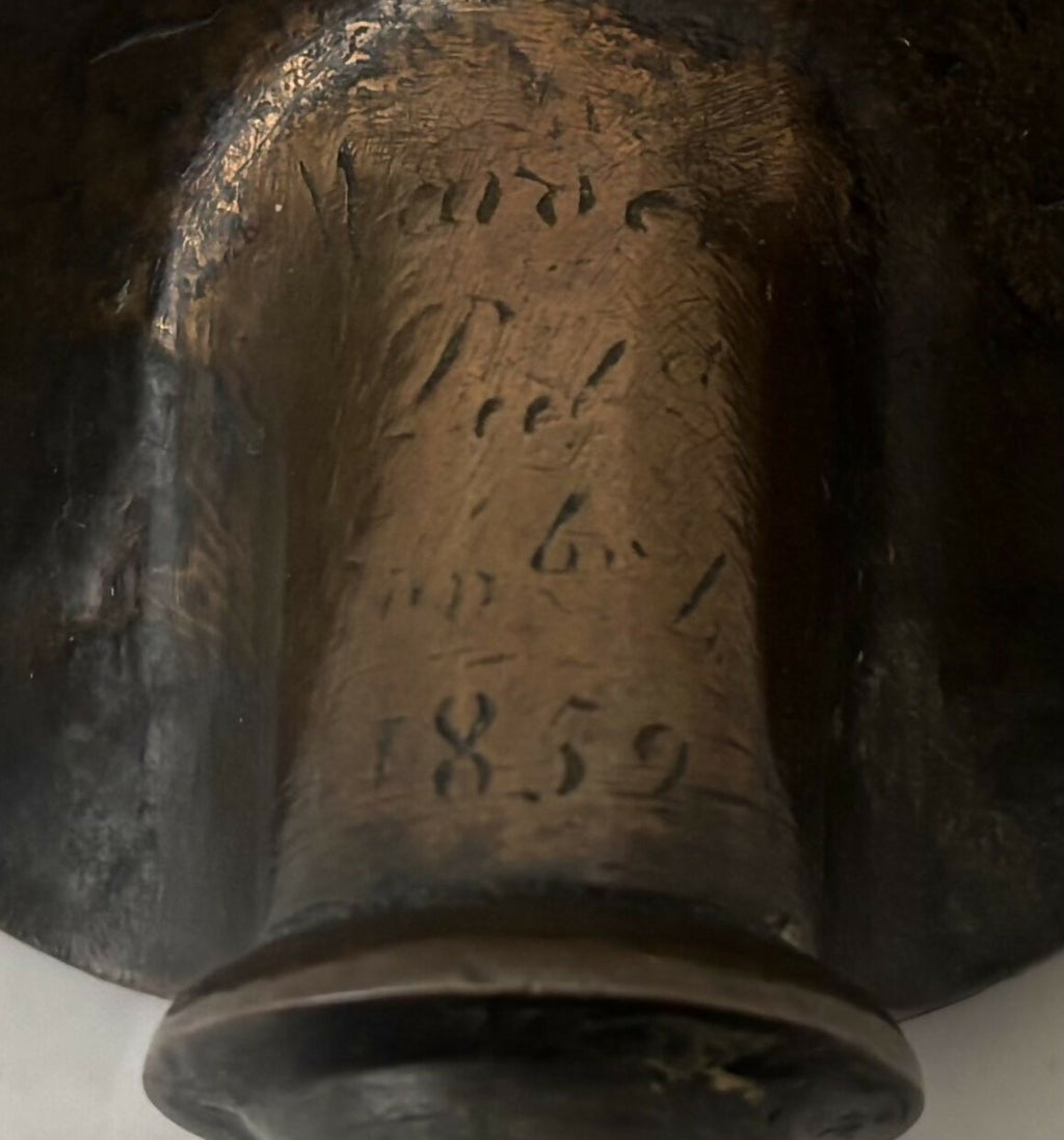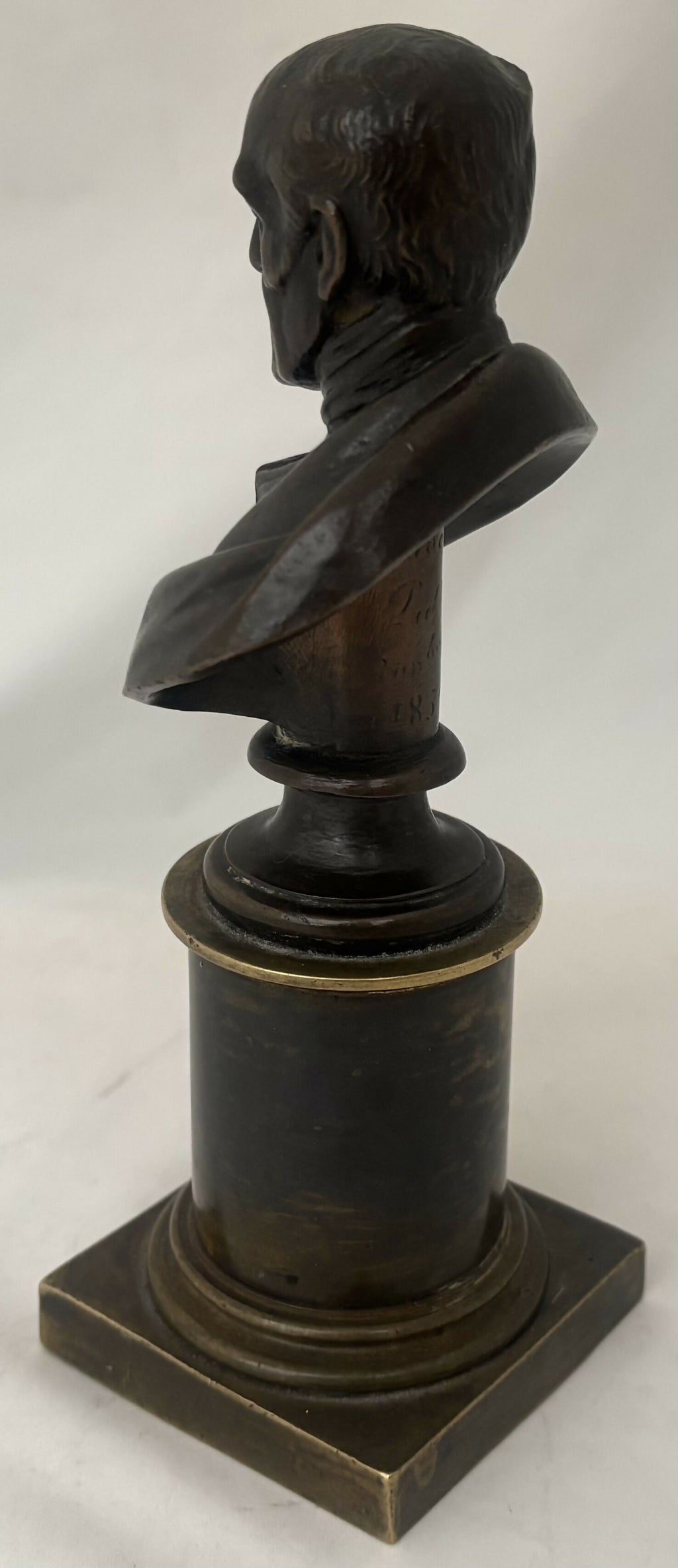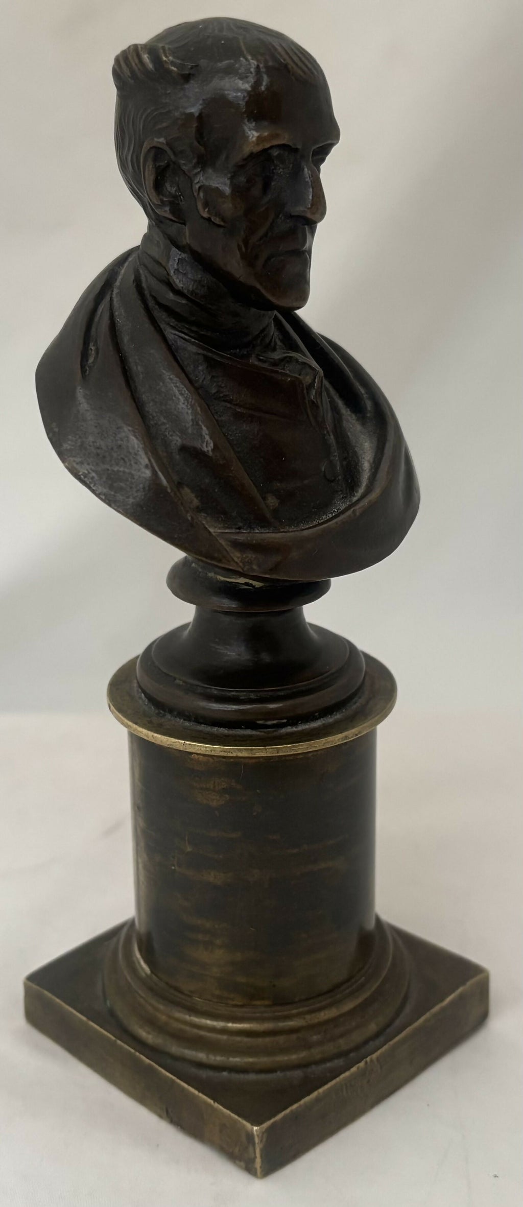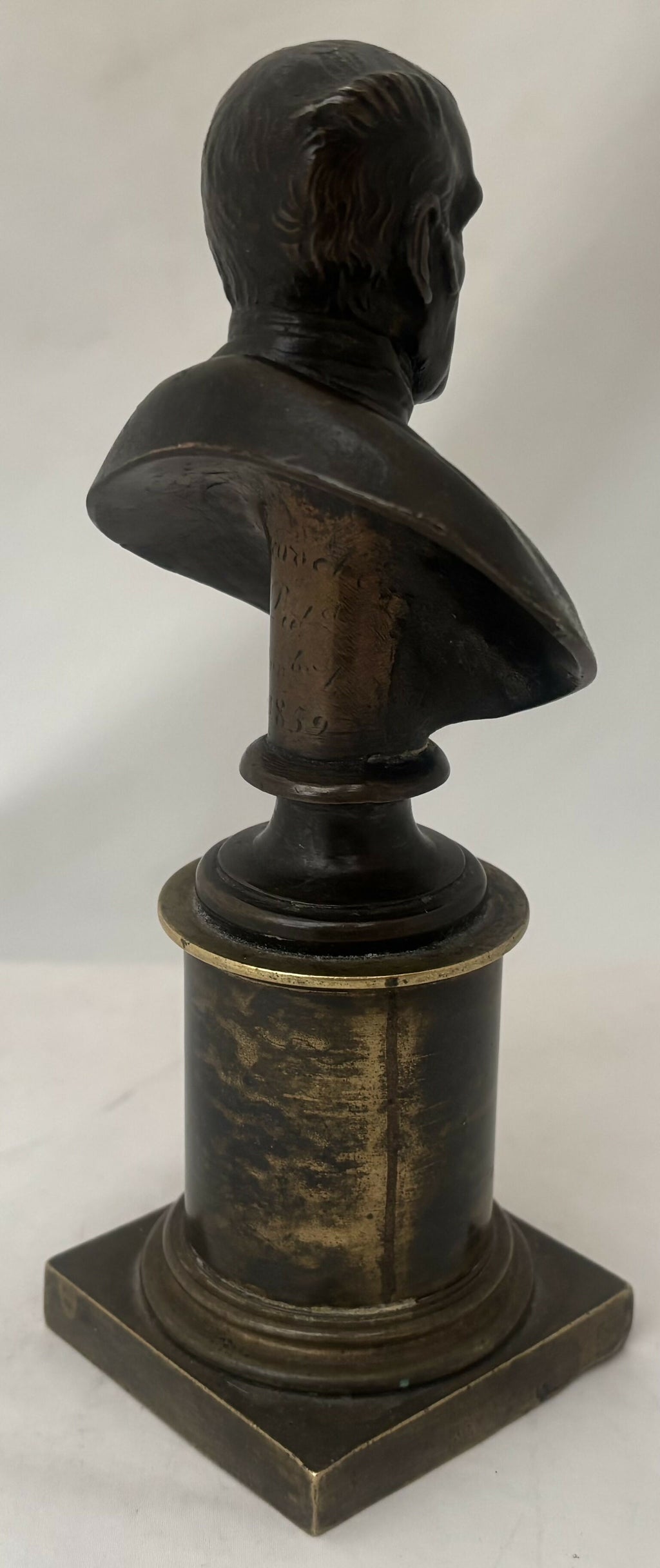In good patinated condition. The base covering and some of the base filler missing, as per the photo. The cylindrical and square base are brass, while the bust is bronze.