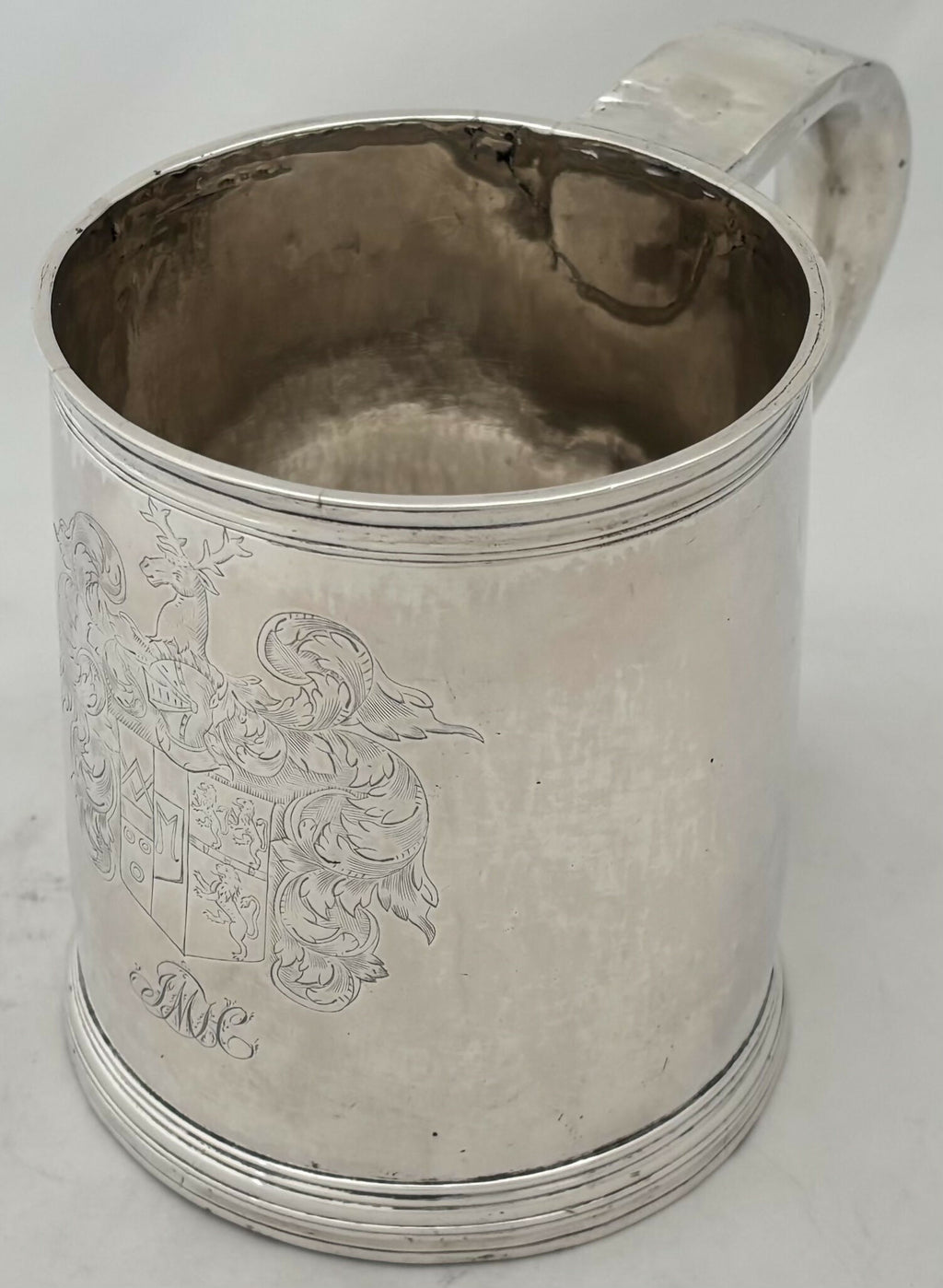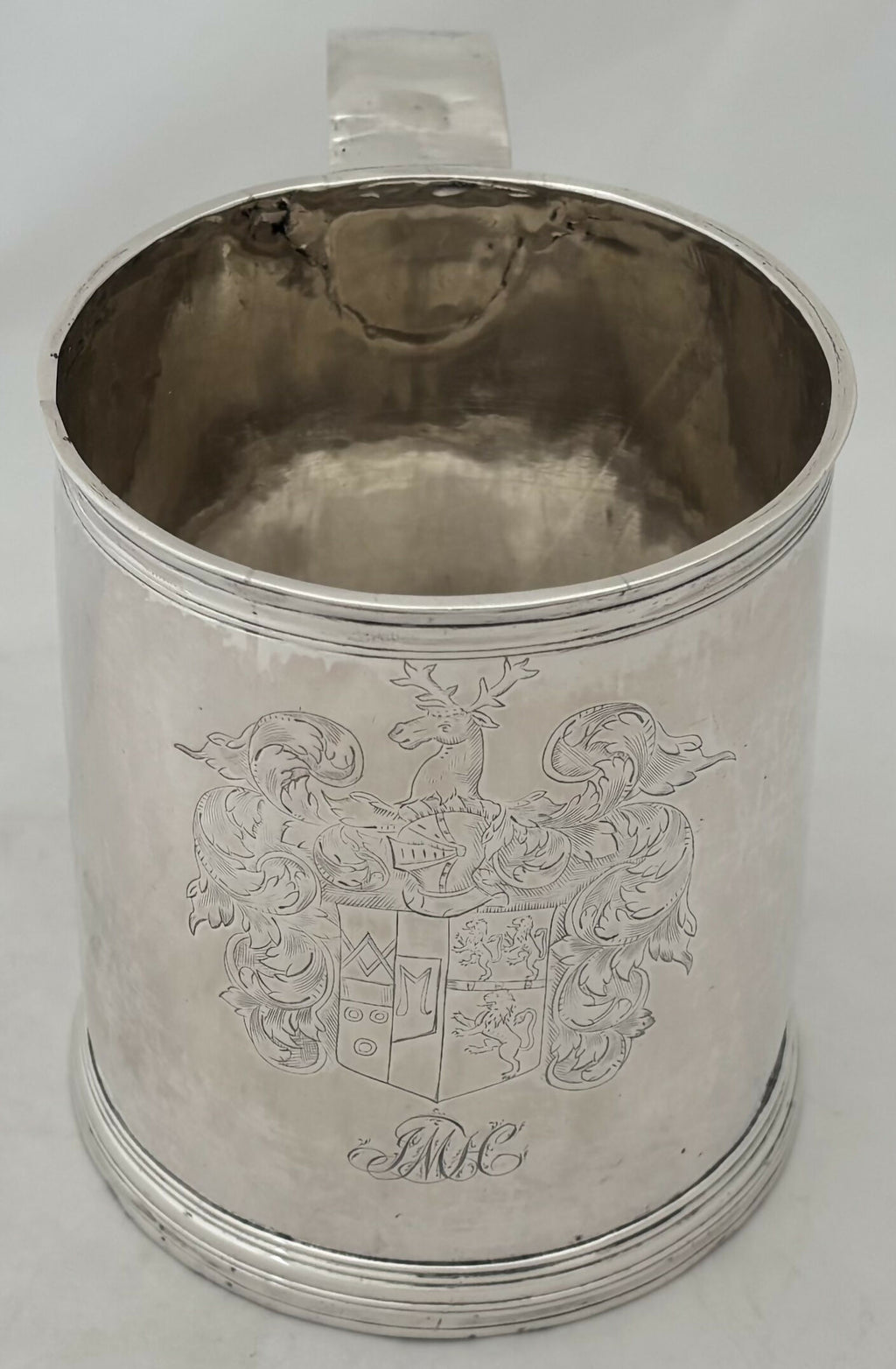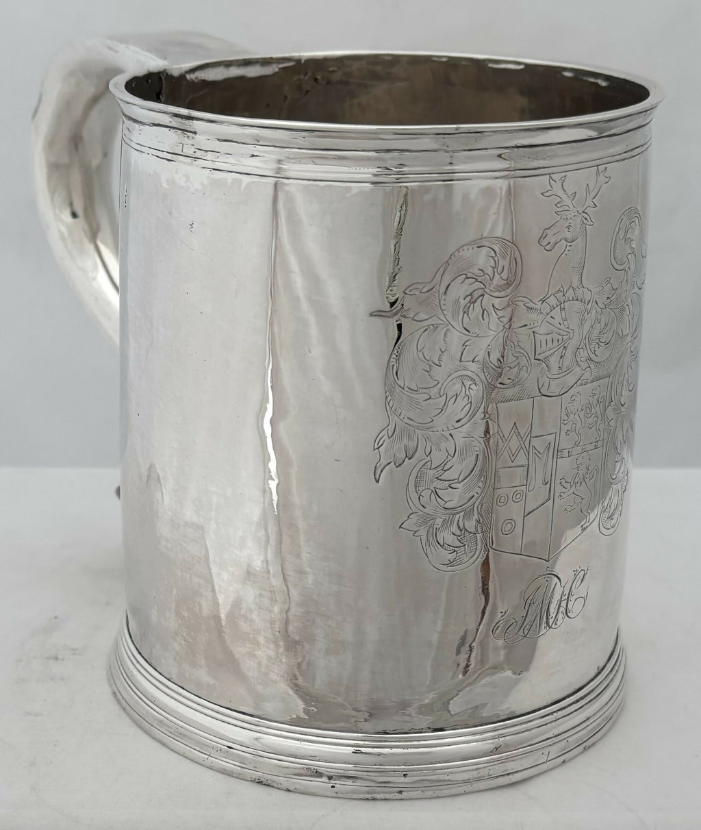 In good condition being free of any major dents and splits. Evidence of repairs and minor crushing at the handle joints. Minor denting to the handle. Hallmarks rather rubbed but still readable. Armorial and monogram clear and crisp. The tankard does not leak.