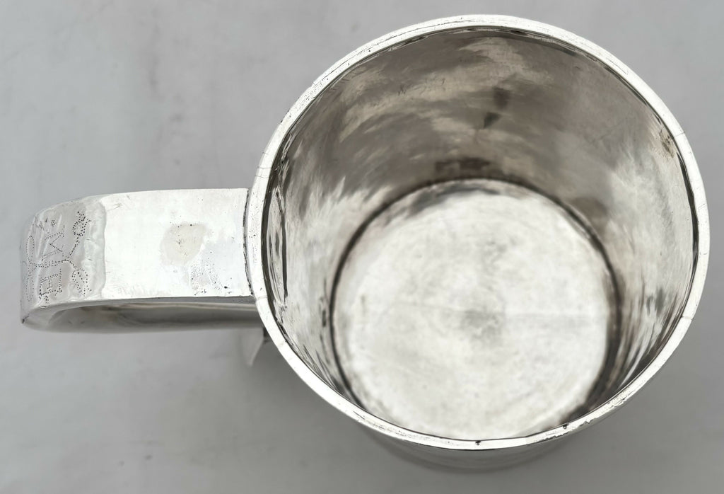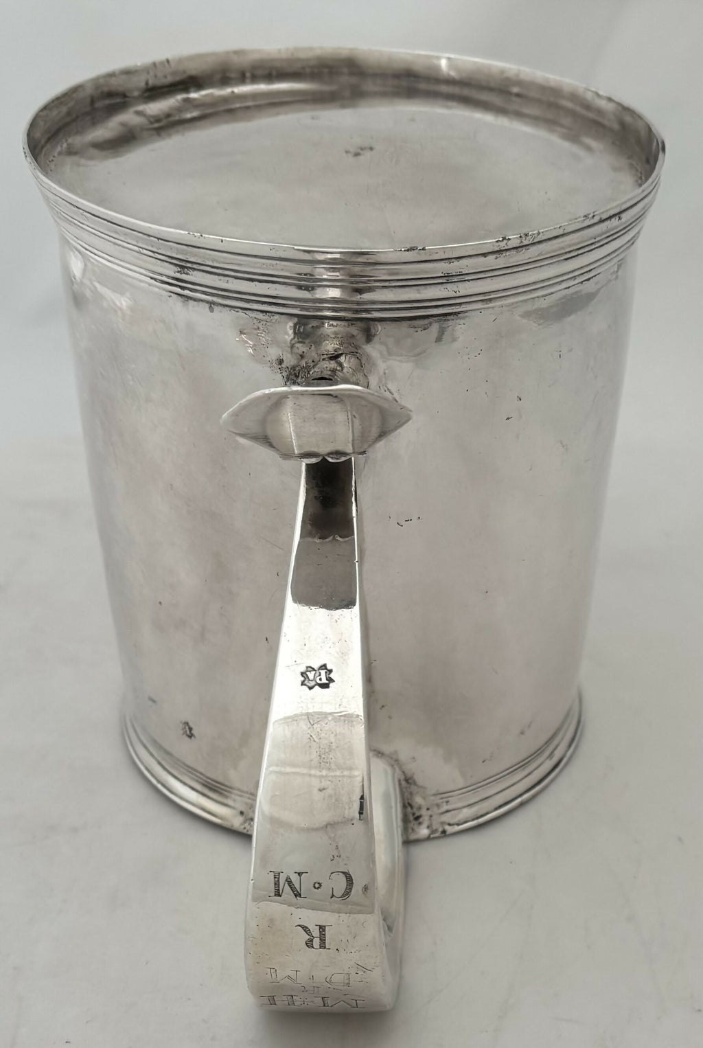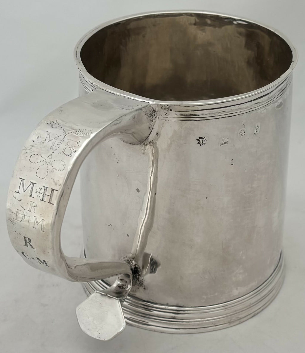 In good condition being free of any major dents and splits. Evidence of repairs and minor crushing at the handle joints. Minor denting to the handle. Hallmarks rather rubbed but still readable. Armorial and monogram clear and crisp. The tankard does not leak.