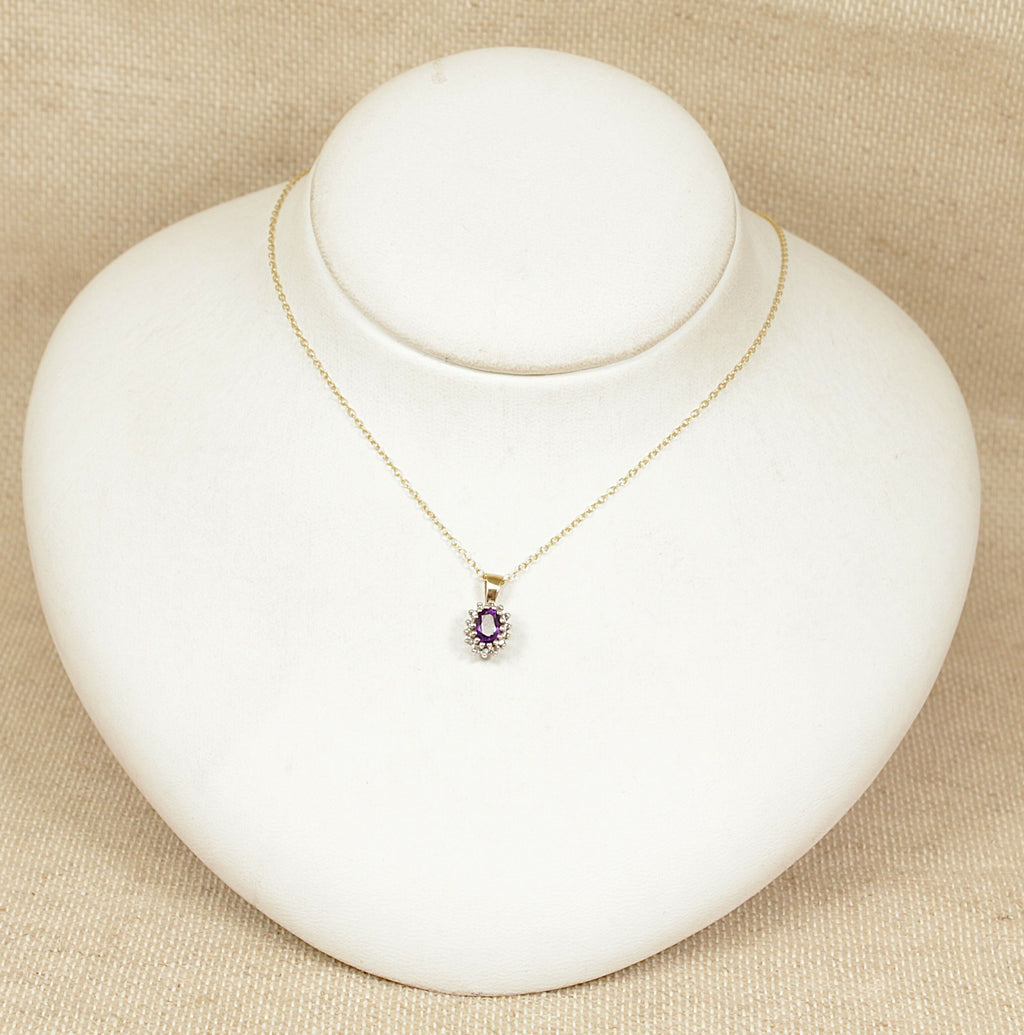 This pretty and classic 9ct Gold pendant features an oval, claw-set faceted Amethyst, beautifully highlighted by a halo of sparkling diamond accents claw set around the central stone. All gems are arranged in a traditional basket setting, allowing light to enhance their brilliance.