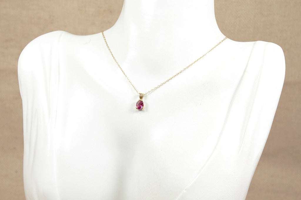 This pretty 9ct Gold pendant features a charming oval faceted Pink Tourmaline, beautifully four-claw set in a classic basket setting that allows the gemstone to catch and reflect the light.