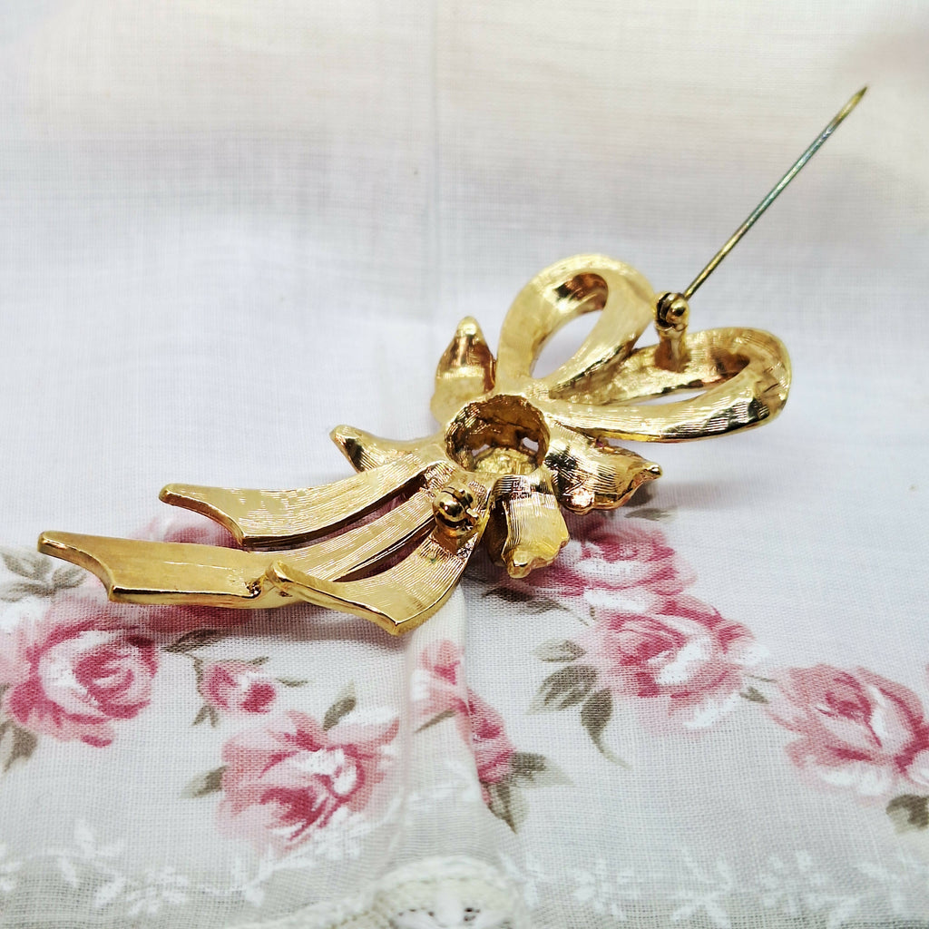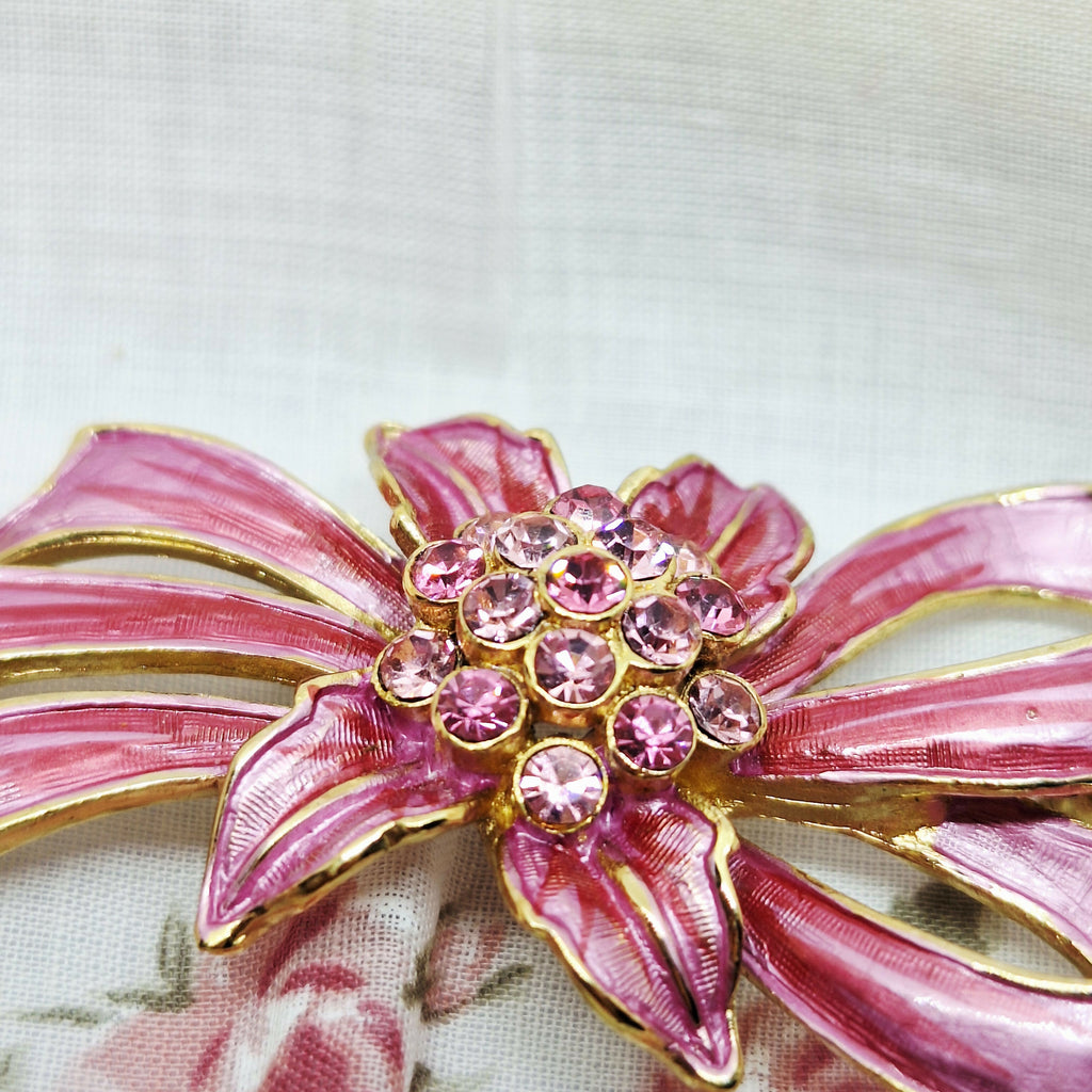 This is a wonderful vintage-style pink floral bow brooch. It combines a classic ribbon bow motif with a central flower. It has pink enamel work on the petals and ribbons within the gold-tone frame.The centre of the flower is clustered with small faux diamonds to give it some sparkle.