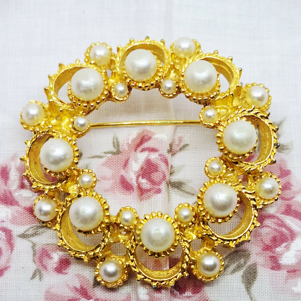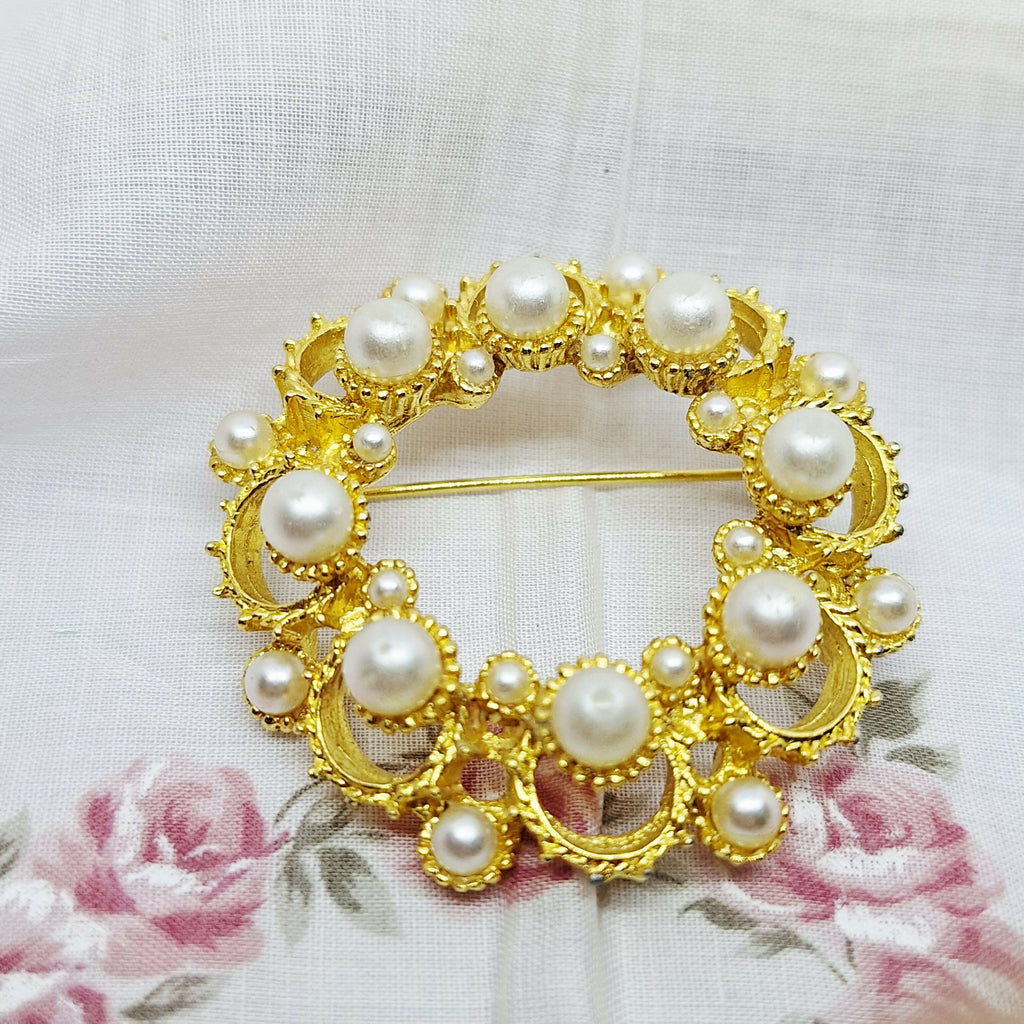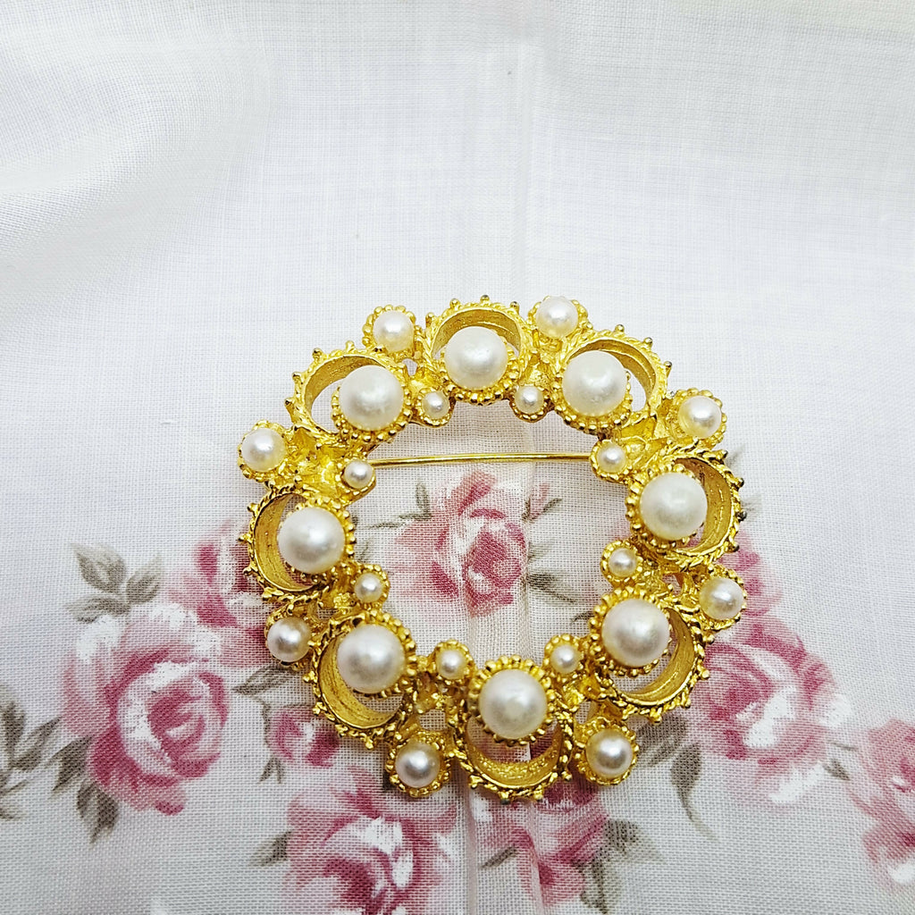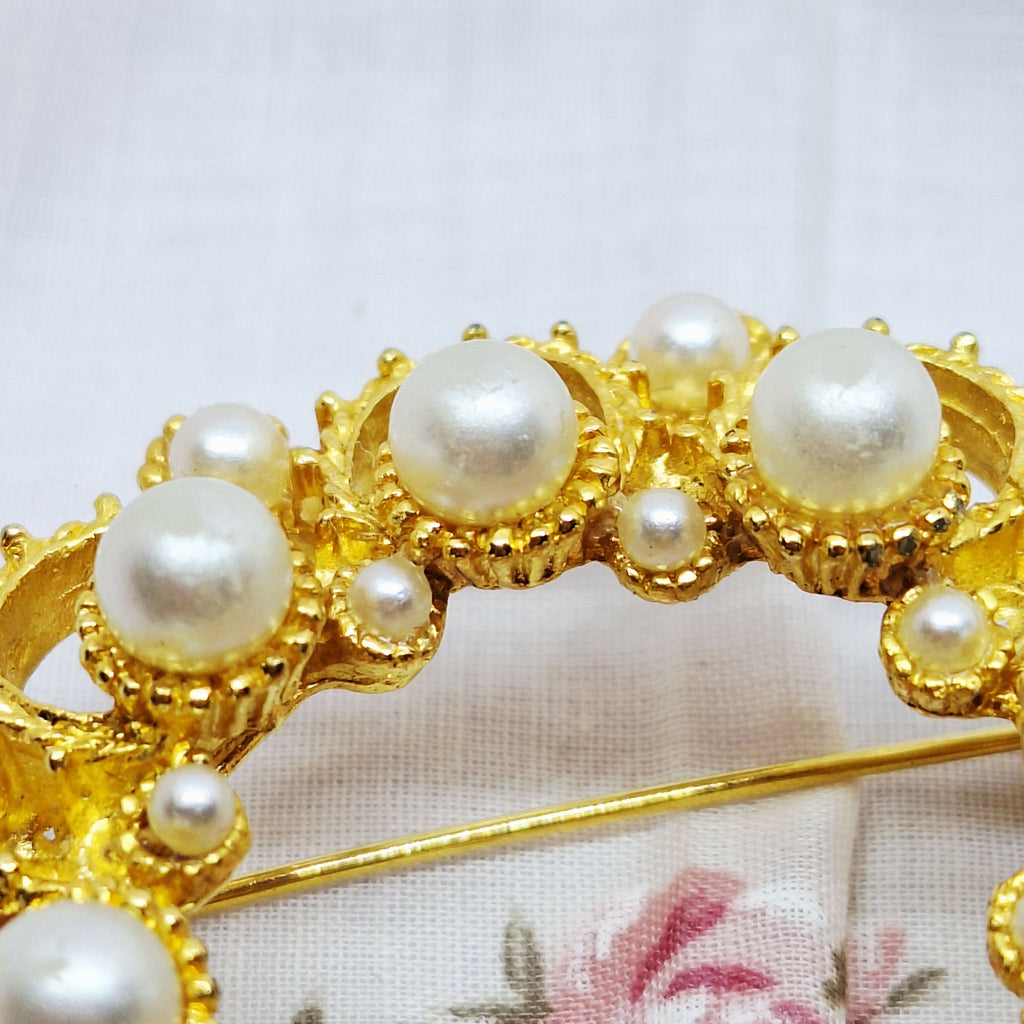 Vintage Gold Tone & Faux Pearl Brooch