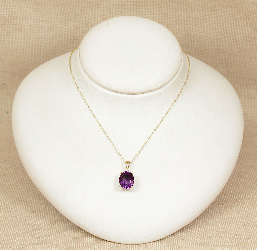 This bold and classic 9ct Gold Amethyst solitaire pendant is a striking and elegant piece. The pendant features a large faceted deep purple Amethyst, set in a four-claw basket setting that beautifully showcases the depth and colour of the gemstone.