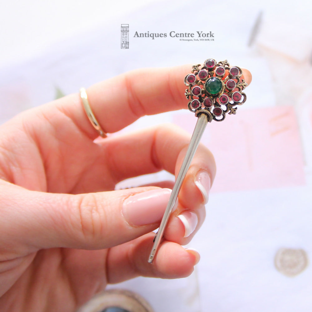 The brooch also known as an aigrette is crafted in silver and has a cluster at the top set with a central chrysophrase with a surround of garnets. Possibly the brooch was gilded originally but we have left untouched. The cluster measures 25mm in diameter and overall the brooch measures 75mm long. Weight 8.5g.