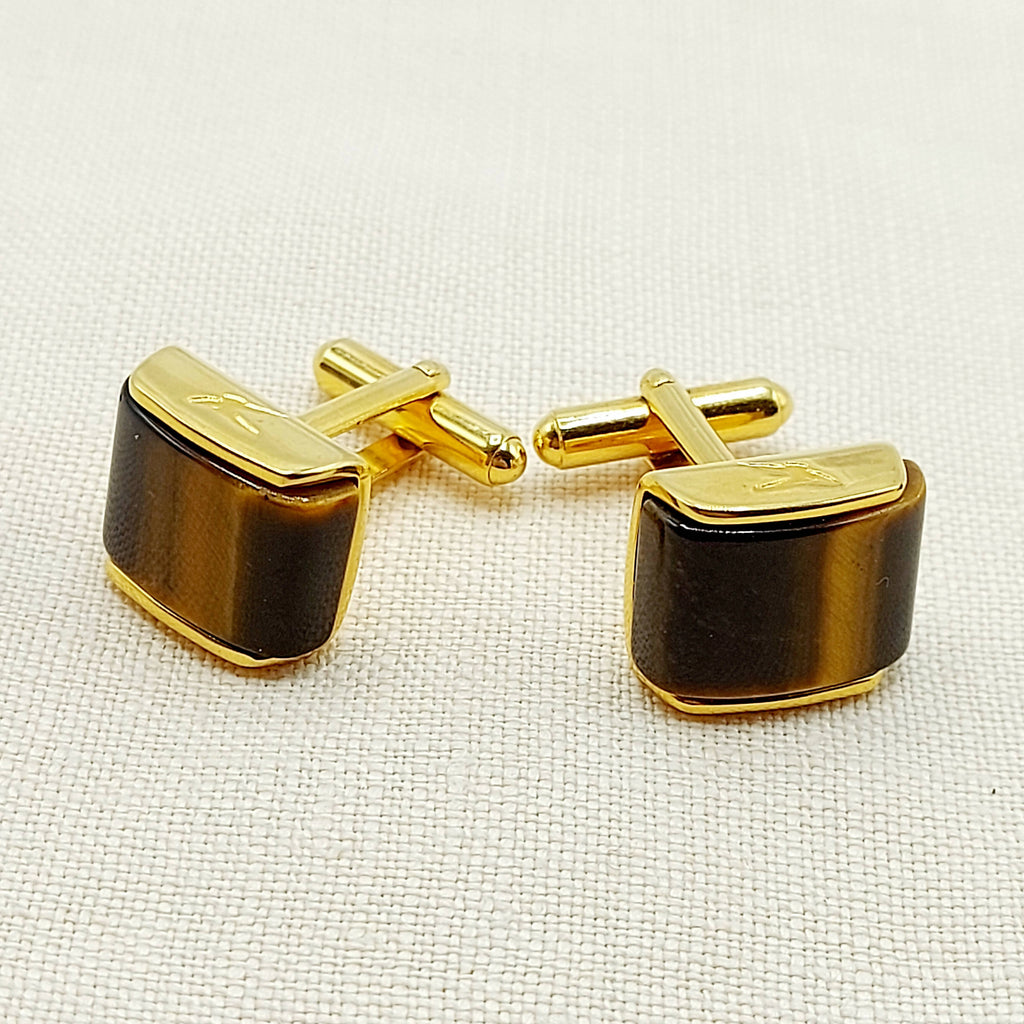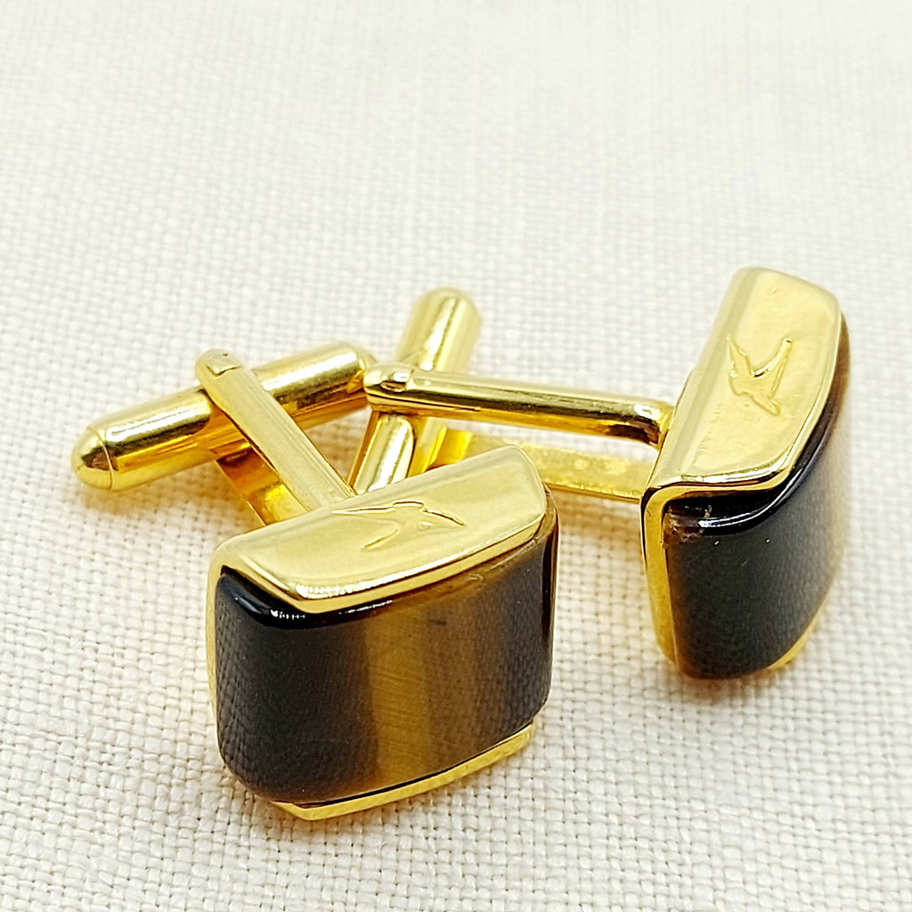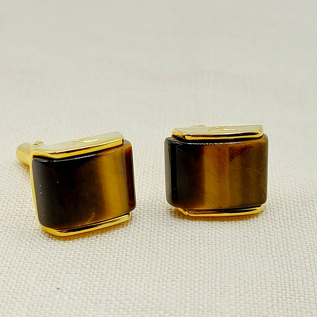 A delightful pair of vintage Springbok Tiger's Eye Agate, gold plated cufflinks. They come in their original box with the Springbok logo on top. The logo is also imprinted on each cufflink.