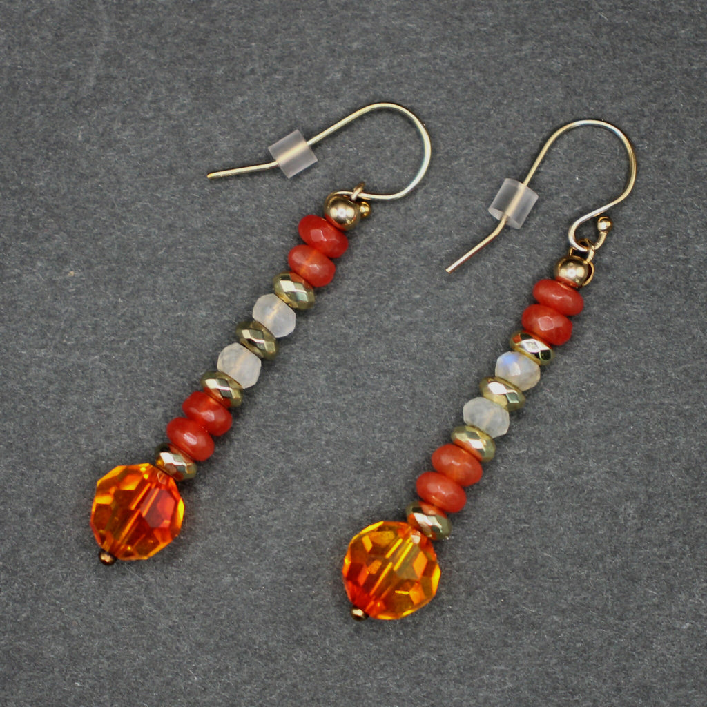 These new earrings are formed from faceted real Citrine stones, alongside 8mm Austrian aaa fire opal crystals and gold plated hematite spacer beads, mounted on 14ct gold filled findings. The earrings were designed and made by NE England self-taught designer Bridget.