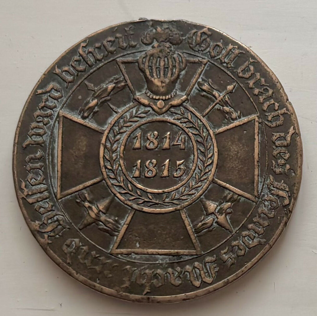 German Medal, Made from French Cannon Captured During the Napoleonic Campaigns of 1814 and 1815. Issued in 1821 by Elector Wilhelm II. The medal was awarded to all combatants who fought and crossed the Rhine in 1814 and 1815.