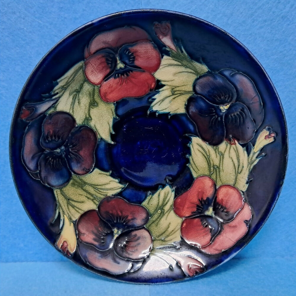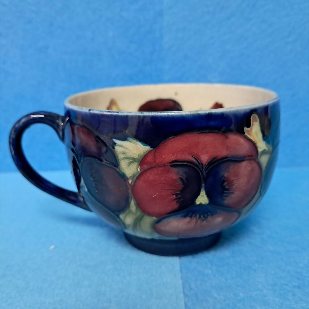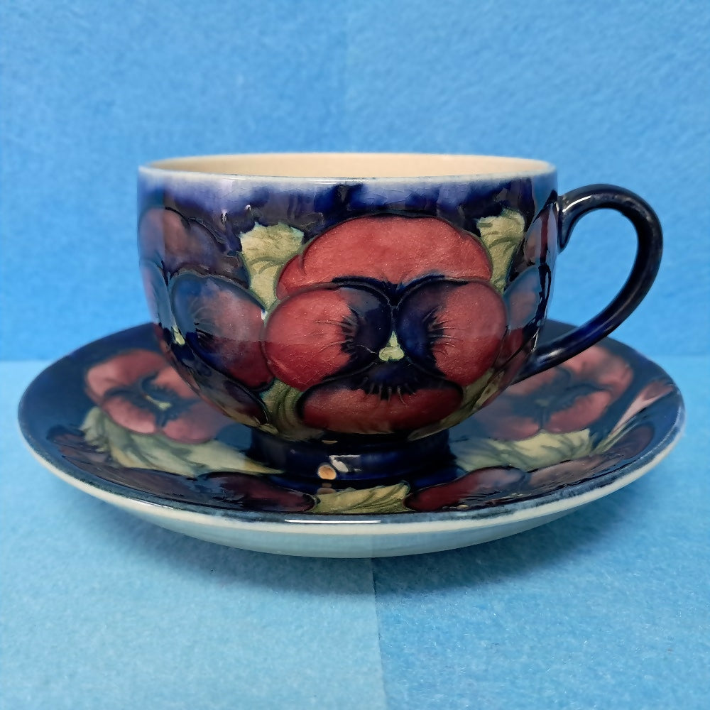 A Moorcroft Cup and Saucer in the Pansy Pattern by William Moorcroft