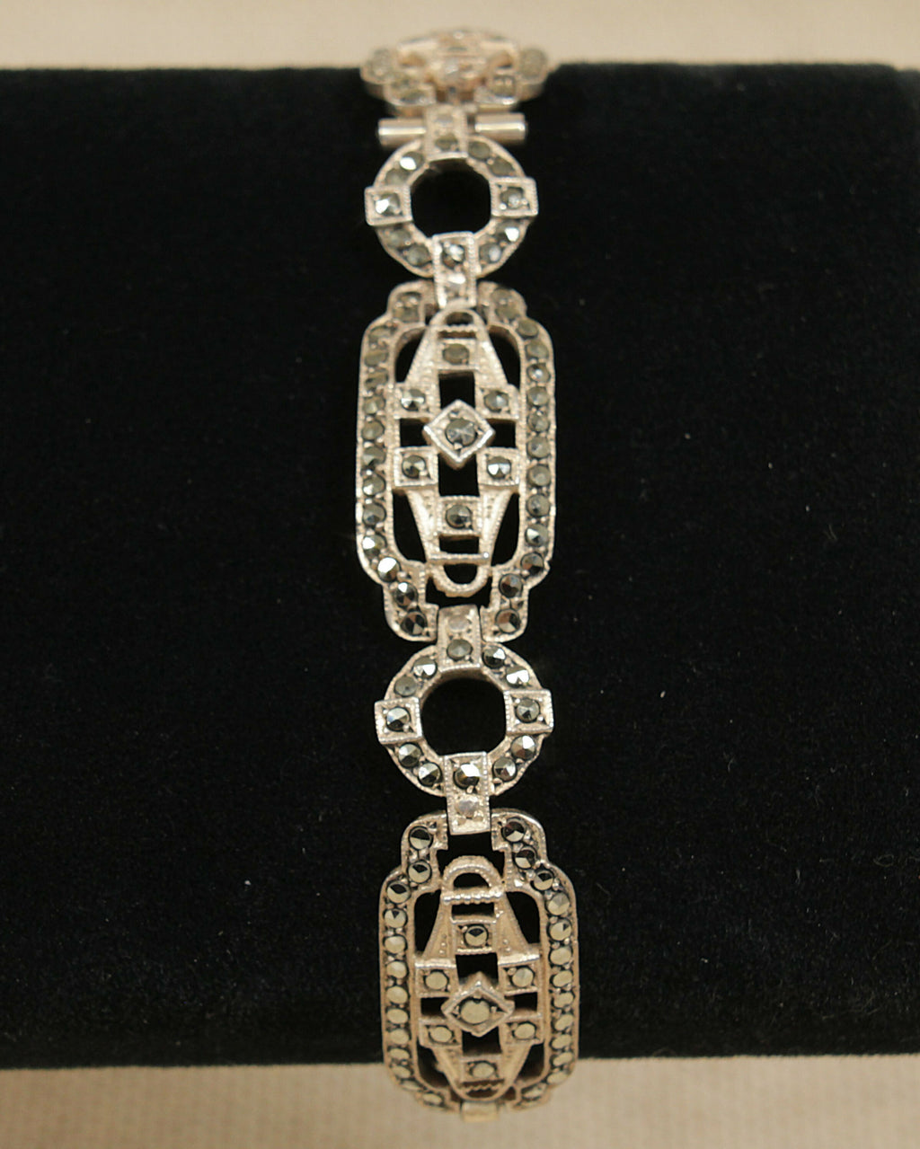 The bracelet is composed of five rectangular links, each featuring open silverwork with a strong symmetrical Art Deco design, all richly encrusted with sparkling marcasite. Between each rectangular panel is a round openwork link, also fully set with marcasite, creating a striking rhythm and elegant flow along the bracelet.