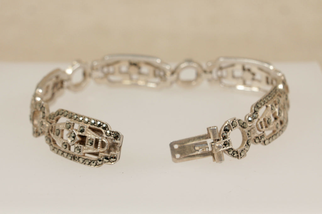 This stunning Art Deco Silver and marcasite bracelet is a beautifully preserved example of early 20th-century European jewellery. It is stamped 935, a higher silver content often referred to as Argentium-style silver, commonly found in antique European pieces from circa 1910–1940.